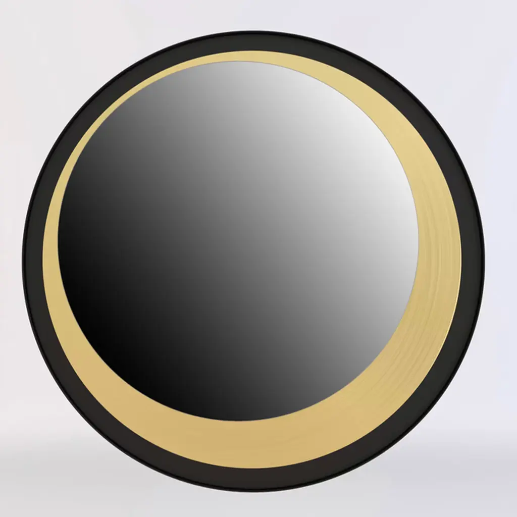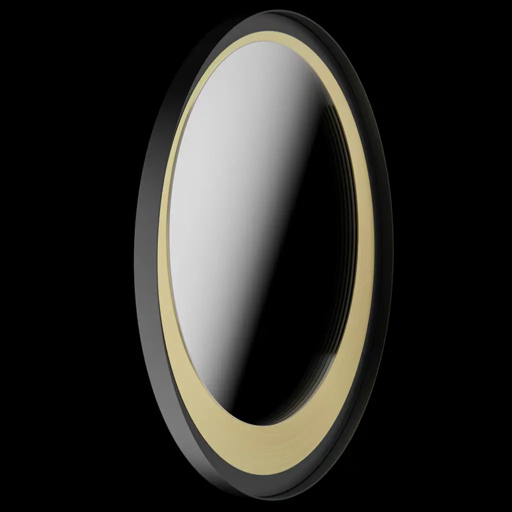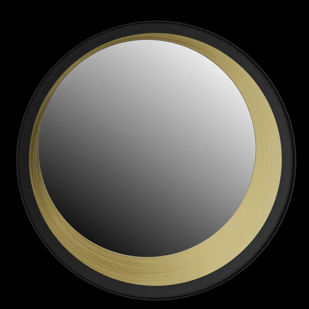 In this elegant wall mirror, a single round metal sheet finished in black frames a second round metal insert that contains the mirror. This striking overlap results in an iconic design that can be displayed in four different ways, thanks to the four hanging points on the back of the mirror.