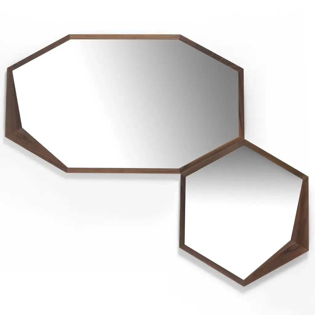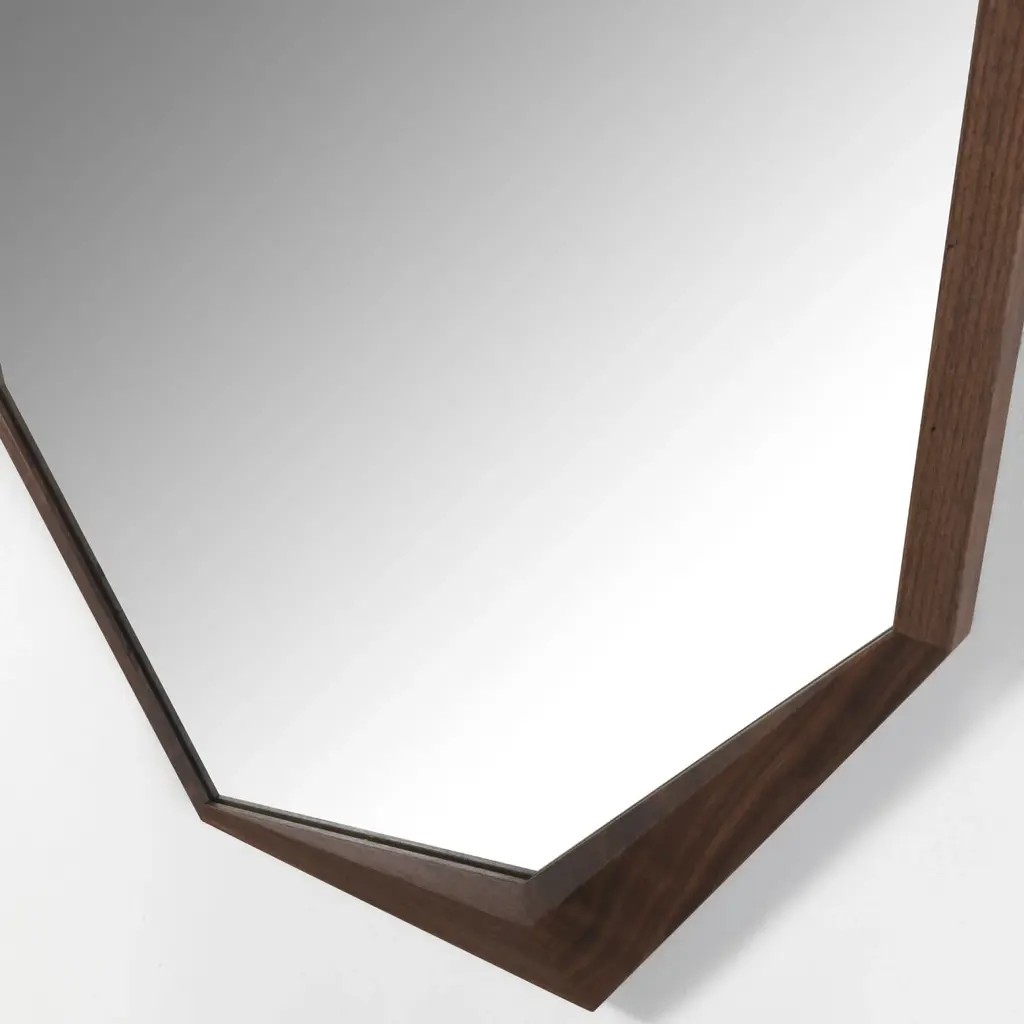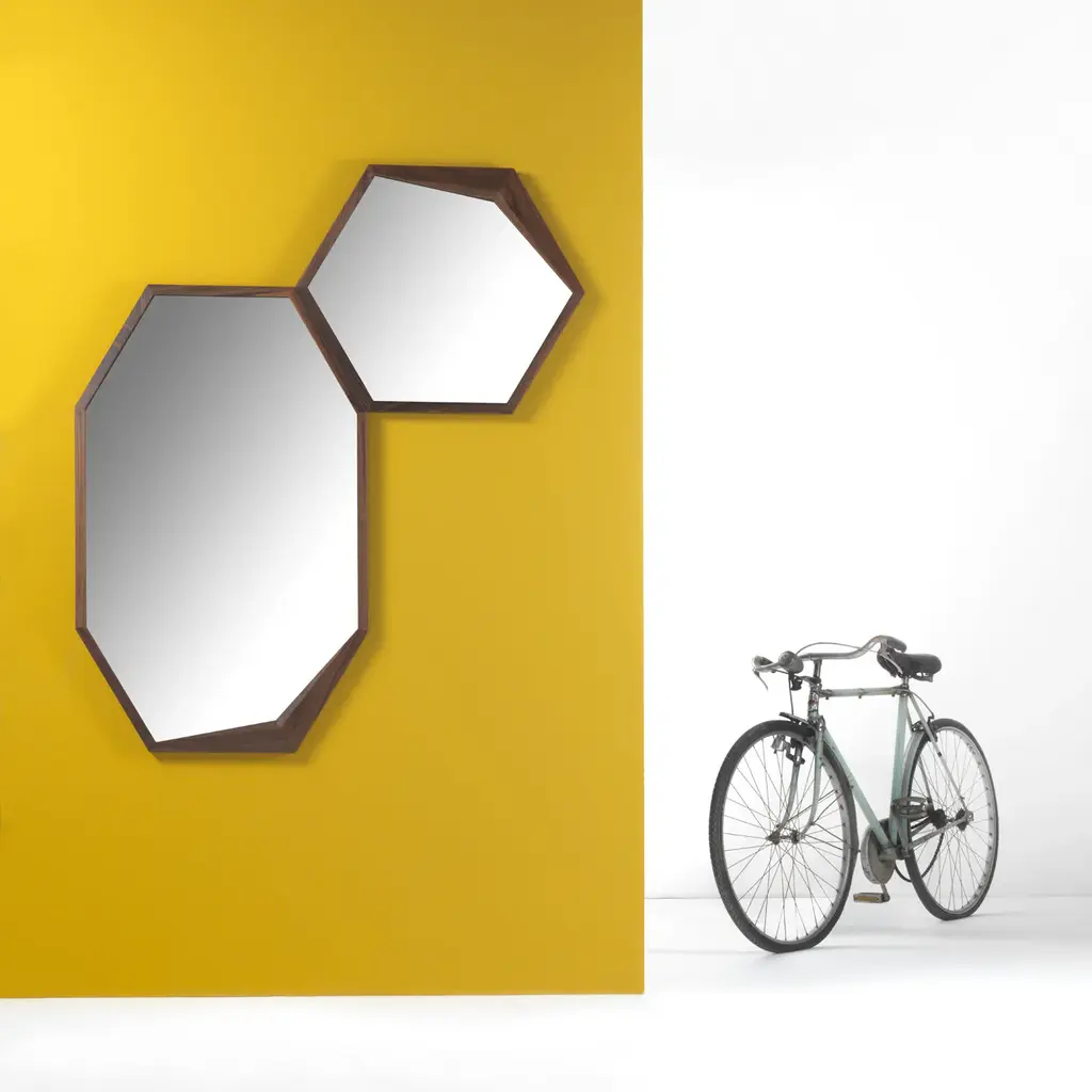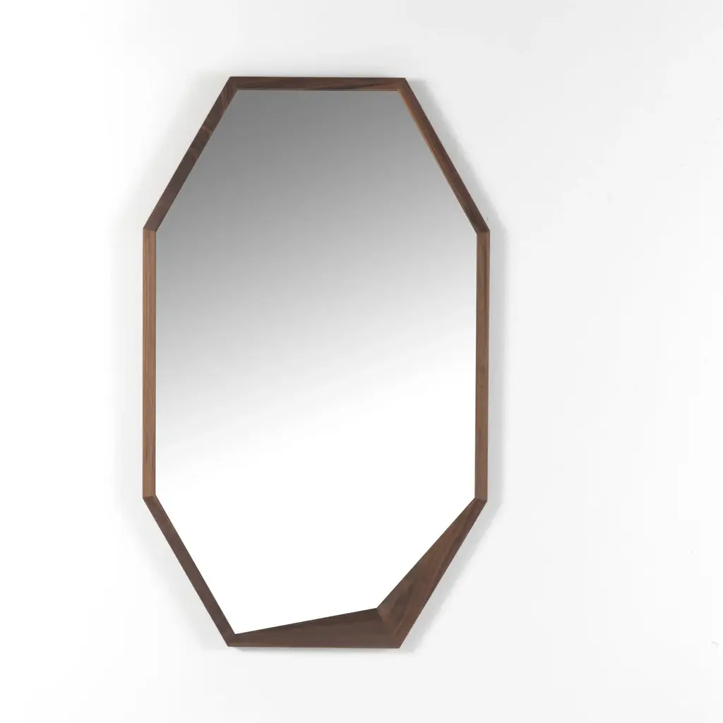 This sophisticated mirror has a minimalist silhouette that is elegant and timeless. Its frame is in solid canaletto walnut with a charming, irregular detail adorning one of the corners of its elongated hexagonal shape. A piece suitable for any decor, this mirror will be a splendid addition to an entryway, a living room, or a bedroom. Its wood can be substituted with solid durmast oak. Please contact the concierge to see if this change in material affects the price of the item.