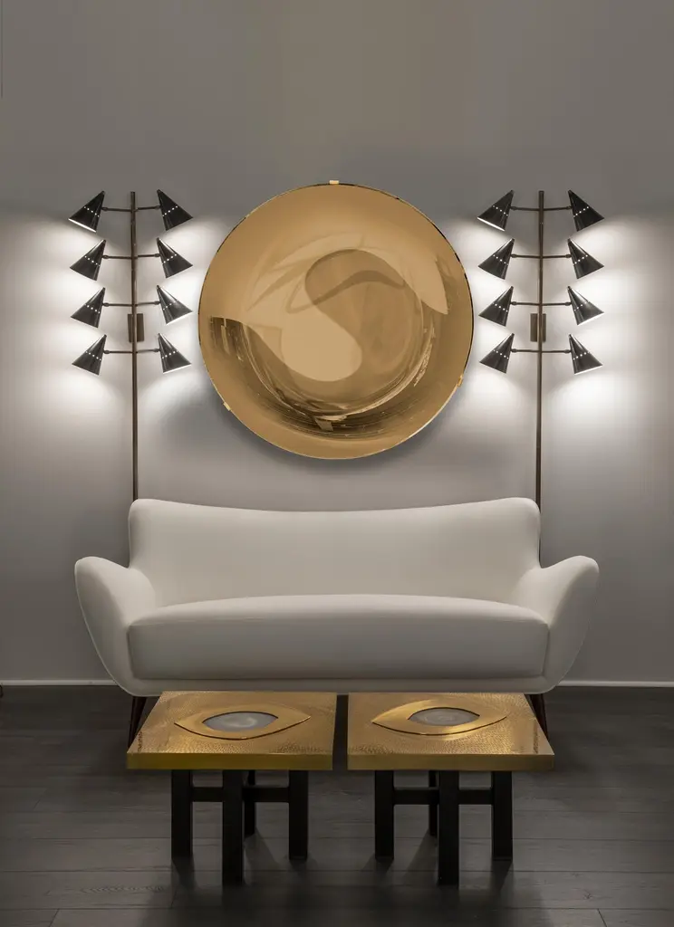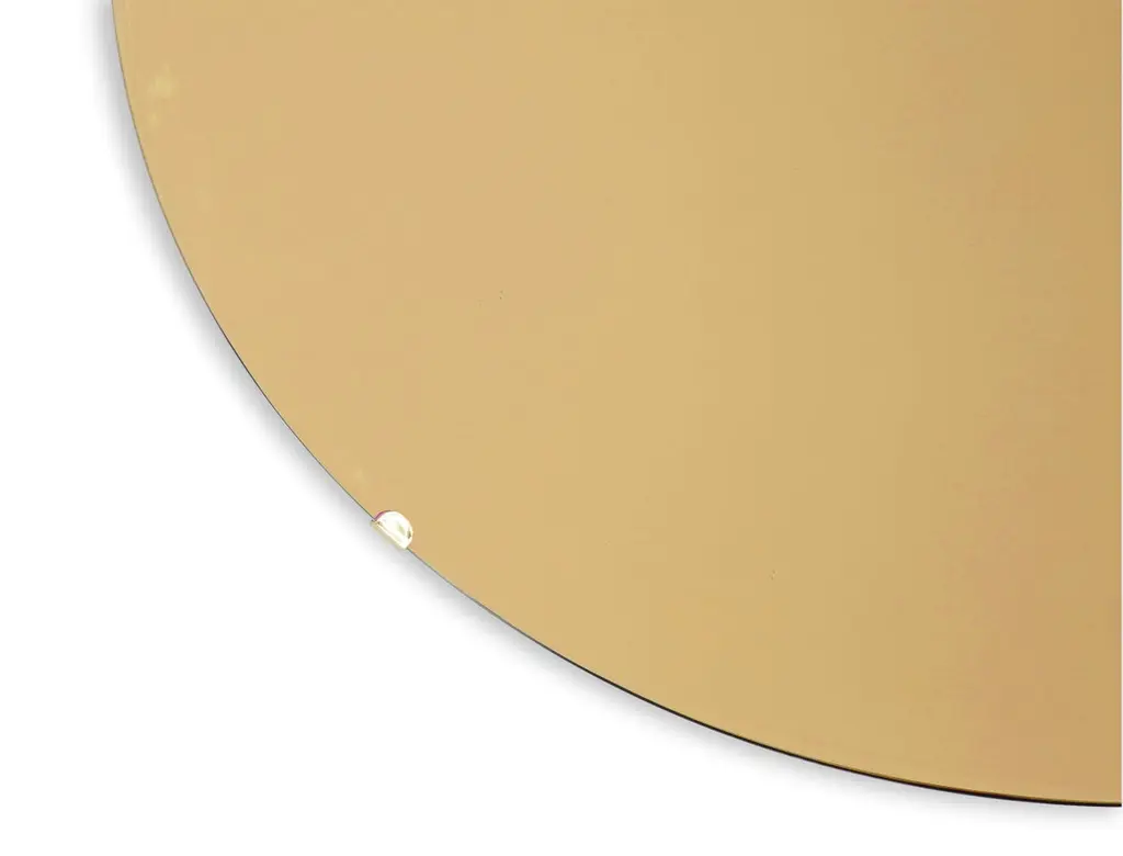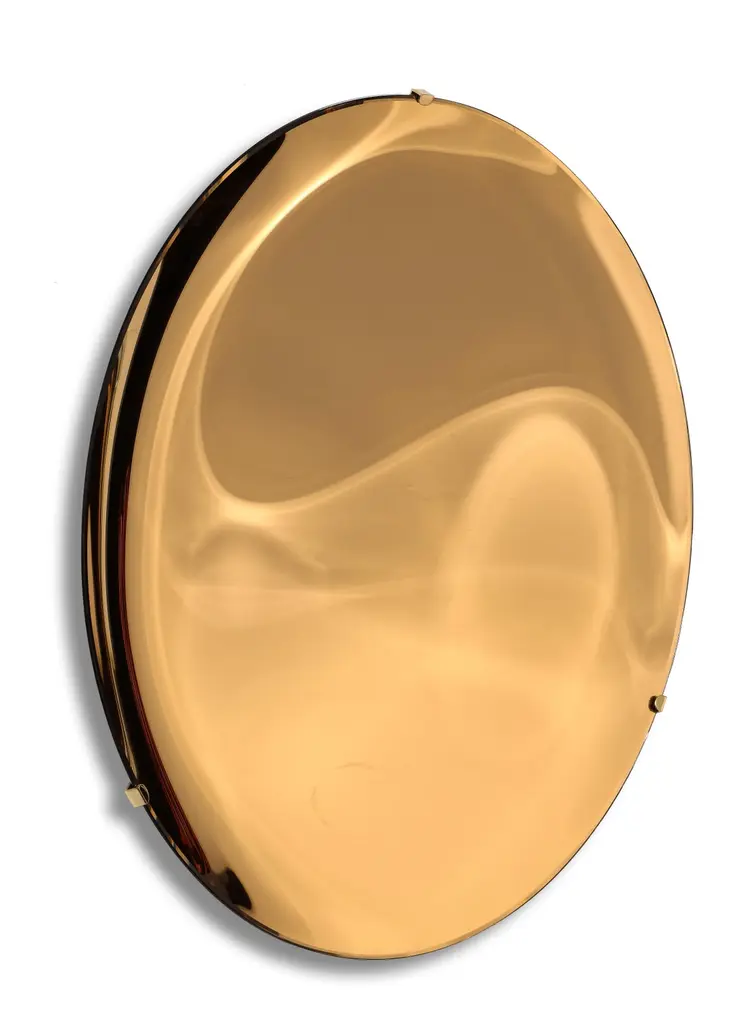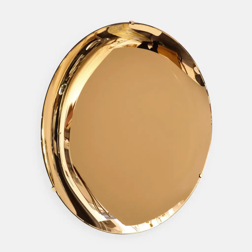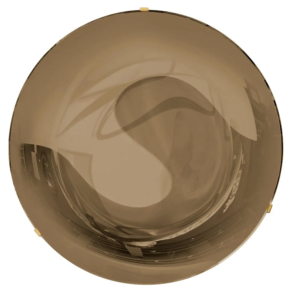 Effetto Vetro contemporary large round concave colored mirrored glass in amber mounted on a polished brass structure on the back with three mounting clips on the front edges, 2024. This exquisite artisan mirror is handmade and hand silvered in Italy - a sculptural work of art, grand and impressive in scale and and comes in a variety of vintage glass colors from the 1950s. Since each mirror is meticulously hand-crafted including silvering, there are subtle variations inherent in the handmade process. This particular amber color is chic and stunning - a rich gold-colored glass which makes quite a statement piece. Depending on the different angles it's viewed from, the reflections change because of its concave shape. Signed "Effetto Vetro" on metal plaque attached to brass structure on underside. Comes in a variety of vintage glass colors including rose, amber, bronze, green, azure, aquamarine, China blue, cobalt blue, gray and black.Custom sizes available in all colors. Lead time for custom orders is 4-6 weeks.Prices will be subject to change for 2025 production of this amber mirror.After years of training in several Italian artisan glass workshops, Maurizio Foddis (born 1975) and Andrea Baisi (born 1976) founded Effetto Vetro in 2014, an artisan glass atelier specializing in handcrafted furniture, lighting, and mirrors using cut glass and crystal. Through their continuous research, Foddis and Baisi have amassed an important and extensive archive of carefully selected materials, including special types of glass and mirrors that are no longer in production. Using their vast experience and experimentation with technical innovations in glass and mirror production, Effetto Vetro presents a sophisticated and unique collection of decorative arts using an exquisite range of modern and historical opaline glass colors always maintaining a handcrafted expertise. Effetto Vetro is well established and collaborates with a number of international galleries as well as to be represented at top art and design fairs in Paris, London and New York.