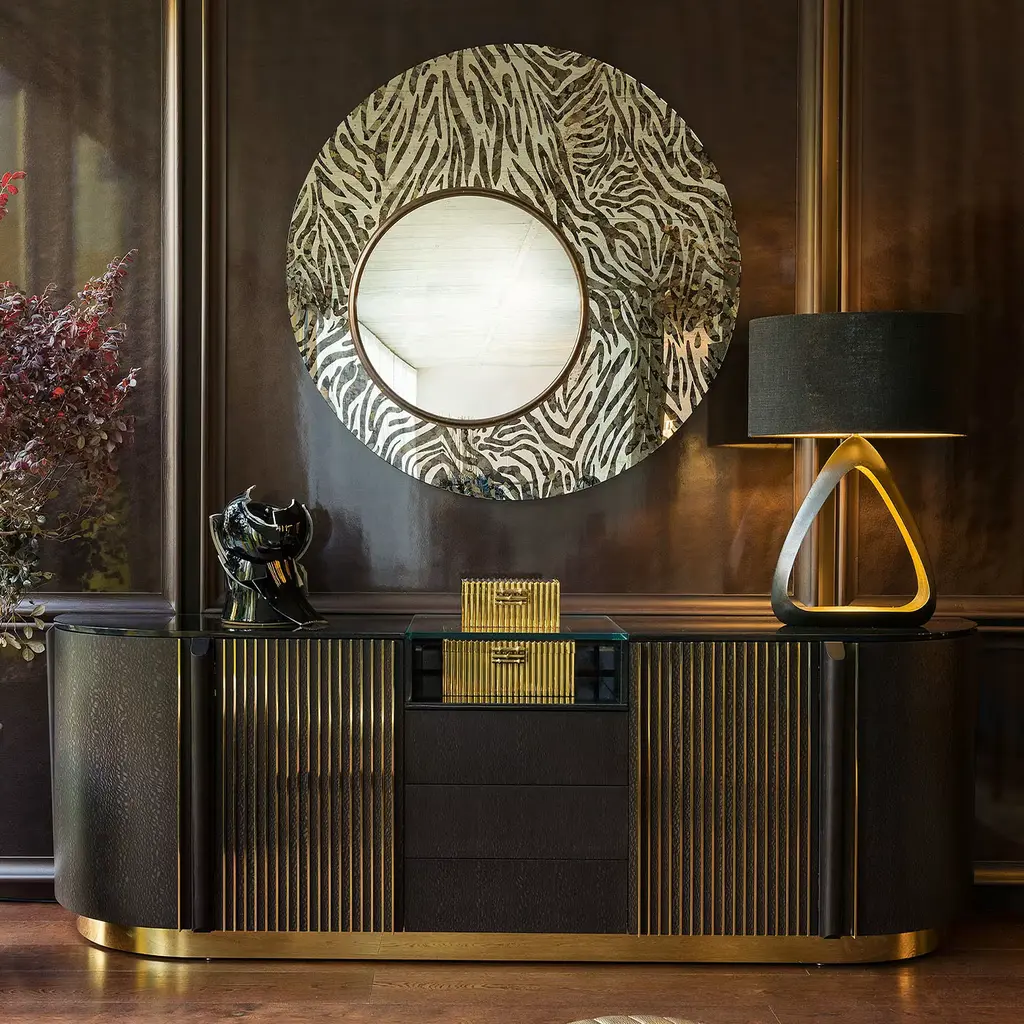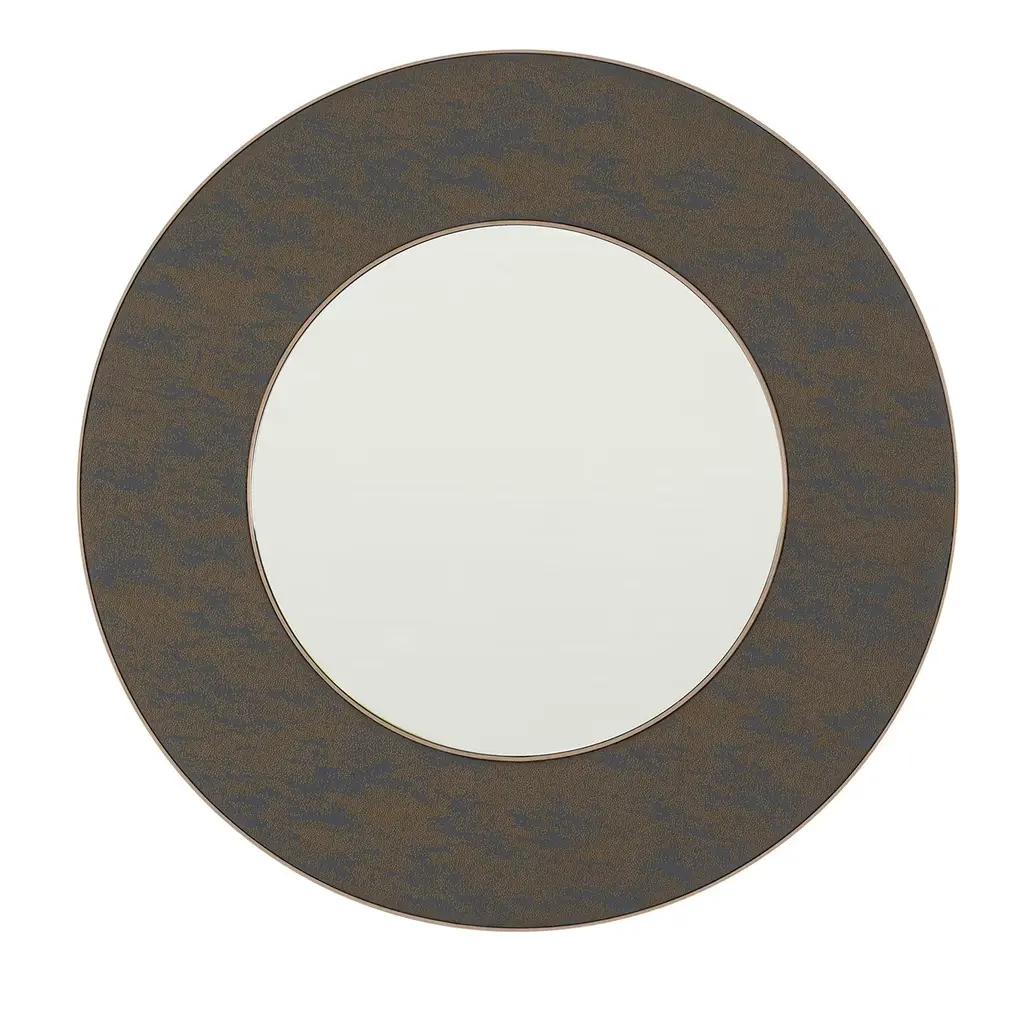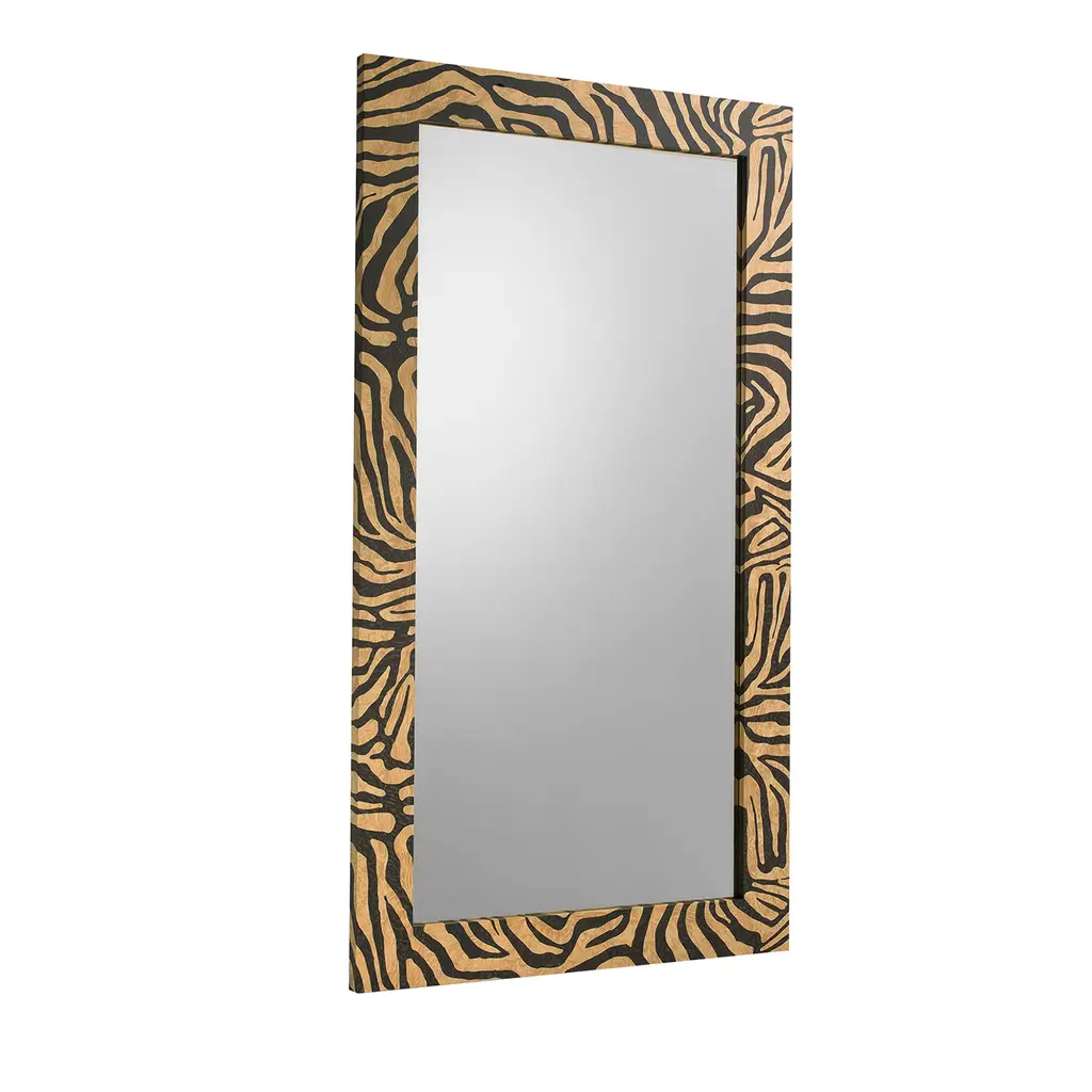 This round eglomisè wall mirror is decorated with an animalier print motif.