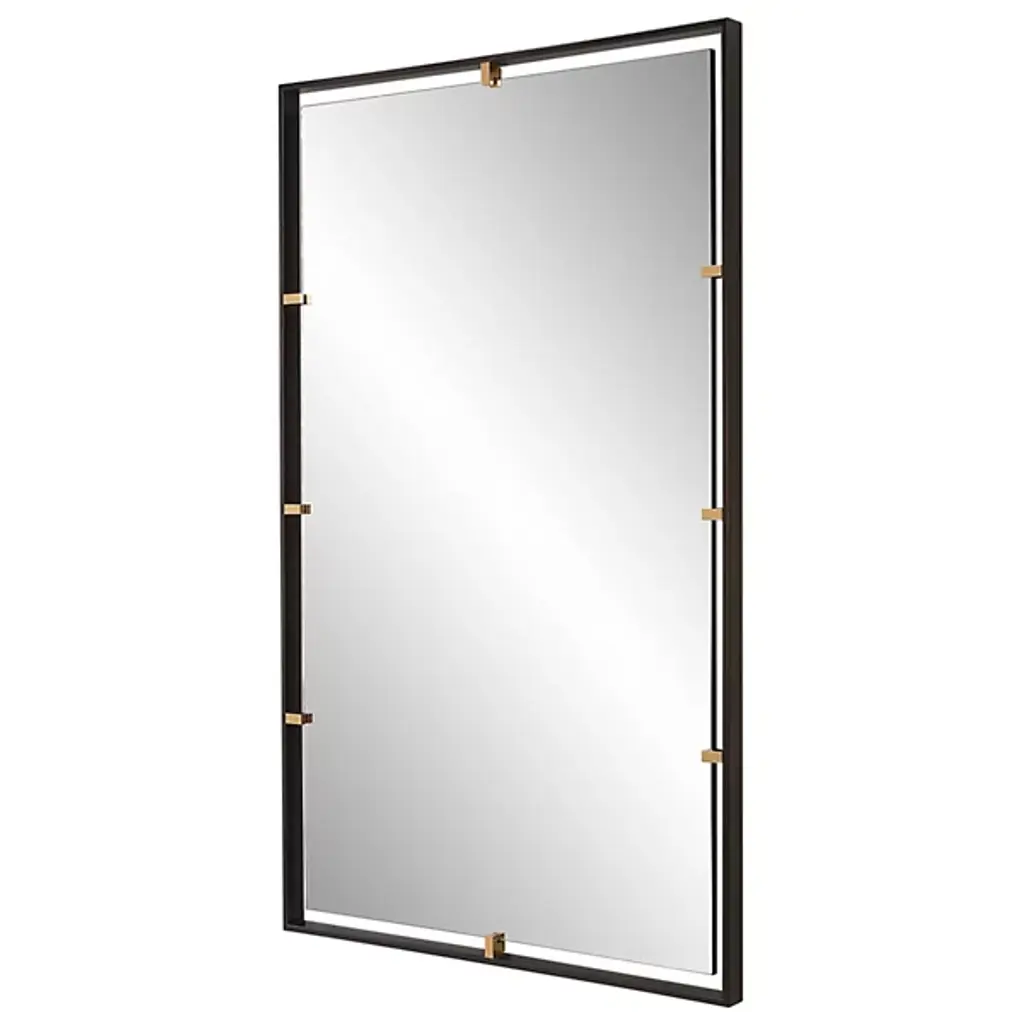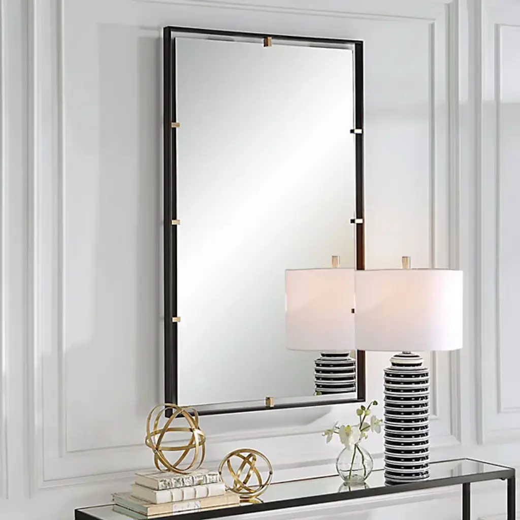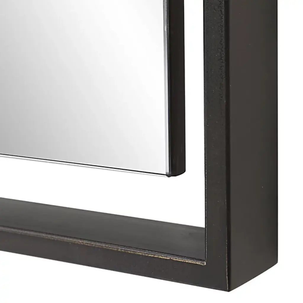 The Egon Rectangular Wall Mirror from Uttermost plays with perspective through its ingenious three-dimensional design. The floating mirror panel appears suspended within the outer frame, secured by precisely positioned metal clips. This pioneering construction method creates visual interest through negative space. The mix of materials and finishes adds subtle contrast while maintaining a cohesive design. Display horizontally or vertically to maximize its adaptable nature.