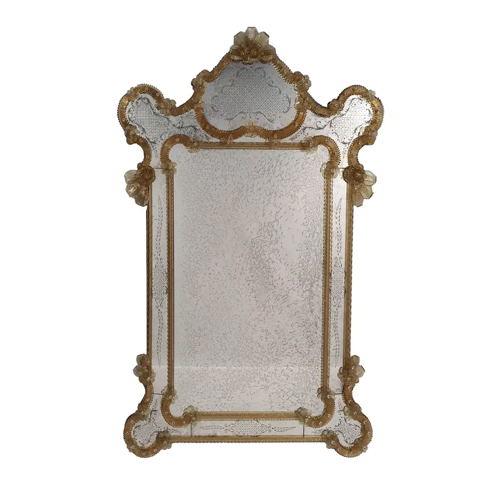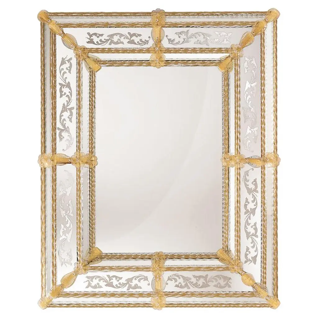 Classic rectangular Venetian mirror, made in the strictest Murano tradition with rich bands carefully engraved by hand. All assembled with golden crystal elements handmade in the Murano furnaces. Wooden frame with a natural finish.