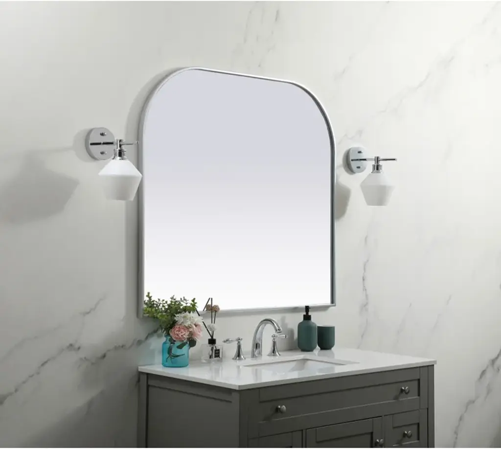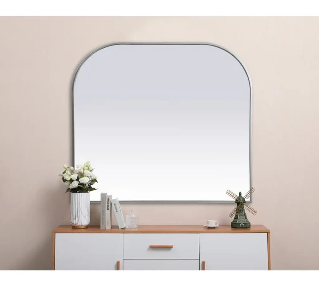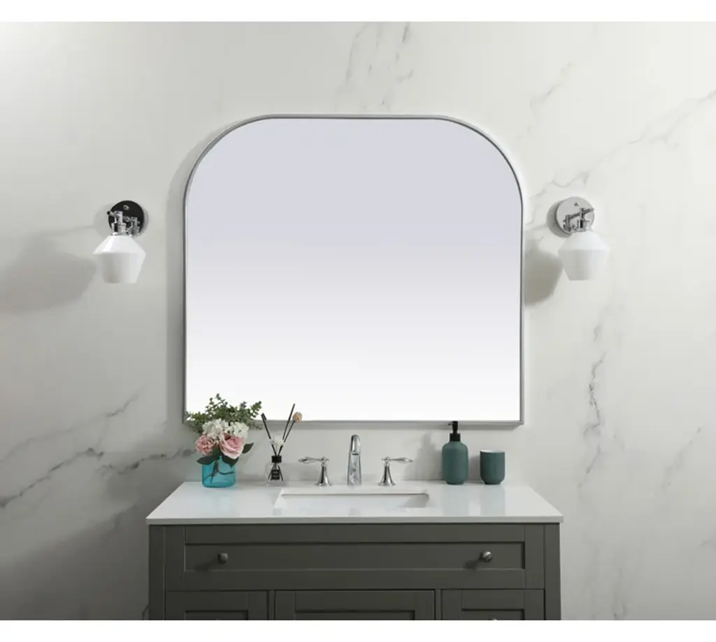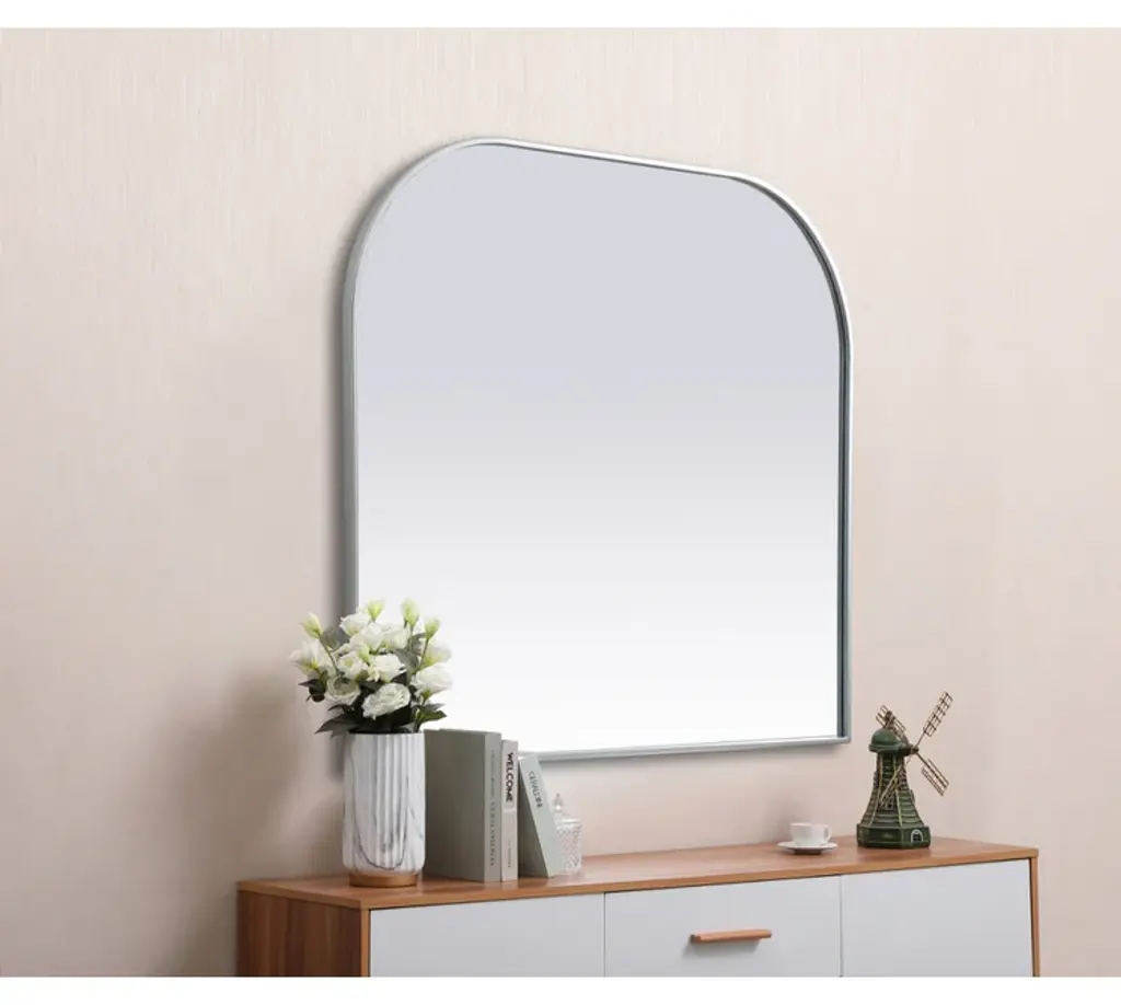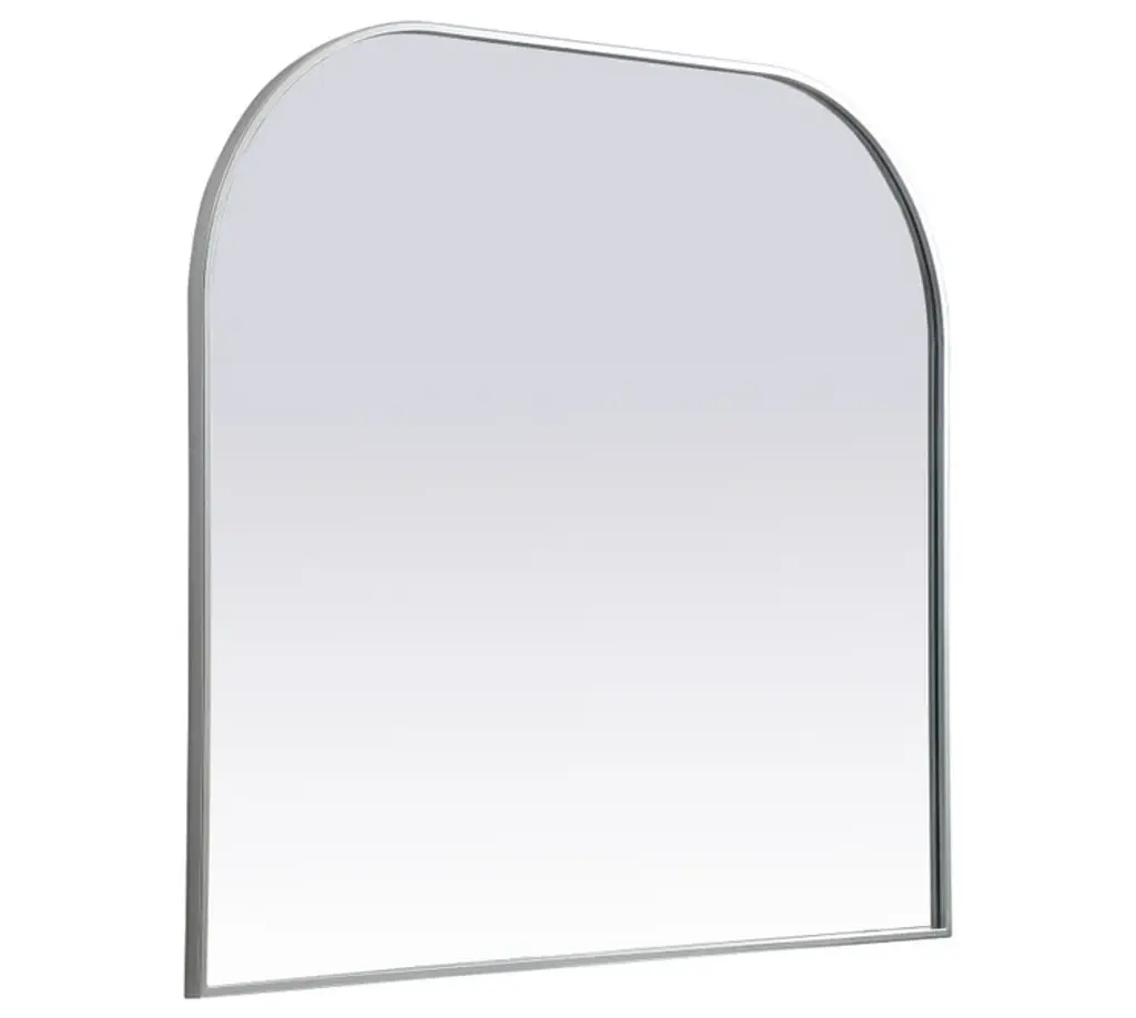 Elegant Decor MR1B4238SIL Metal Frame Arch Mirror 42x38 Inch in Silver. Collection: Blaire. Product Shape: Arch. Finish: Silver. Fixture Material: iron and MDF. Dimension(in): 38(L) x 42(W) x 1(H). Mirror Dimension(in): 41.22(W) x 37.22(H) x 0.15(Depth). Mirror Hanging Orientation: Vertical. Mirror Frame shape: Arch. Mirror type: Flat. Mirror have Beveled glass: NO. Assembly Required: NO. Product Warranty: 1 year limited. California Proposition 65 Warning Required: Yes. Prop 65 Chemical Name: Cadmium.