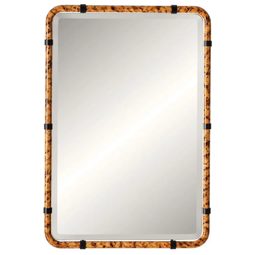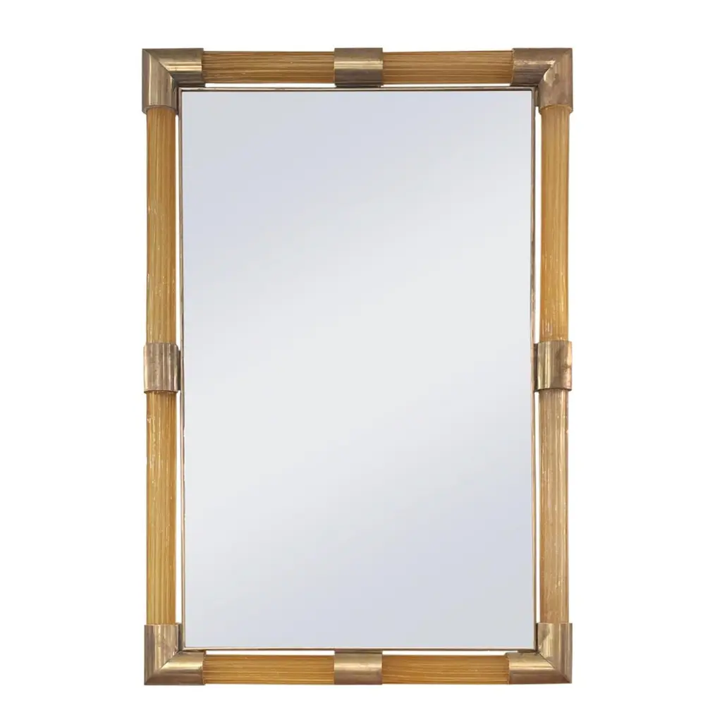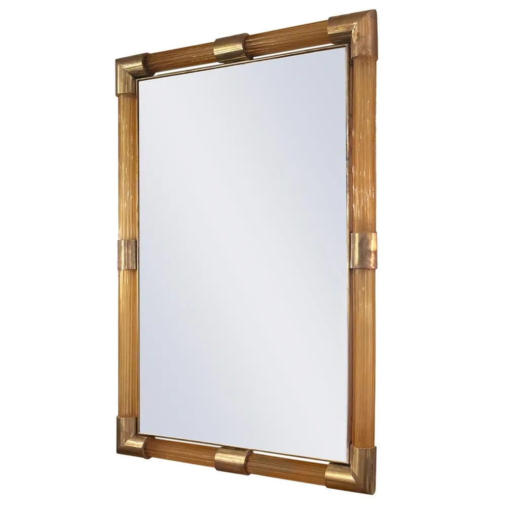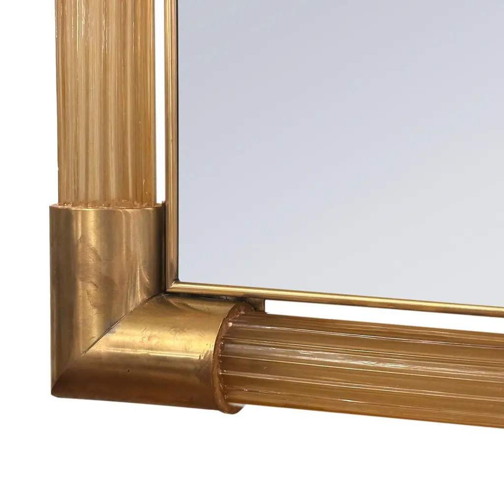 Hand-blown amber color Murano fluted glass rod framed mirror with un-lacquered brass cuffs at corners and midpoints.This mirror features a unique fluted design crafted from Murano glass rods, adding a touch of elegance and sophistication to your home decor. The patinated brass detailing around the frame adds a luxurious and opulent touch, making it the perfect statement piece for any room. With its generous proportions, this mirror not only serves as a functional piece but also as artwork that will elevate the aesthetic of your space. With its timeless design and high-quality construction, this mirror is the perfect choice for those looking for a touch of luxury in their home.This mirror is currently available in our NYC Showroom