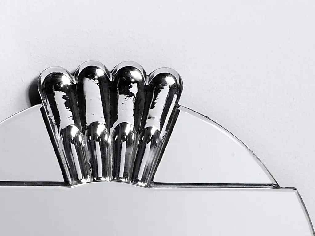 Designed by Nikolai Kotlarczyk for Portego in 2017, Elemento is a series of solid glass mirrors full of depth and bold graphic lines, expertly crafted by hand in Murano. The pieces reference the repeated use of perspective and illusion within the art, architecture, and artisan crafts of the Veneto region. A central inspiration was the forms and spatial designs of the architect Andrea Palladio, and his constant focus on the concept of vista within his work. Working with the skilled glass artists of Murano, a subtle use of perspective and depth was created through the intricate carving and grinding of the mirrored glass surfaces, which were then silvered to give depth to the details. The back is in wood painted in a cream color and a wall hanger is included so it can be easily hung on the wall with a screw. Numbered,Numbered