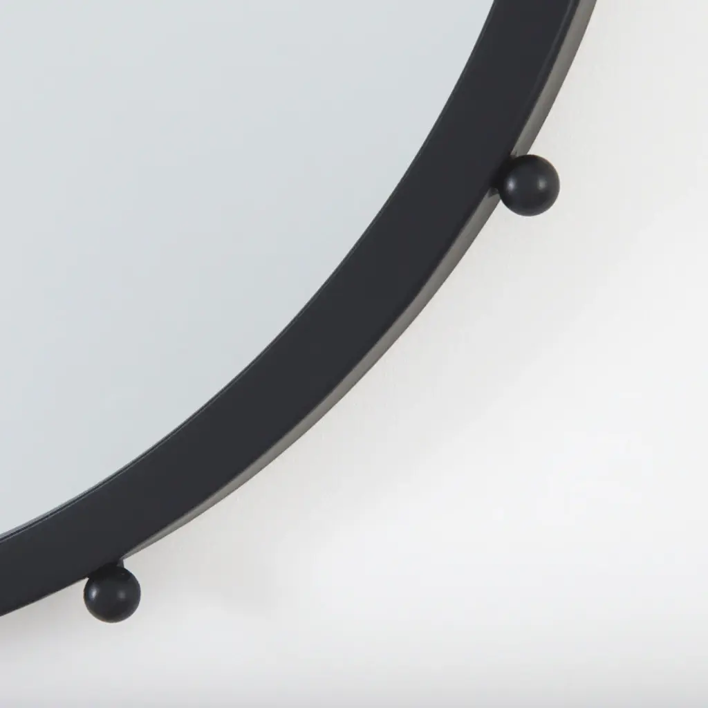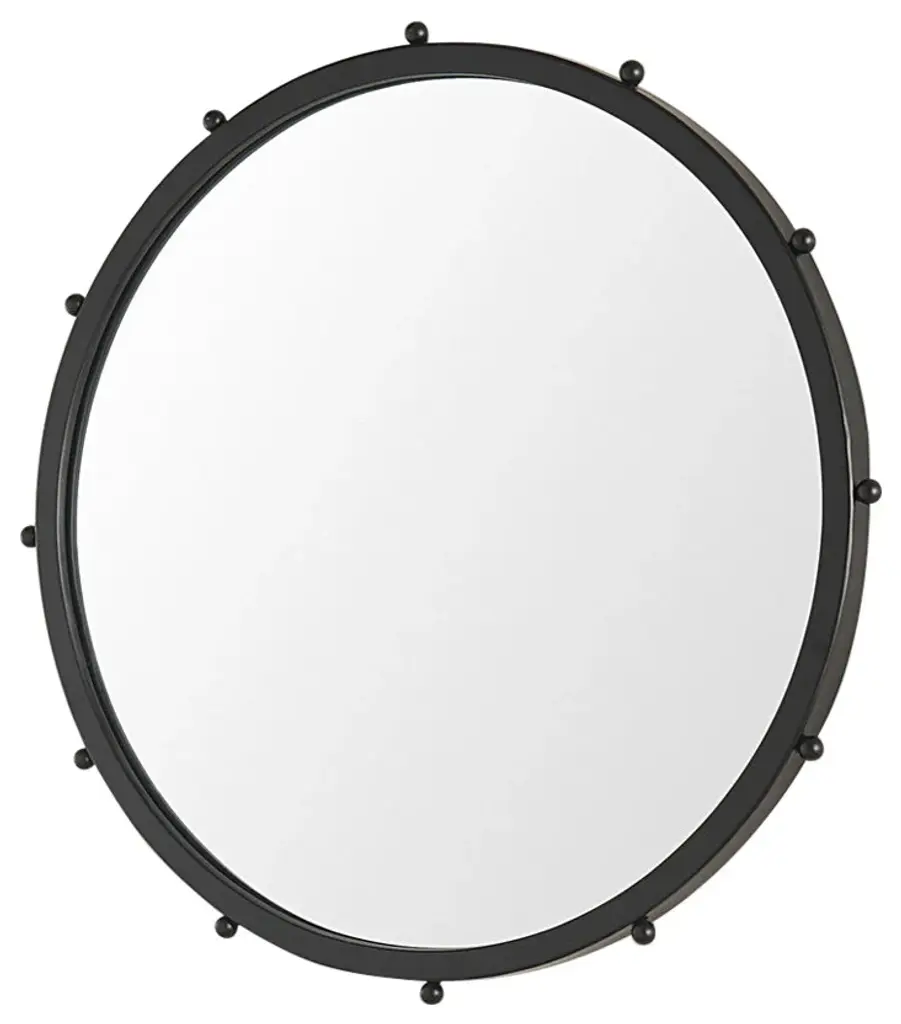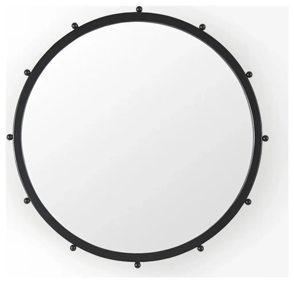 The Elena is a round metal wall mirror trimmed with dainty metal beads