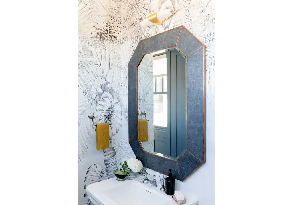 This geometric mirror boasts a handsome octagonal shape. Featuring a faux linen charcoal frame accentuated by a natural walnut wood trim, it lends depth and visual texture. Its substantial size adds a refined touch to entryways, living rooms, and hallways.