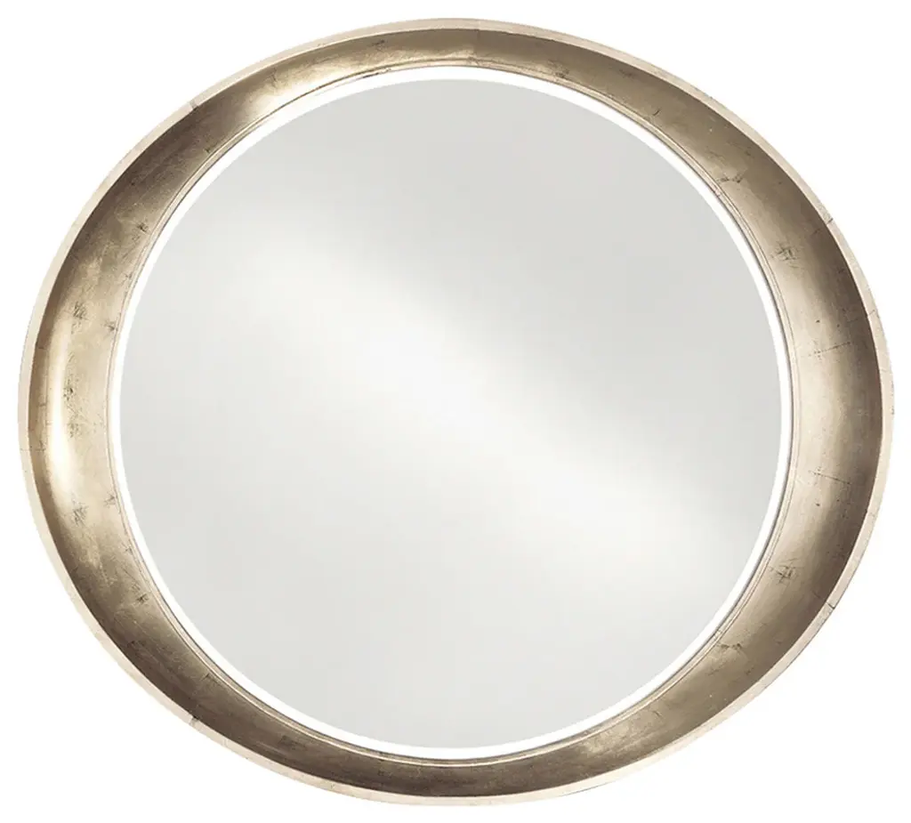 Our Ellipse Mirror is the epitamy of sleek, Contemporary style. Its simple round shape is created from a resin frame and is finished in a burnished white gold leaf.Frame Dimensions: 35"W x 39"H X 1"DMirror Dimensions: 32" DiameterFinish: Burnished Silver Leaf (Light Golden Hues)Material: ResinBeveled: YesShape: OvalWeight: 26lbsIncluded: Brackets, Ready to HangShipping: Free Shipping via FedEx 7 - 10 Business Days