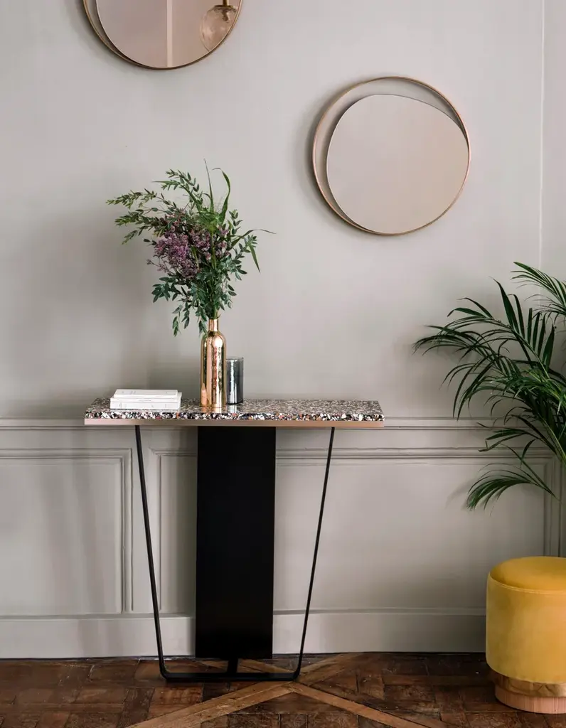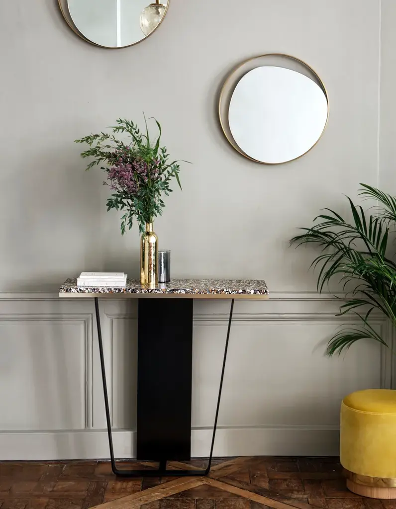 The interplay of irregular concentric organic forms combined with smoky glass for a hyptonic affect. Whether it accents your vestibule, acts as an objet d’art in your salon or plays up your bathroom, the elliptical mirror is a striking addition wherever you put it.MaterialsThe mirror is made of natural or smoked glass, circled by an elegant brass ring. With great attention to detail, Red Edition have transformed this exquisite piece, making it more than a mirror, it is a wall sculpture and a feast for the eye.