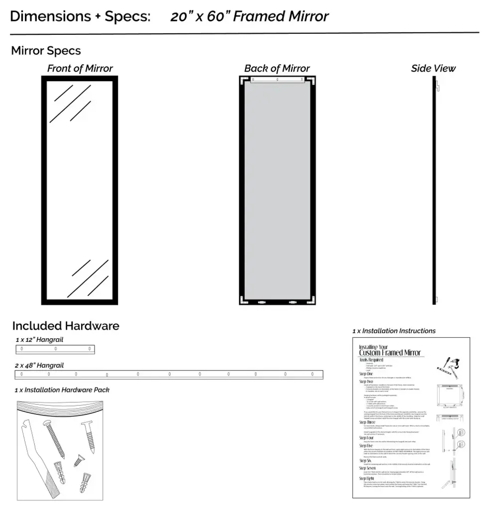 The thinnest framed mirror we have. At 1 1/4" wide and 3/4" thick, the Ellis collection is perfect for those smaller mirrors or where a minimalistic approach comes in to play. In a white, black, espresso textured, satin nickel, silver, gold, or brushed chrome finish, there is an option for everyone in the Ellis Framed Mirror collection.Hangrail for installation will be applied on the width of the frame. All assembly hardware and instructions will be included. Additional hangrails are included if the opposite orientation is desired for installation. The dimensions displayed are the final outside dimensions of the frame, including the mirror. CATII safety backing applied on all mirrors. Approved for high-moisture areas such as bathrooms.