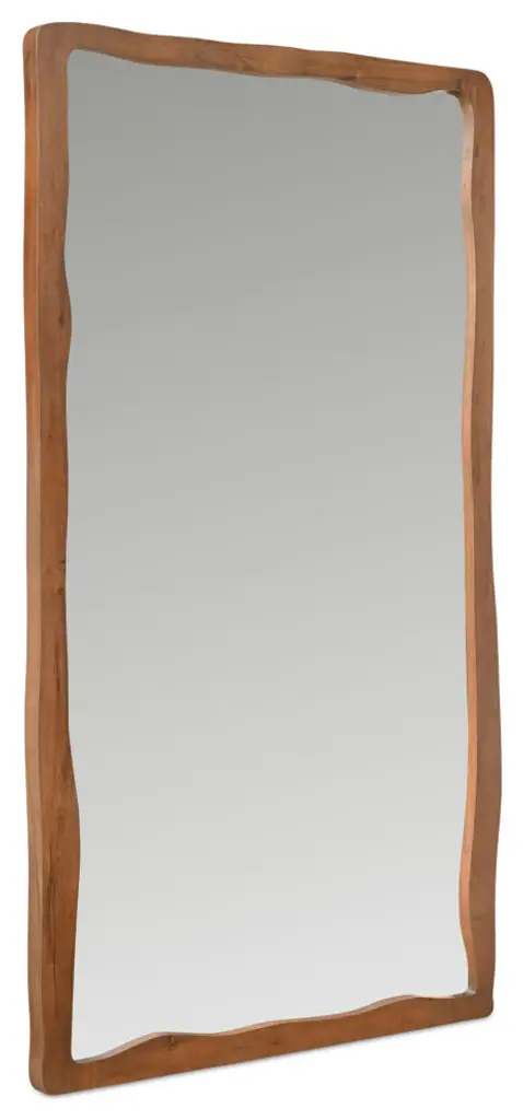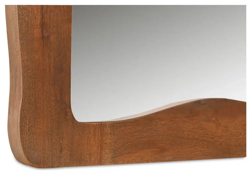 The Ellis mirror artfully fuses mid-century sensibility with contemporary flair. Encased by a robust solid Acacia wood frame, it features an alluring free-form wave design, finished in a mid-tone walnut brown that enriches its allure with a timeless warmth. Its unique shape allow for creative expression in any room it graces.