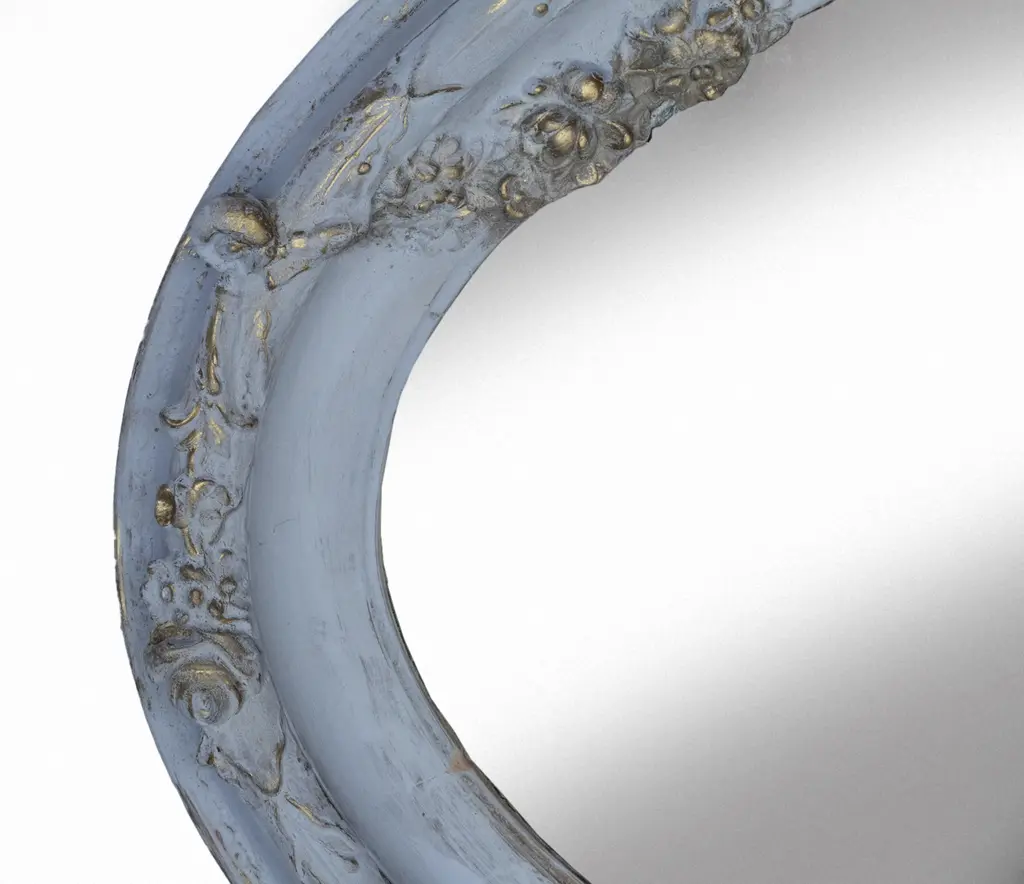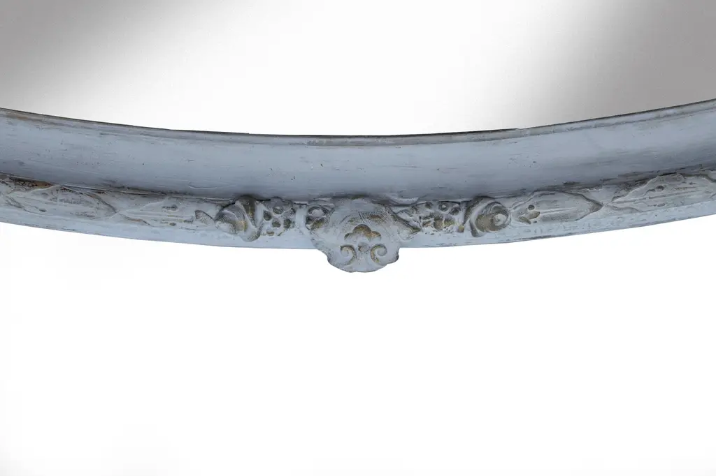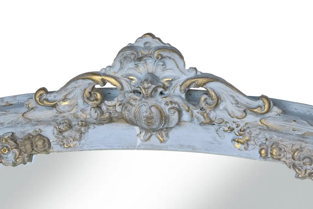 Lovely Victorian oval beveled mirror has a detailed crest accented in gold over French blue with additional decorative details placed around the frame.