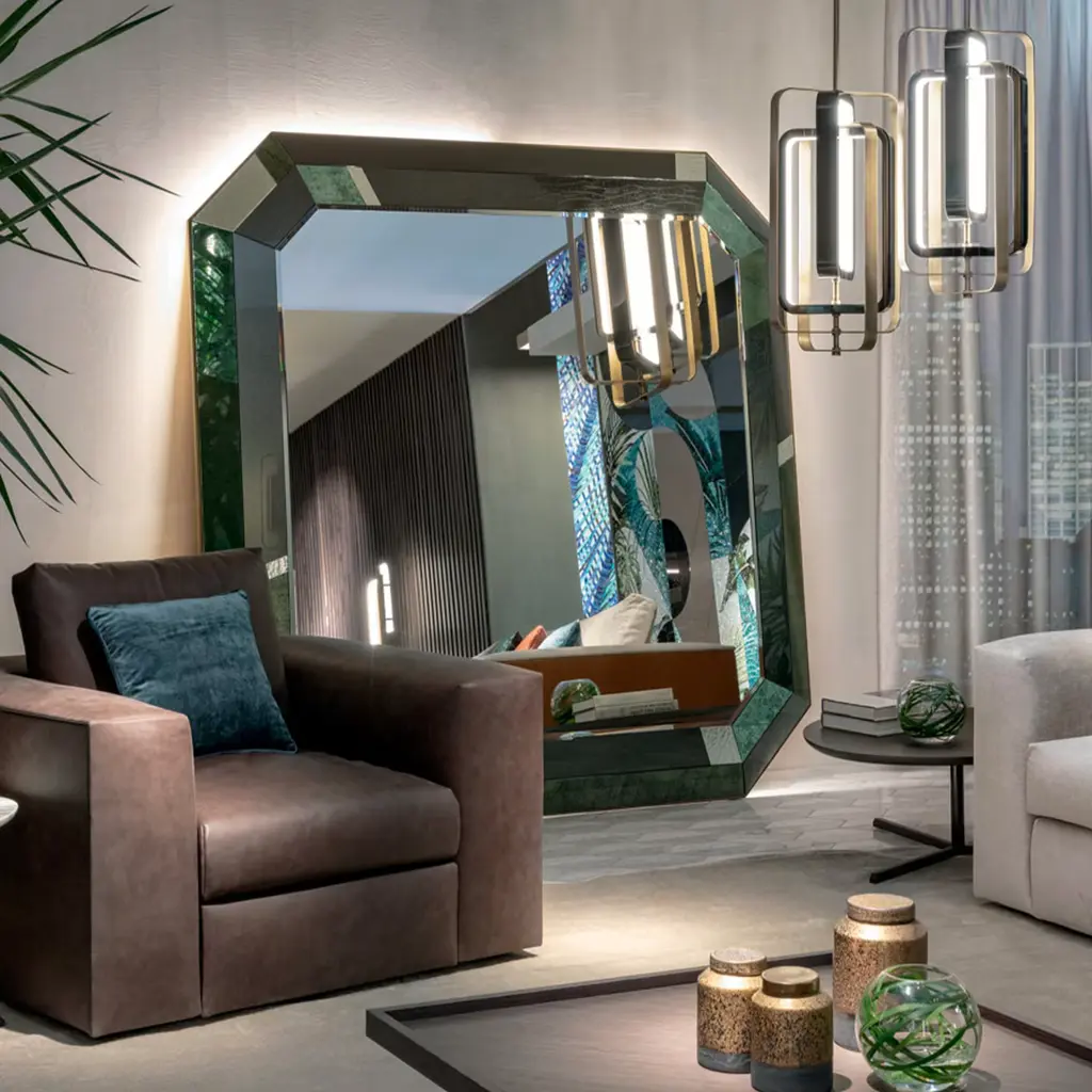 Its shape recalls the cuts of gemstones. The side elements in foam glass surround the central mirror and create multiple games of reflections.