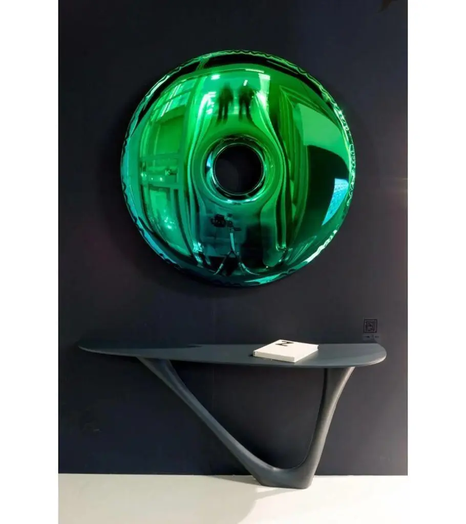 Emerald Rondo 95 Wall Mirror by ZietaDimensions: Diameter 95 x D 6 cm Material: Stainless steel.Finish: Emerald.Available finishes: Stainless Steel, White Matt, Sapphire/Emerald, Sapphire, Emerald, Deep space blue, Dark matter, or red Rubin. Also available in sizes ø75, ø120, and ø150cm. The Rondo Mirror is made of stainless steel polished to a high gloss. Its polished surface is perfectly reflecting the light and other objects placed in the same room or hall. Largescale convexities that appear on the surface of the mirror are literally able to alter the space. It is like making an individualized interior design of the moment when by rolling the mirror from one place to another everybody can create or rediscover a well-known environment to a brand new and grasping concept. Depending on Rondo´s arrangement, either by hanging it or leaning at the wall, the mirror can change the perception of the surroundings.Deep, dark, blue, and intriguing. The new unique finish of Rondo Deep Space Blue takes the spectators for an unexpected journey into an undiscovered world of reflections. The mirror resembles cosmic wonders and at the same time can be fitted with the most demanding and elegant interiors. Color gives meaning and brings associations. The Gradient collection presents the whole spectrum of shades of cool sea depth. Carefully selected colors blend well with the hard steel.About Zieta: Zietas main goal is to deliver uniqueness and customization in design and construction while keeping the production, transport, and warehousing innovatively efficient.This is how they imagine the future world: Light, durable structures of customized applications produced on demand out of one-of-a-kind parts, yet efficiently.They use a computer-controlled production process. Customized pattern, customized form, customized function, one-of-a-kind product, and outstanding precision are what they deliver.You will find all of this philosophy reflected in the products. They research, they discover new possibilities, they play with forms and they deliver a beautiful, innovative, surprising outcome to people who love the design and who care about design development.They believe their work is a valuable contribution to the world of design not only by the unique beauty of the forms but most of all by opening ultra-innovative opportunities of forming and new paths for the world of the future.