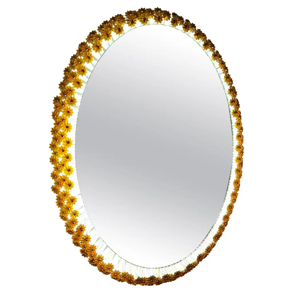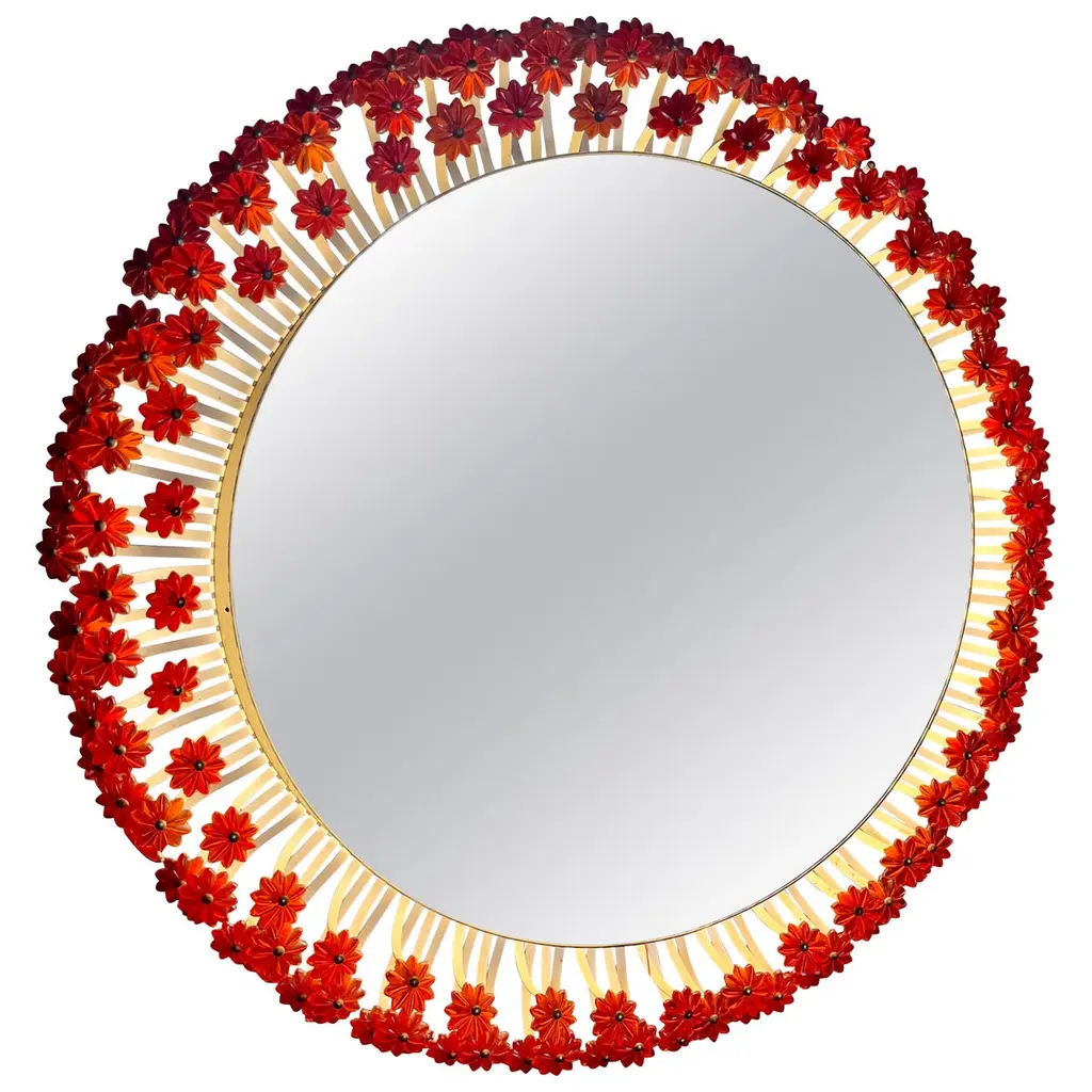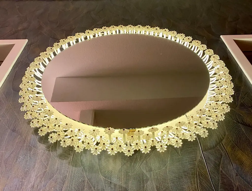 A round wall mirror by Münchner Zier-Form, designed by Emil Stejnar, with indirect lighting and plastic flowers from the 1960s.This vintage item is fully functional and in very good condition, but shows signs of age-related wear.Marked: Münchner Zierspiegel / Made in GermanyTotal diameter: 84 cmMirror glass diameter: 64 cmThe power cord shown is not included. The lamp will be securely wrapped and boxed during shipping to prevent damage.The mirror is connected to the wall with a cable like a wall lamp.Delivery does not include a light bulb.Unfortunately, due to the oversized mirror, shipping costs are considerably higher and not available for all countries.I only sell used items.The respective items show more or less visible signs of wear, commensurate with their age.