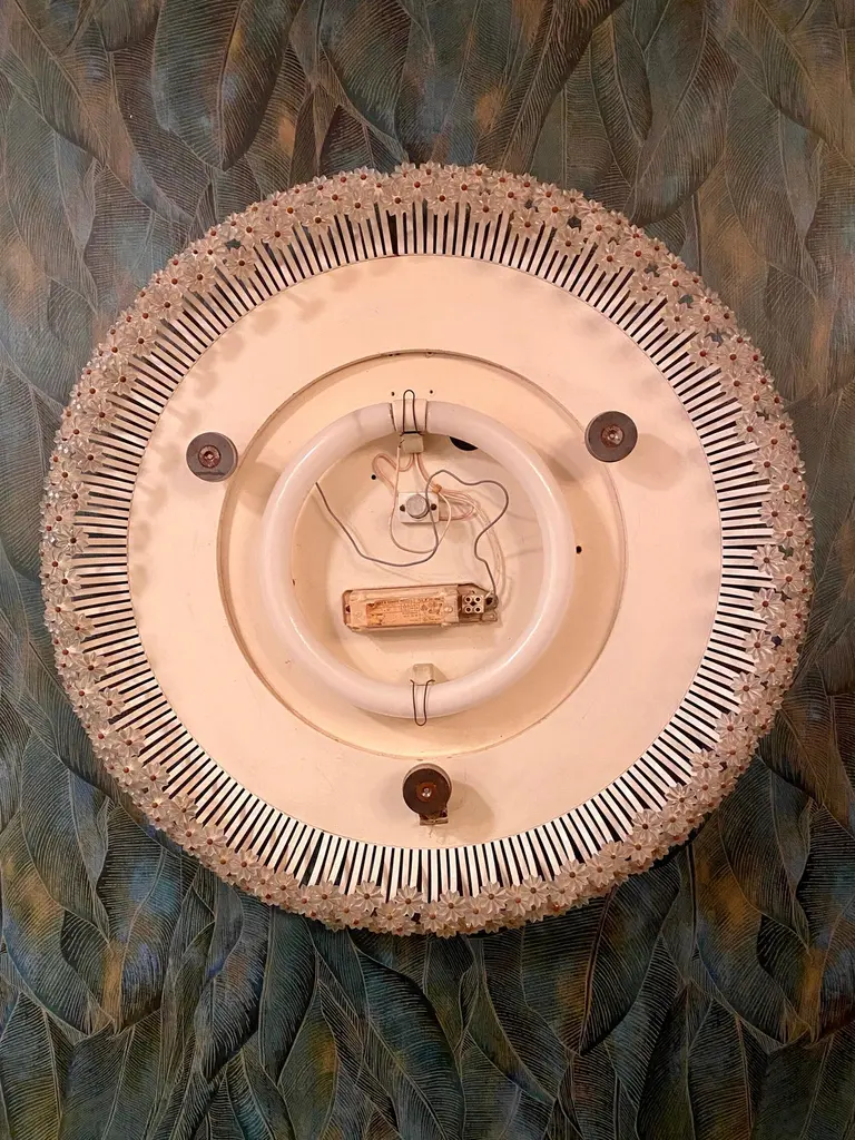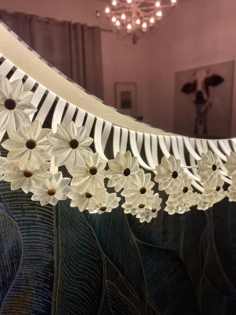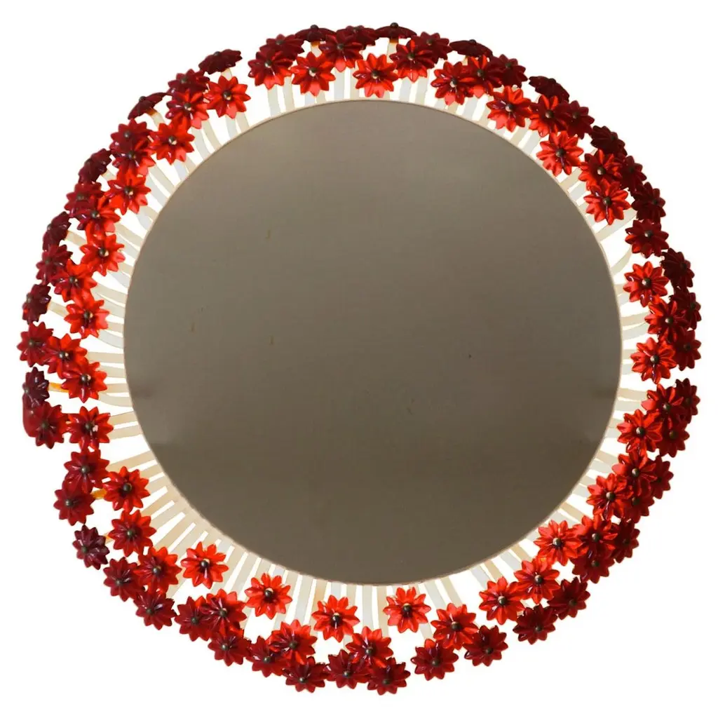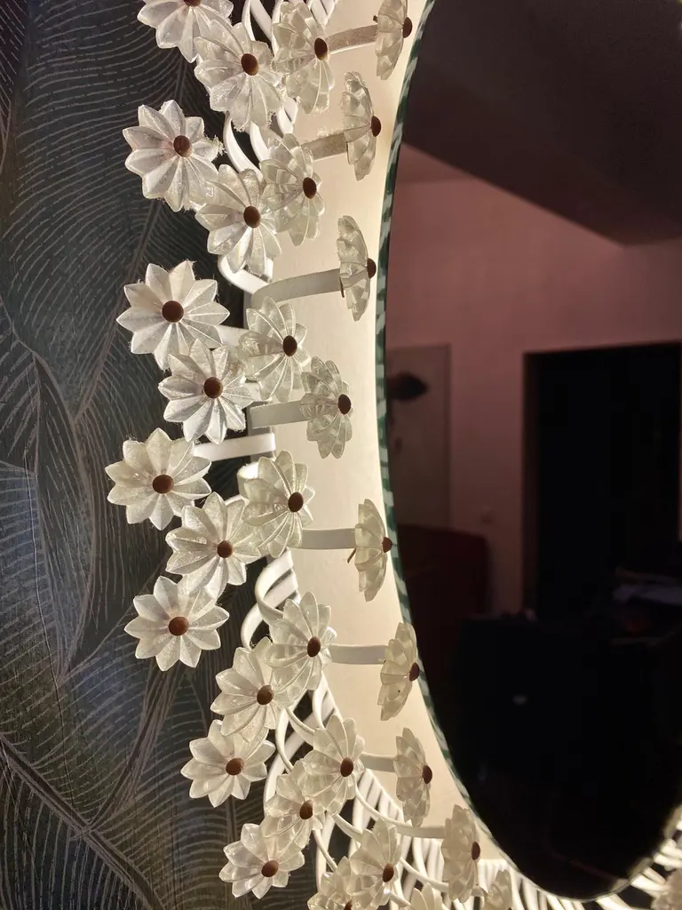 A round wall mirror by Münchner Zier-Form, designed by Emil Stejnar, with indirect lighting and plastic flowers from the 1960s.This vintage item is fully functional and in very good condition, but shows signs of age-related wear.Marked: Münchner Zierspiegel / Made in GermanyTotal diameter: 84 cmMirror glass diameter: 64 cmThe power cord shown is not included. The lamp will be securely wrapped and boxed during shipping to prevent damage.The mirror is connected to the wall with a cable like a wall lamp.Delivery does not include a light bulb.Unfortunately, due to the oversized mirror, shipping costs are considerably higher and not available for all countries.I only sell used items.The respective items show more or less visible signs of wear, commensurate with their age.