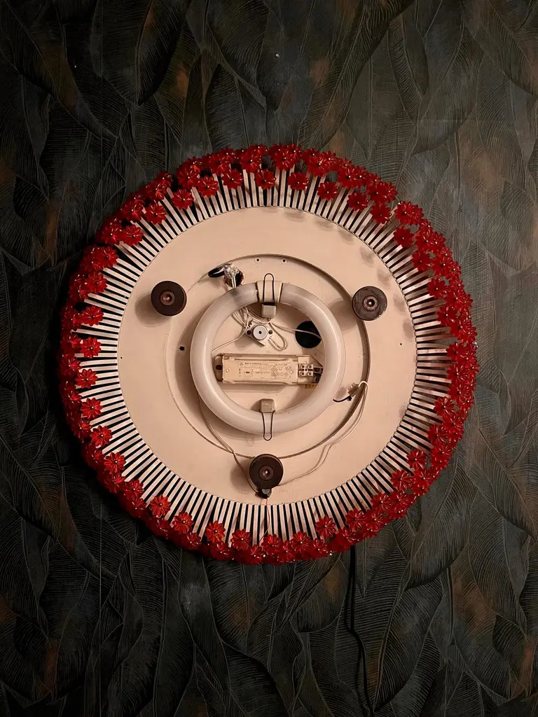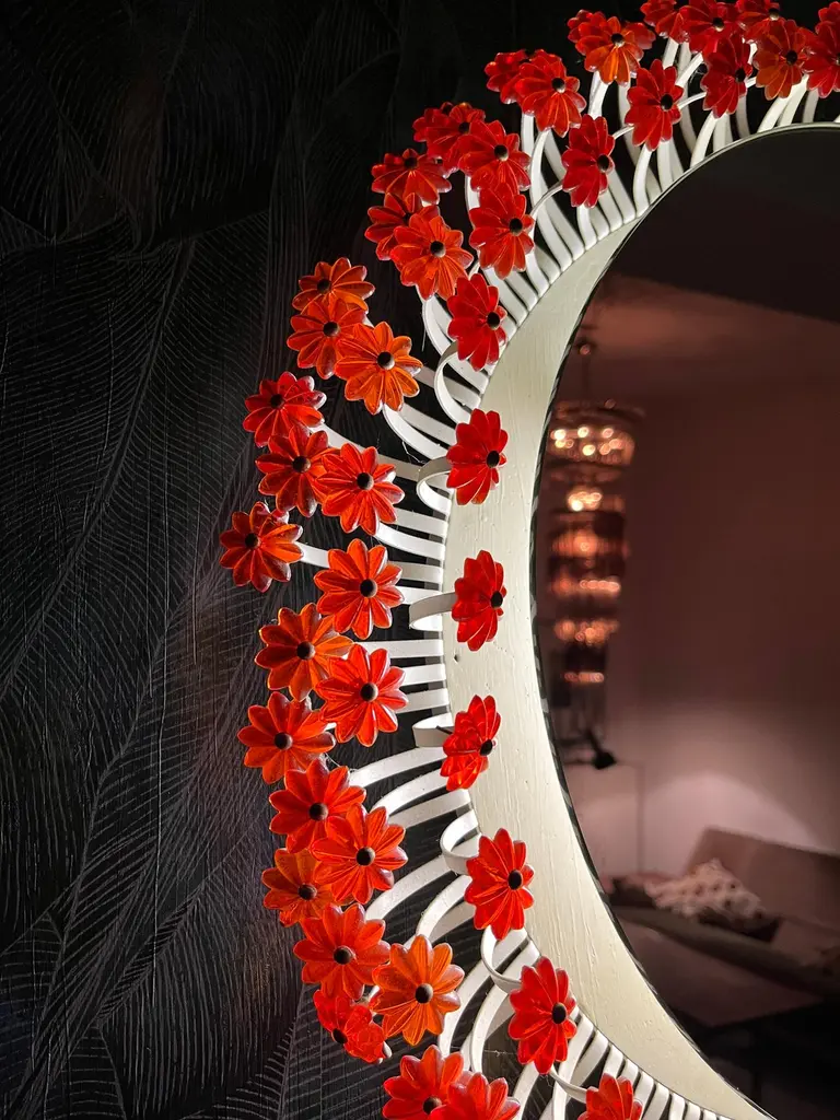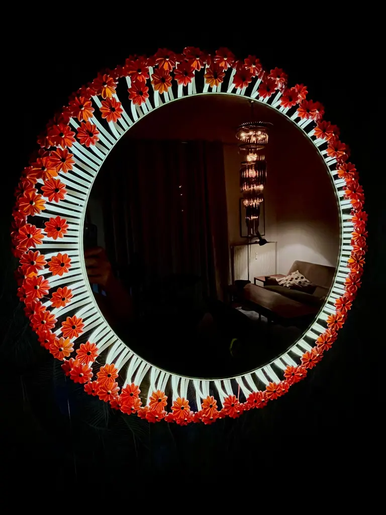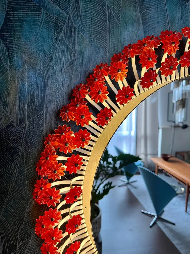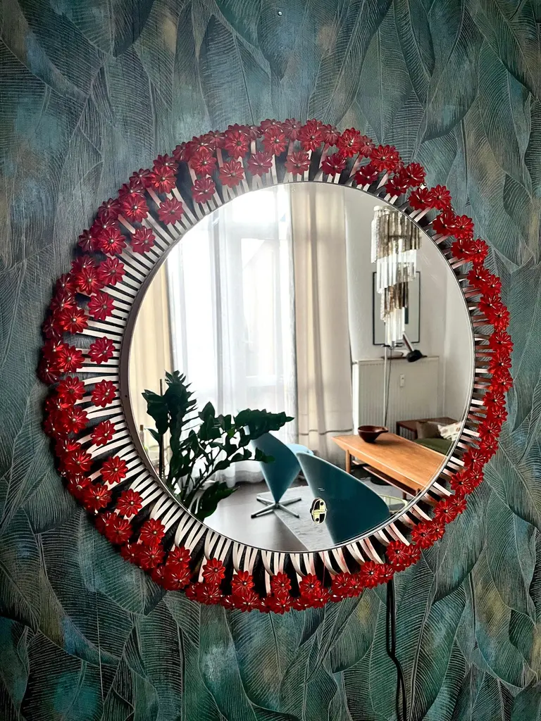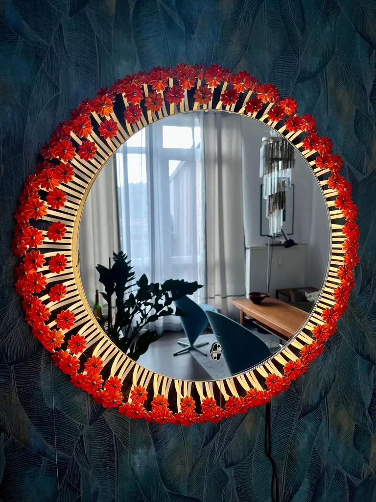 A round wall mirror by Münchner Zier-Form, designed by Emil Stejnar, with indirect lighting and plastic flowers from the 1960s.This vintage item is fully functional and in very good condition, but shows signs of wear consistent with age. One plastic flower is missing... we are still desperately searching for a replacement ;)Total diameter: 58 cmMirror glass diameter: 41 cmThe pictured power cord is not included. The lamp will be securely wrapped and boxed during shipping to prevent damage.The mirror is connected to the wall with a cable like a wall lamp.Bulb not included.I only sell used items.The respective items may show more or less visible signs of wear, depending on their age.