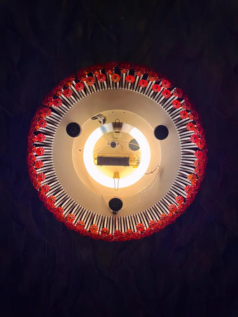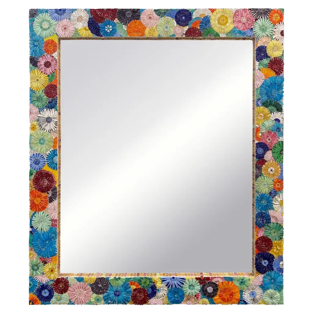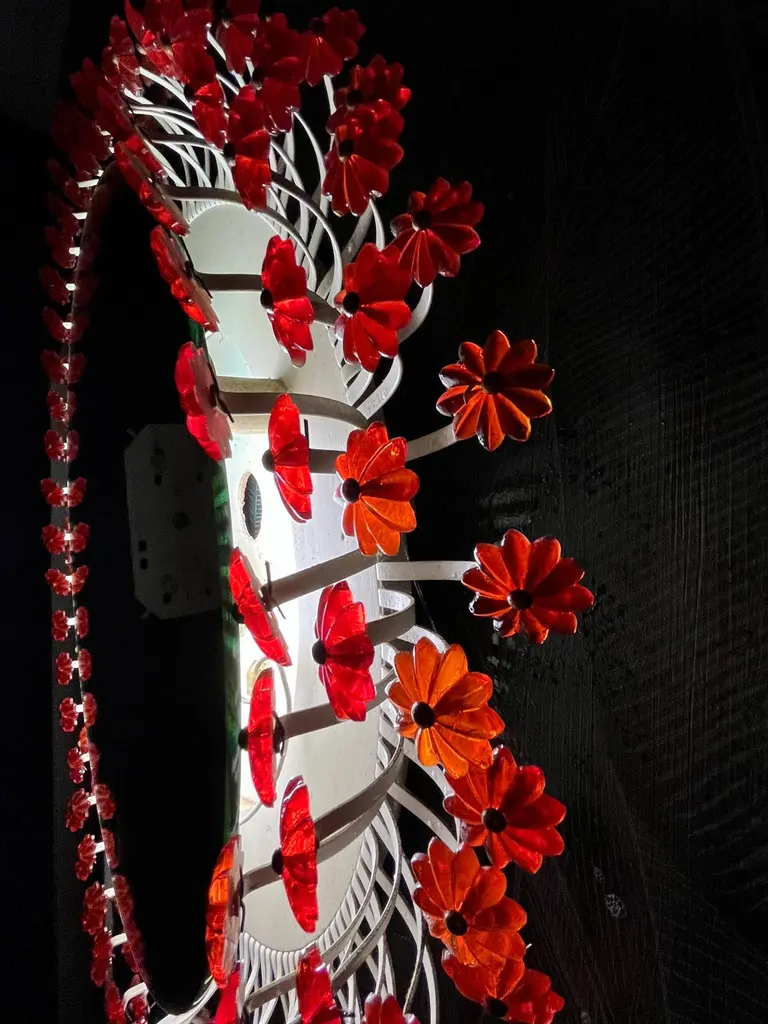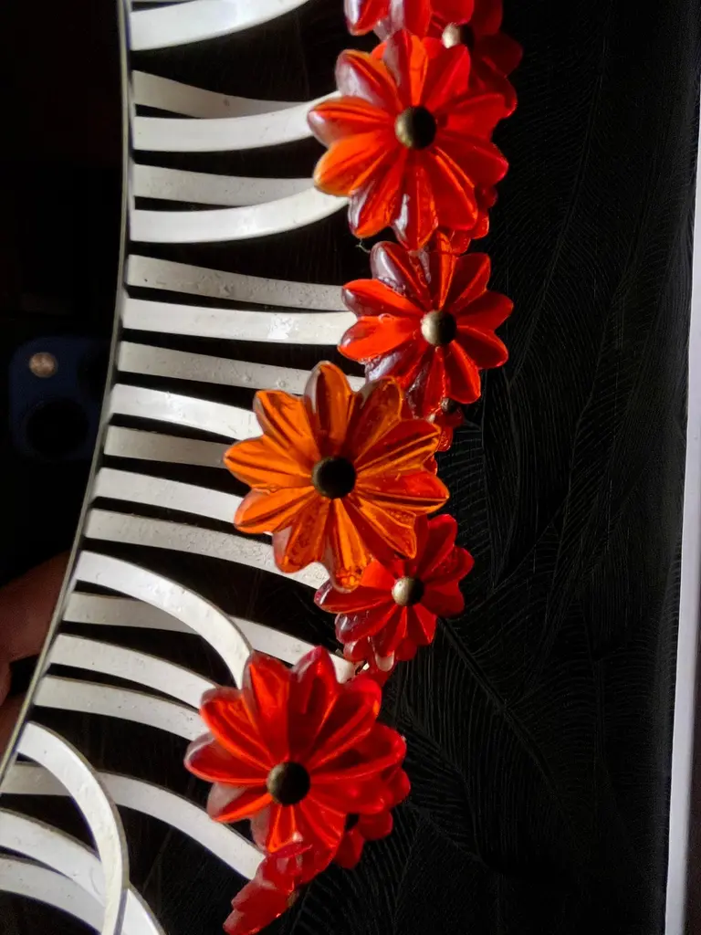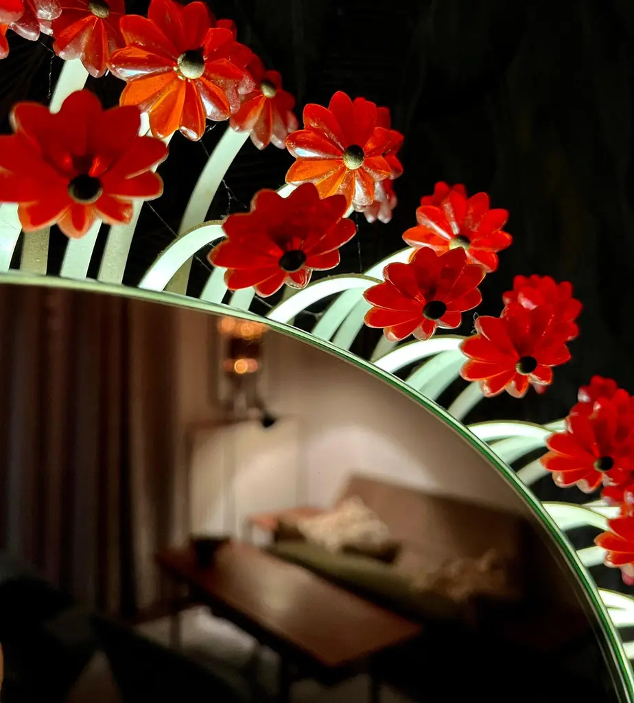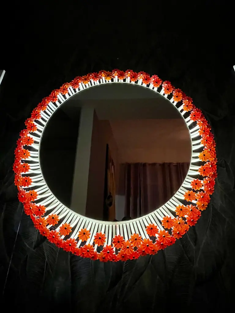 A round wall mirror by Münchner Zier-Form, designed by Emil Stejnar, with indirect lighting and plastic flowers from the 1960s.This vintage item is fully functional and in very good condition, but shows signs of wear consistent with age. One plastic flower is missing... we are still desperately searching for a replacement ;)Total diameter: 58 cmMirror glass diameter: 41 cmThe pictured power cord is not included. The lamp will be securely wrapped and boxed during shipping to prevent damage.The mirror is connected to the wall with a cable like a wall lamp.Bulb not included.I only sell used items.The respective items may show more or less visible signs of wear, depending on their age.
