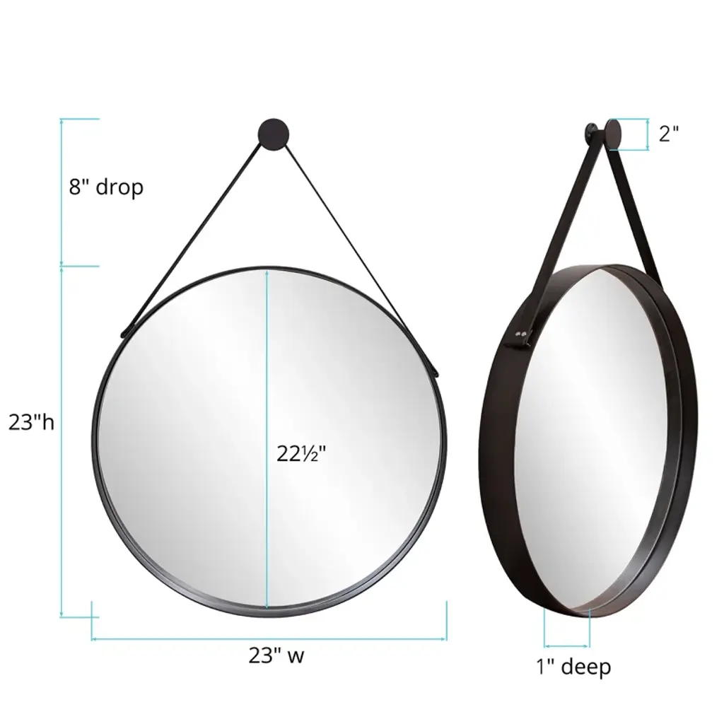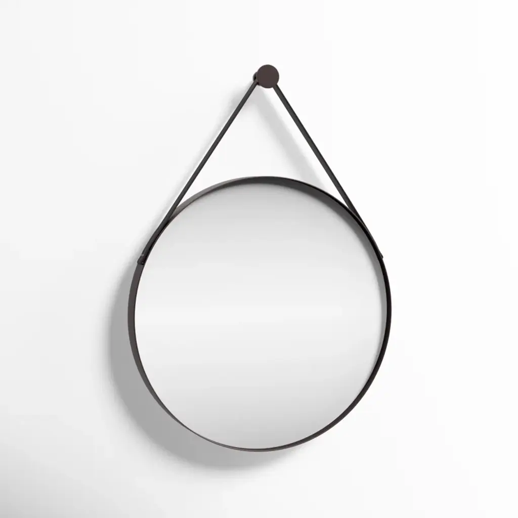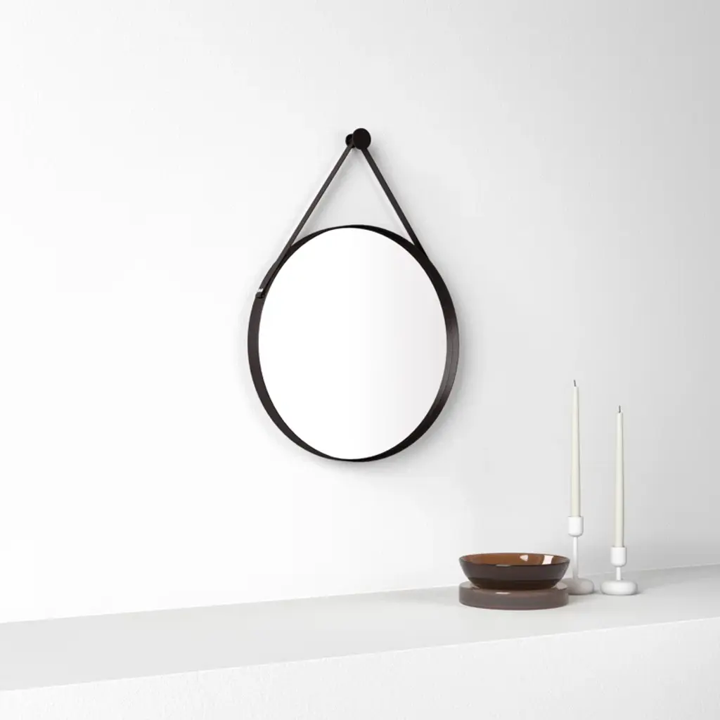 British explorers for years have inspired everything from furniture to accessories. Their adventures often referred to as campaigns has created a design sensation. A mirror was often part of these travels and featured a leather strap that could be used to hang it from the tent or a tree. Hence the inspiration for our Huntley Mirror. A round stainless steel frame finished in brushed black features a leather strap. A matching round hanging knob affixes to the wall.