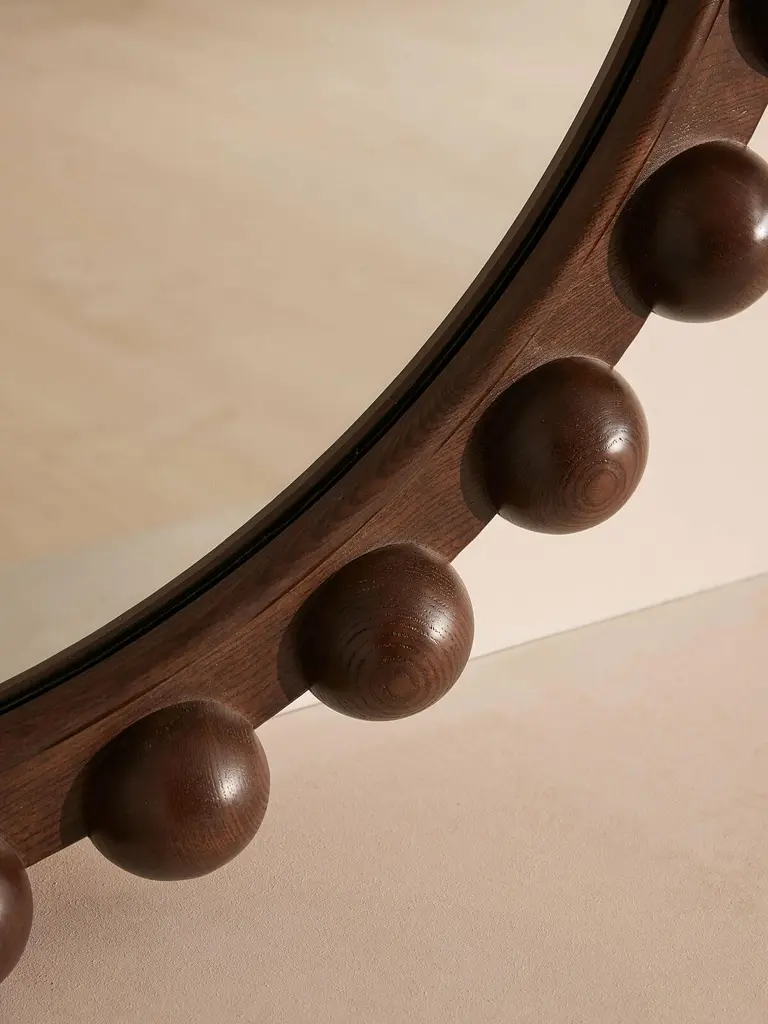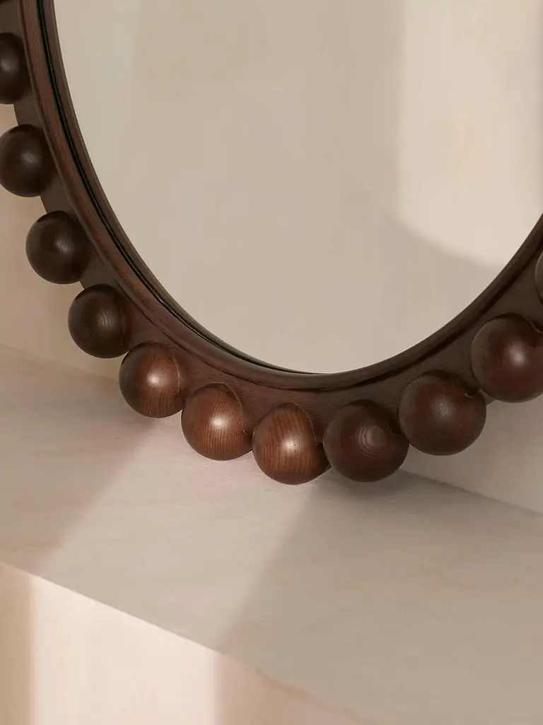 A decor piece with endless impact, our Emilia round mirror features a bobble frame that's been carved for extra definition. Crafted from solid dark oak, it reflects similar styles seen in Shoreditch House. Place above a mantelpiece or in the bedroom to recreate the House's signature look and open up your space.