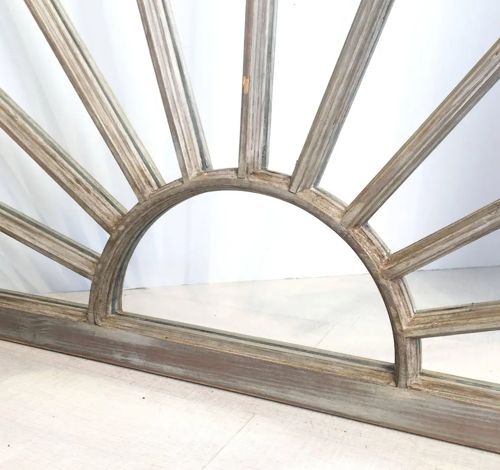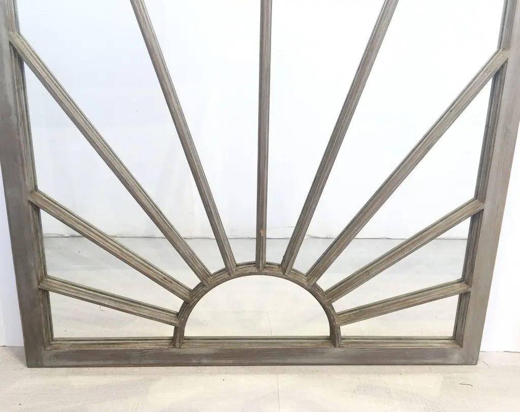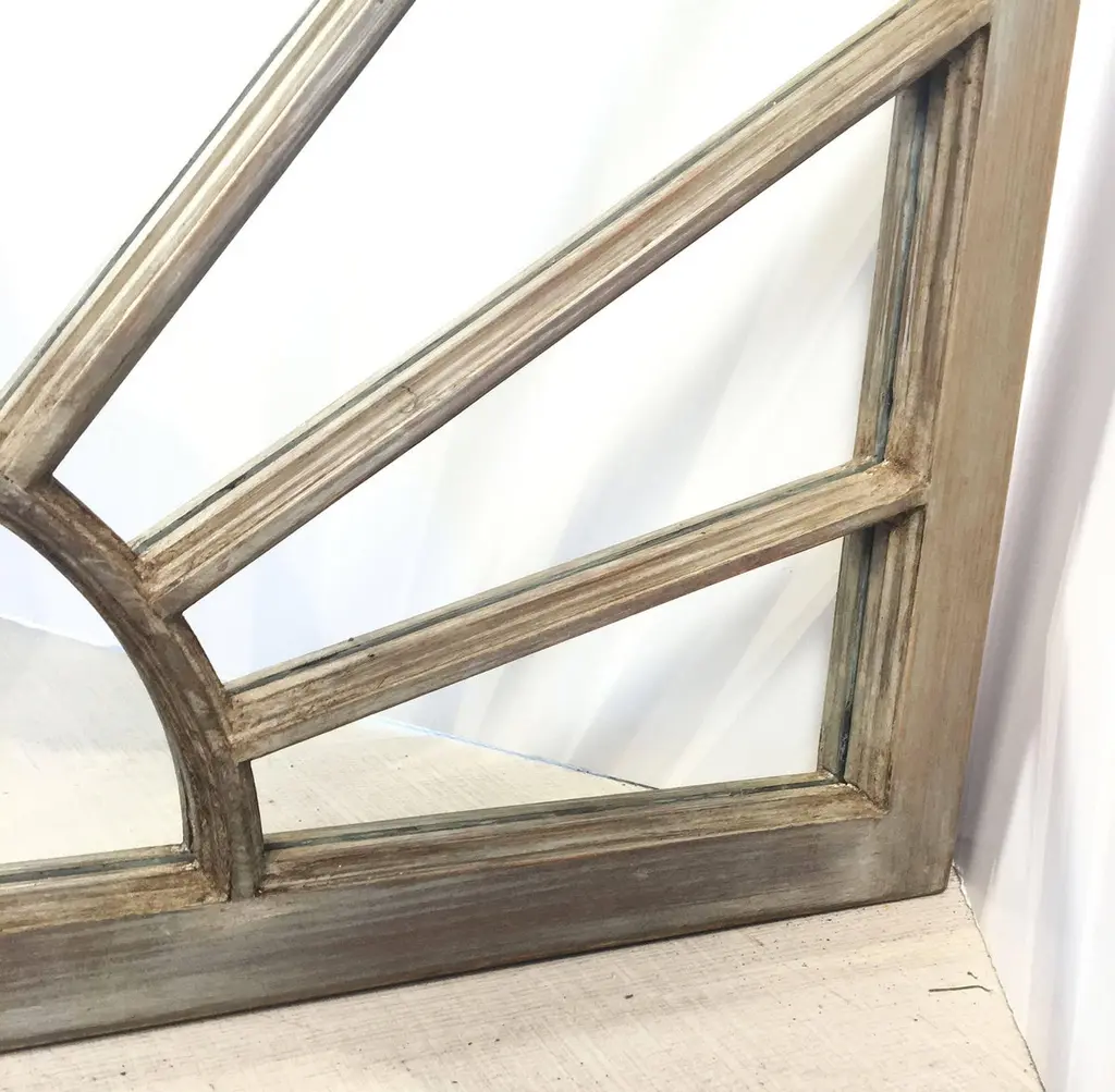 A fine large English rectangular grey frame wall mirror, of painted wood with mirrored glass, featuring a featuring a sun design.Dimensions are H 48 3/4 inches x W 35 3/4 inchesTwo available at $1895 each mirror.
