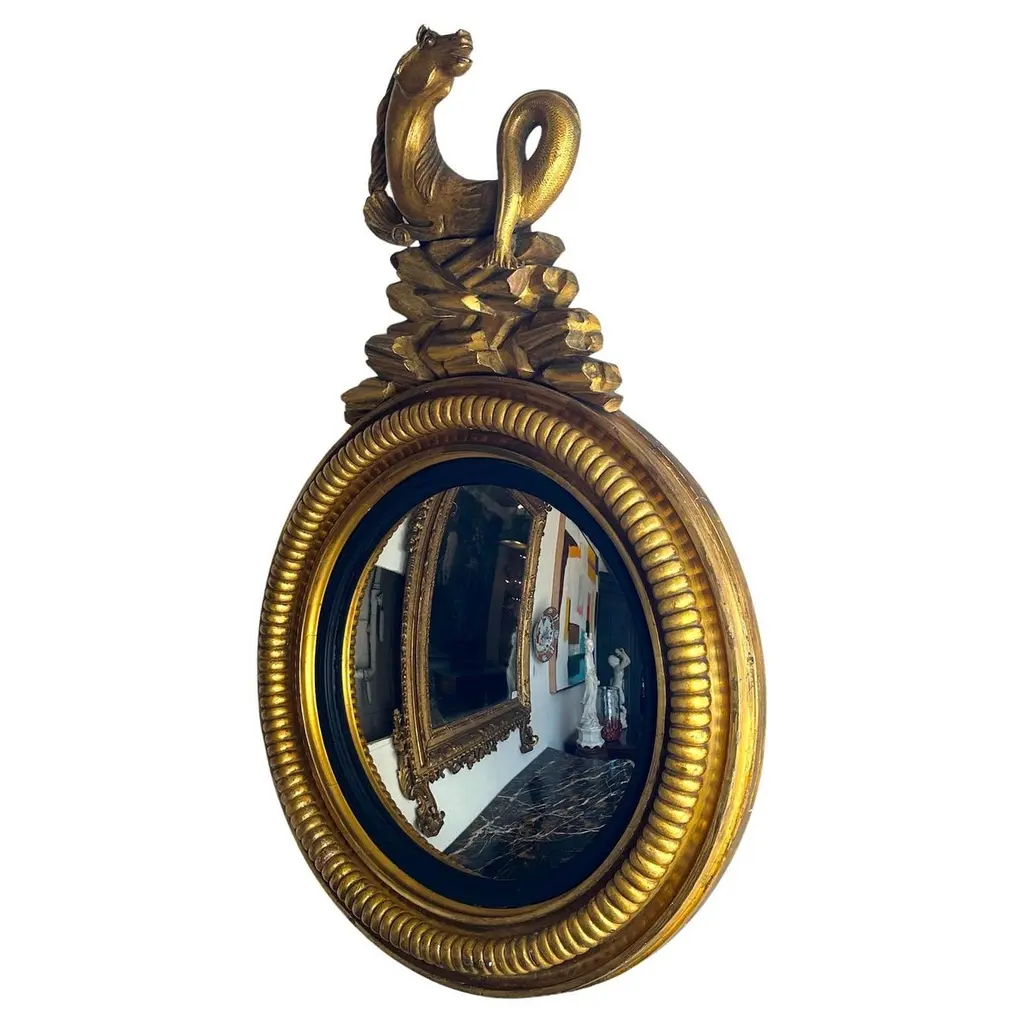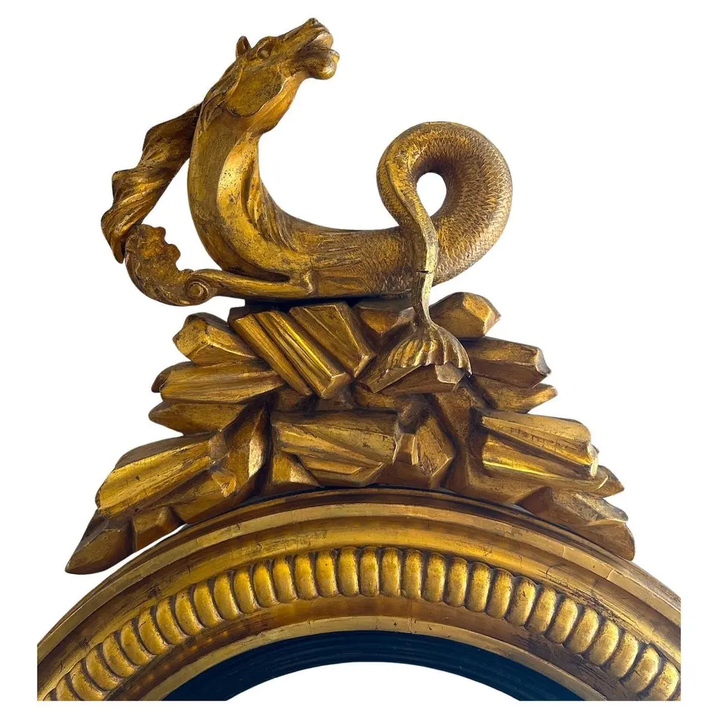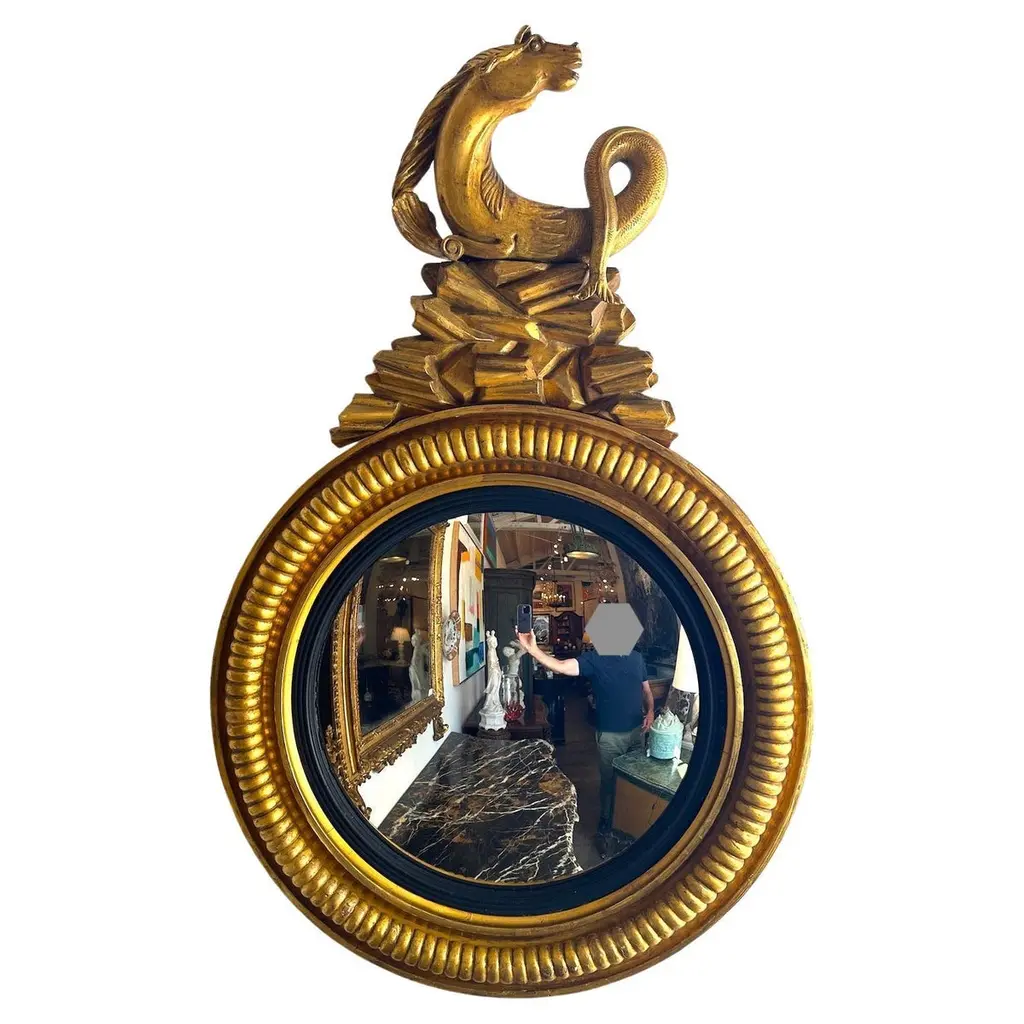 Period hand-carved, English Regency, gilded and painted convex mirrors topped with hippocampus. Sold separately.