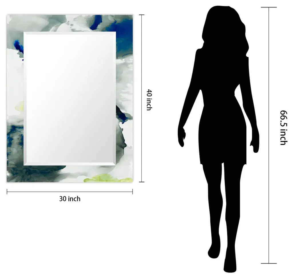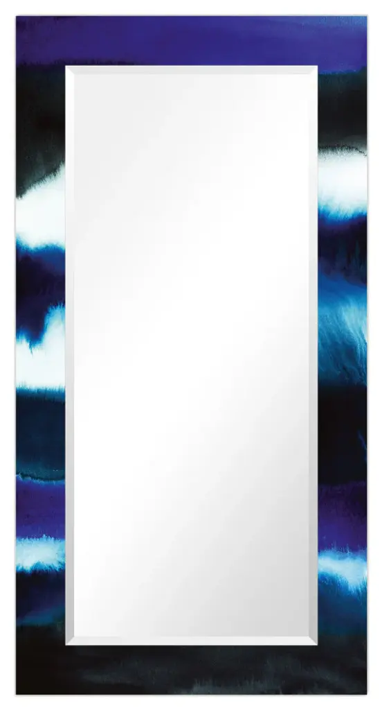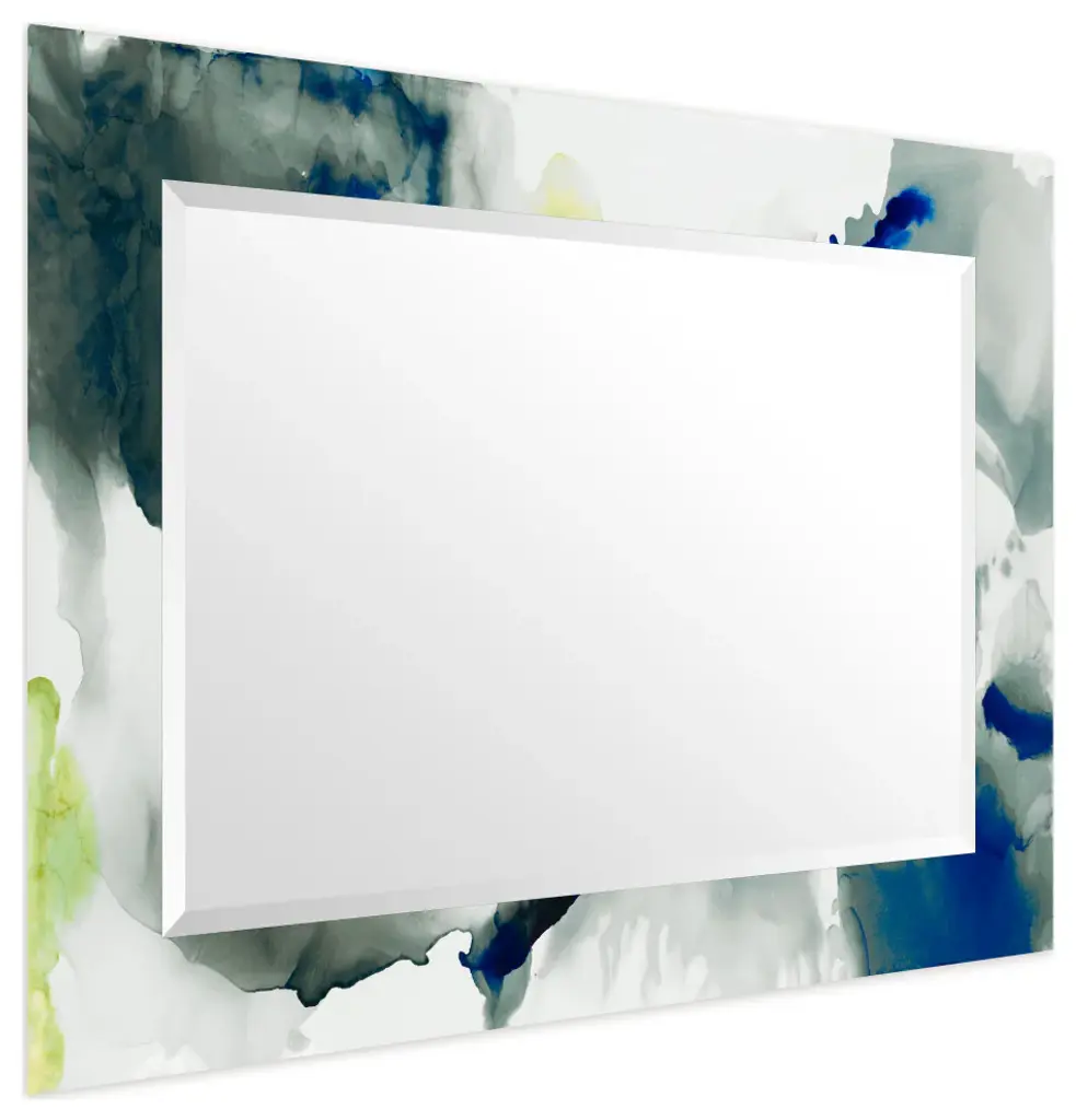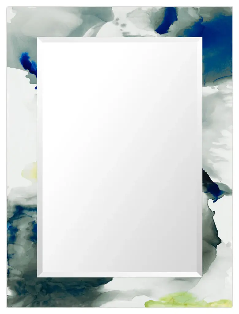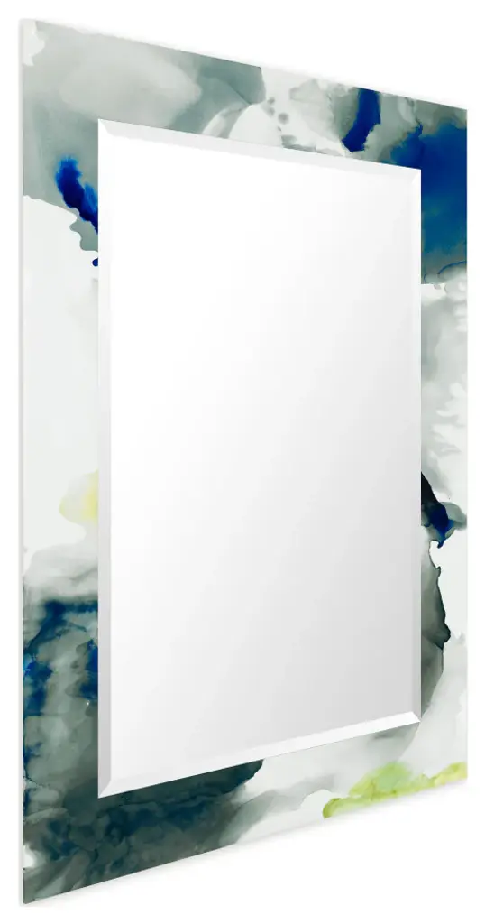 Empire Art Direct"™s collection of printed, frame-less, free floating, tempered glass was inspired by the French technique of Verre Eglomise in which artist''s literally painted the back of clear glass so that when viewed from the front the painting is brought to life under the depth of the glass. This incredible piece by Sisa Jasper takes that same tempered glass and displays a beveled mirror, centered in front of a beautiful blue and grey abstract. 4 strong steel hangers are attached to the back of the mirror for a quick and easy vertical or horizontal installation.