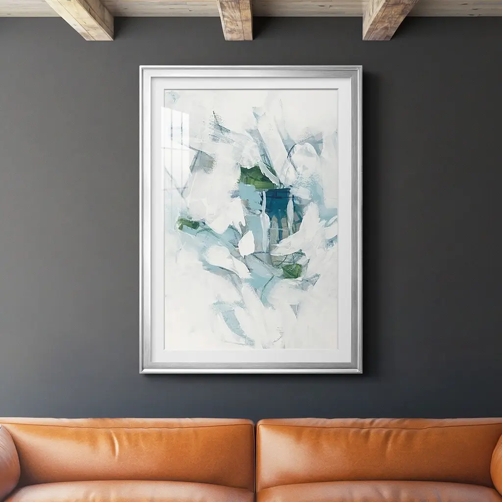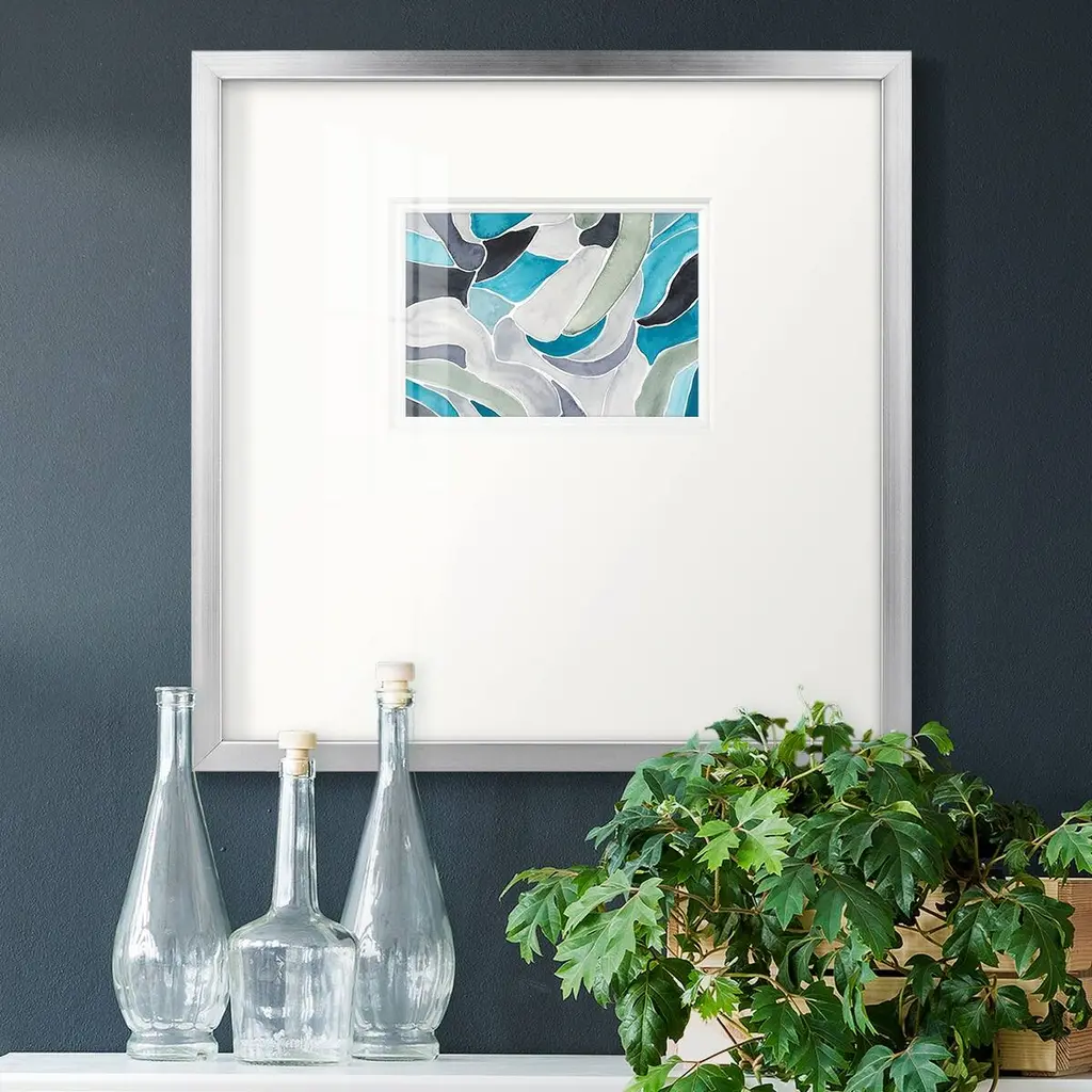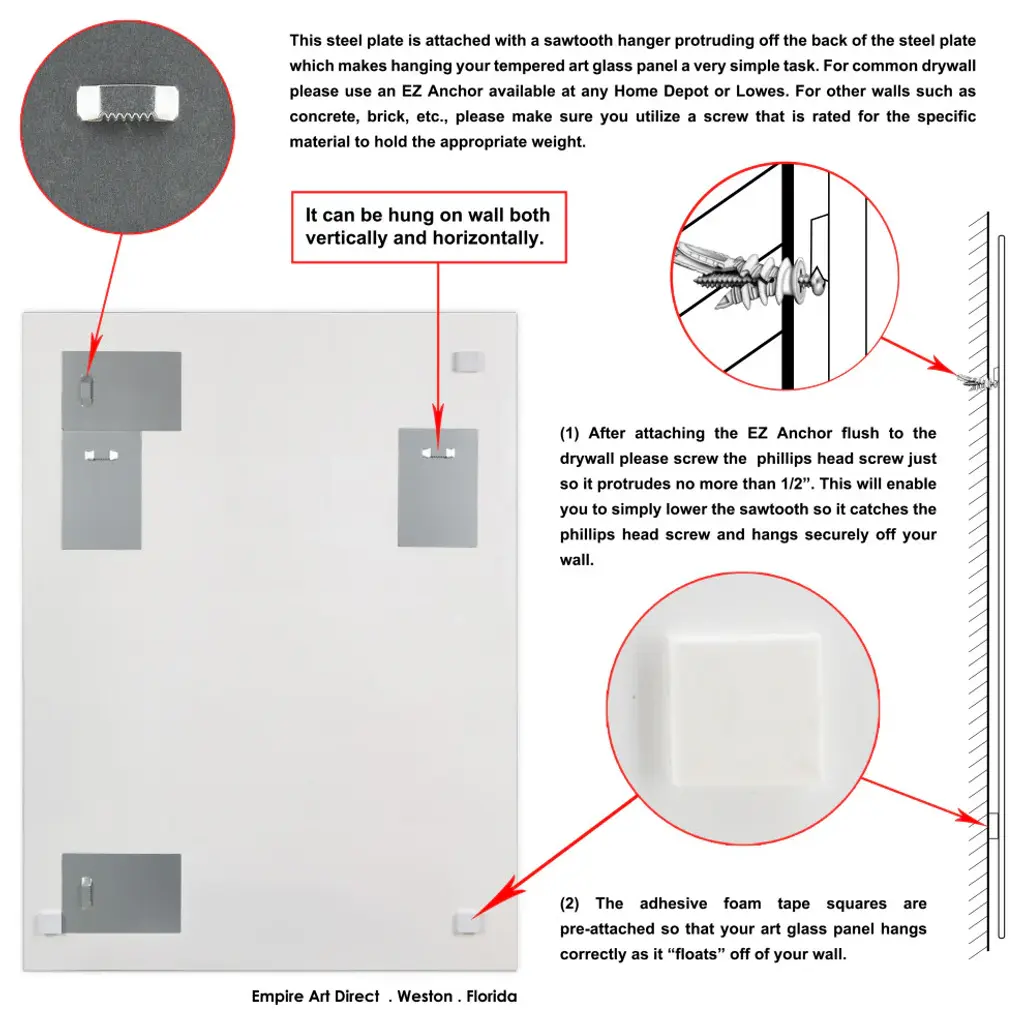 Empire Art Direct"™s collection of printed, frame-less, free floating, tempered glass was inspired by the French technique of Verre Eglomise in which artist''s literally painted the back of clear glass so that when viewed from the front the painting is brought to life under the depth of the glass. This incredible piece by Sisa Jasper takes that same tempered glass and displays a beveled mirror, centered in front of a beautiful blue and grey abstract. 4 strong steel hangers are attached to the back of the mirror for a quick and easy vertical or horizontal installation.