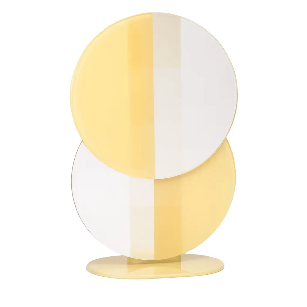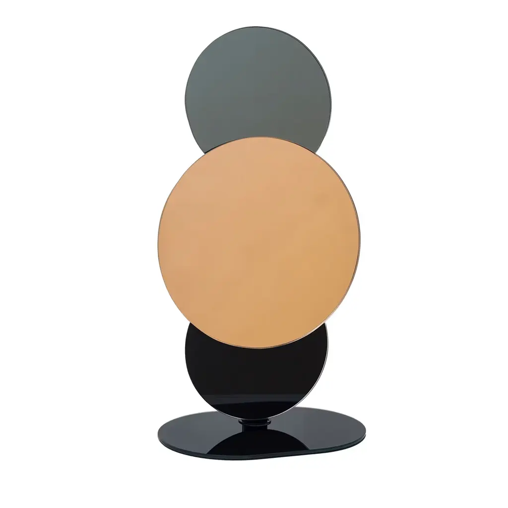Inspired by the concept of equilibrium in more than one way: the balance of the volume and symmetry, where the constructive meets the graphic; the allusion to the anthropological dimension, where the sense of harmony, order, and fulfillment comes from the perfect formal and existential balance. The weightless lightness and two-dimensional form are enhanced by the muted colors, in a perfect playful mix of mirrors and colored glass.