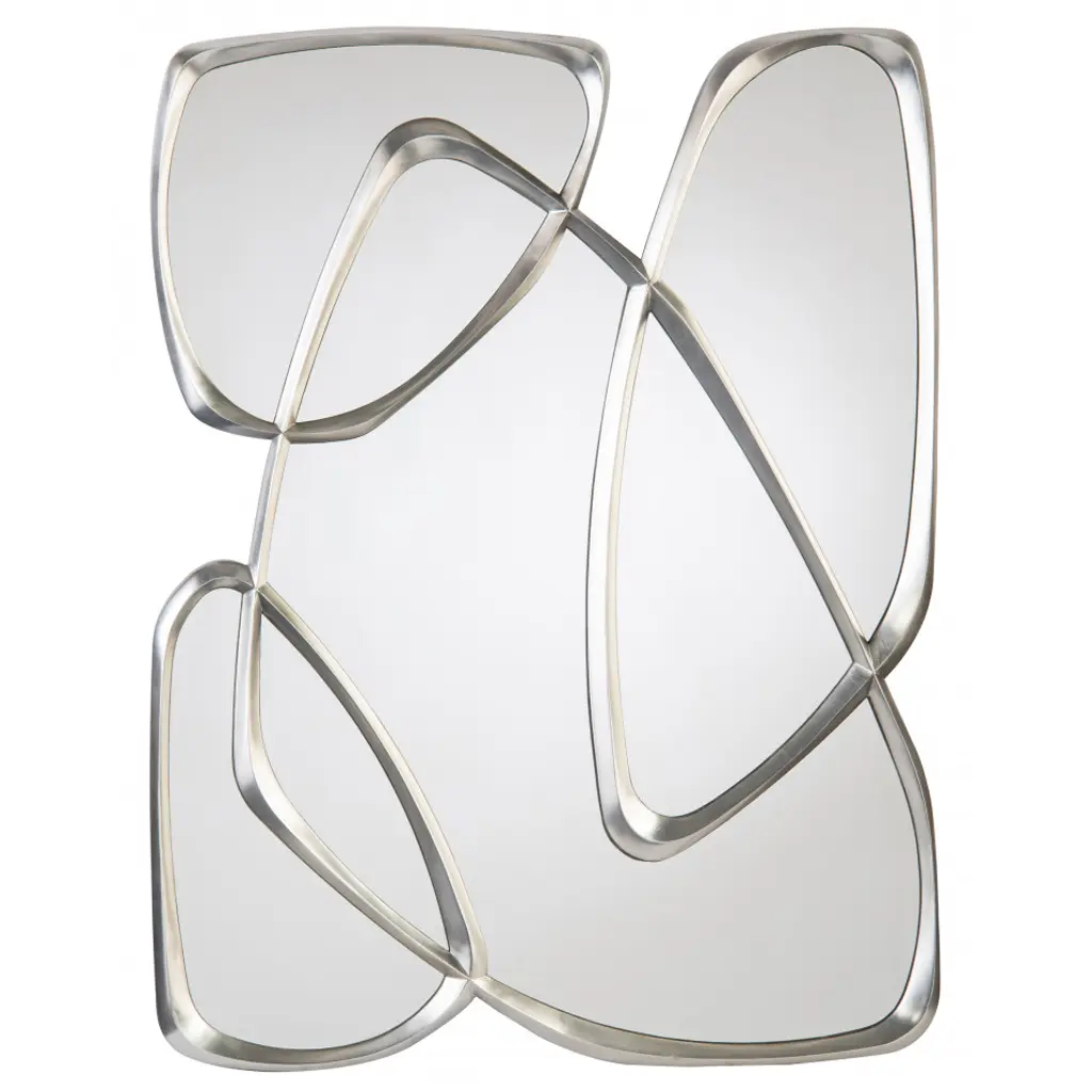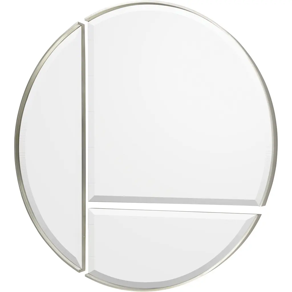 In the form of a partial eclipse, two intersecting circles are framed with delicate cock bead moldings extending past the main rectangular frame. All panes are modern beveled mirror, and the frames are finished in pewter silver. This mirror is designed for portrait or landscape orientation.