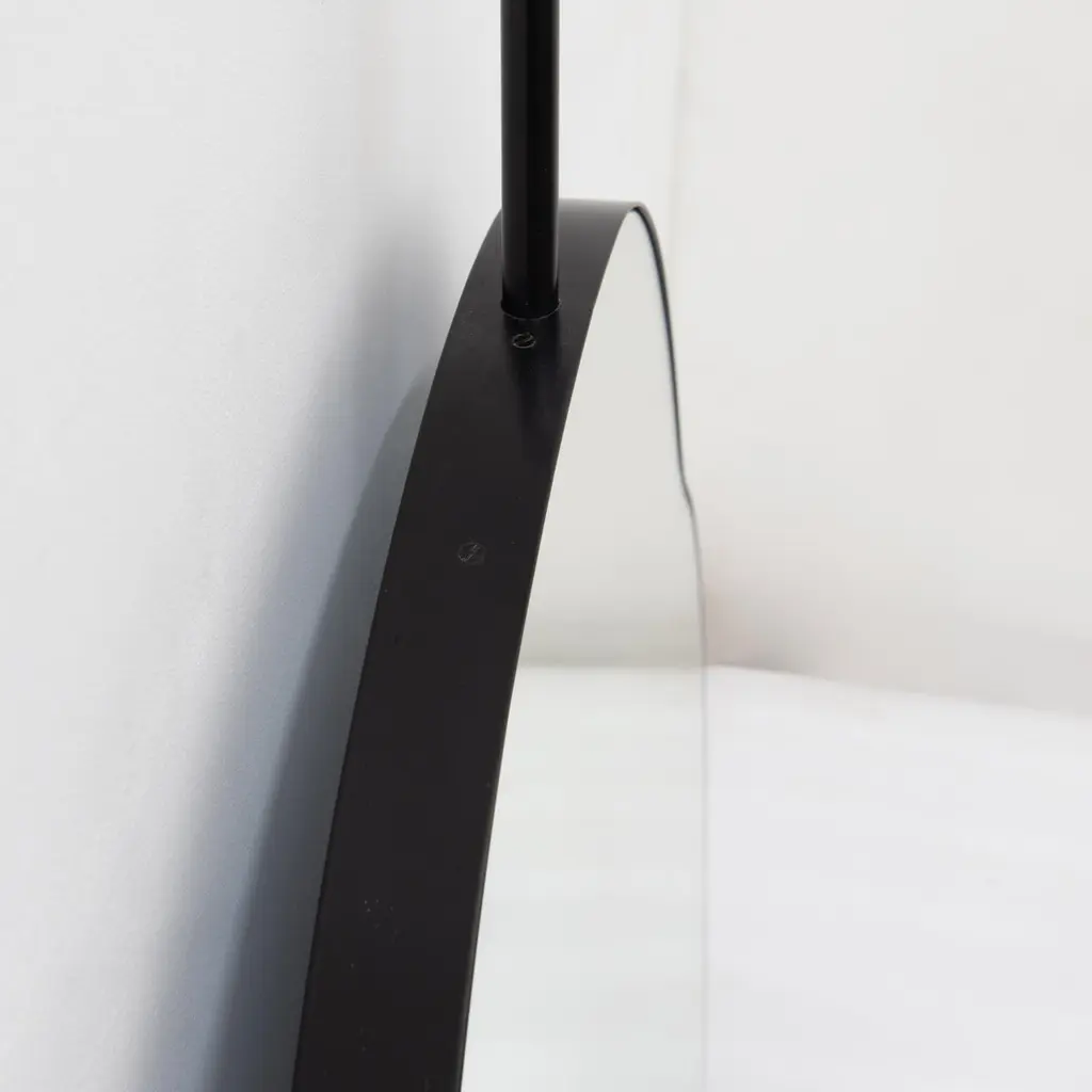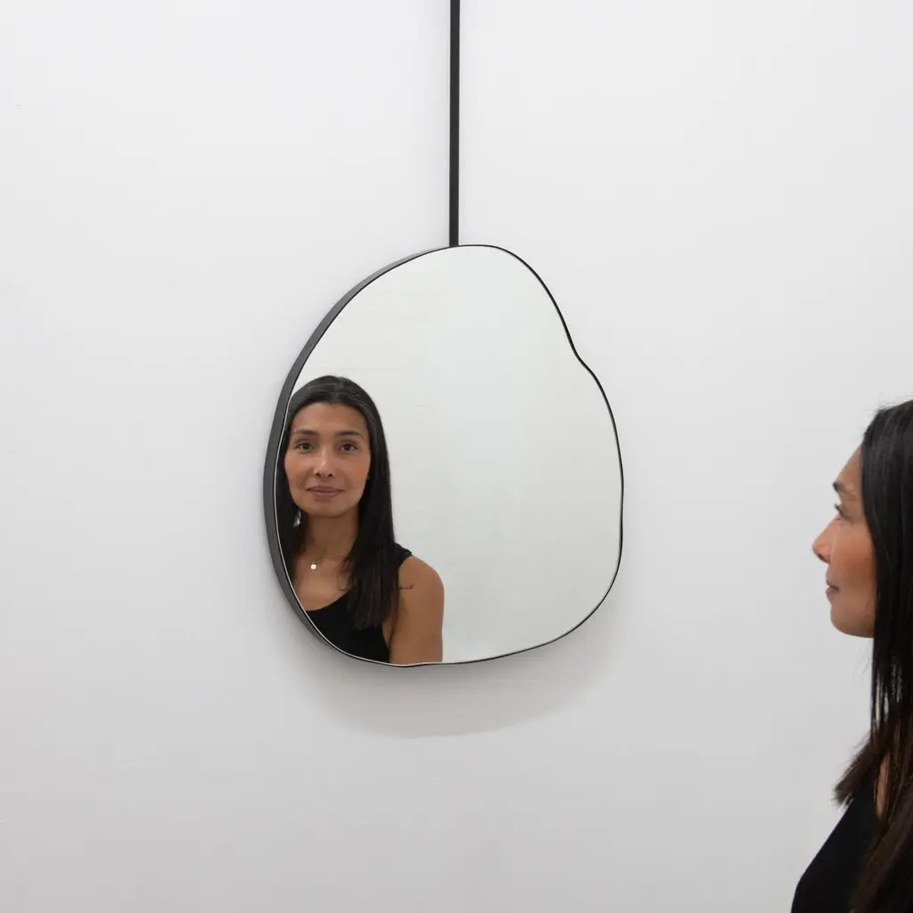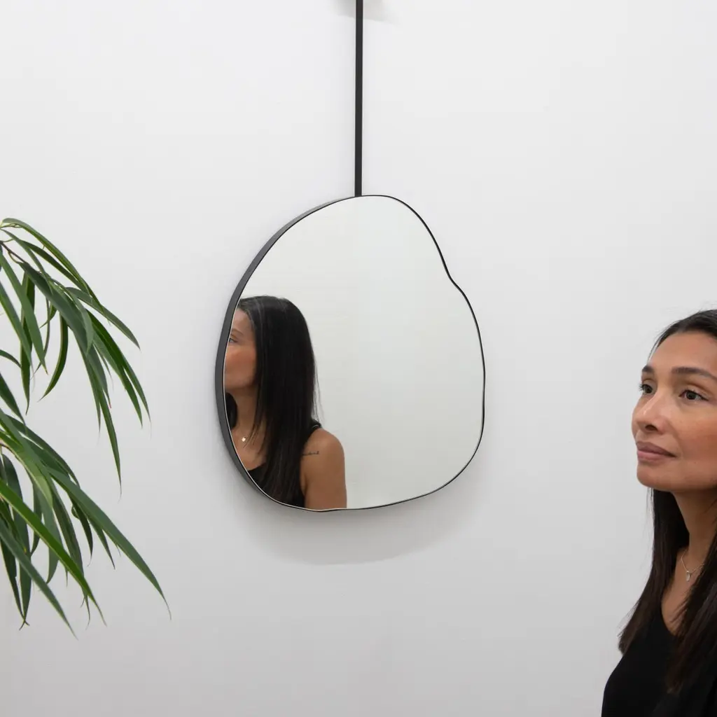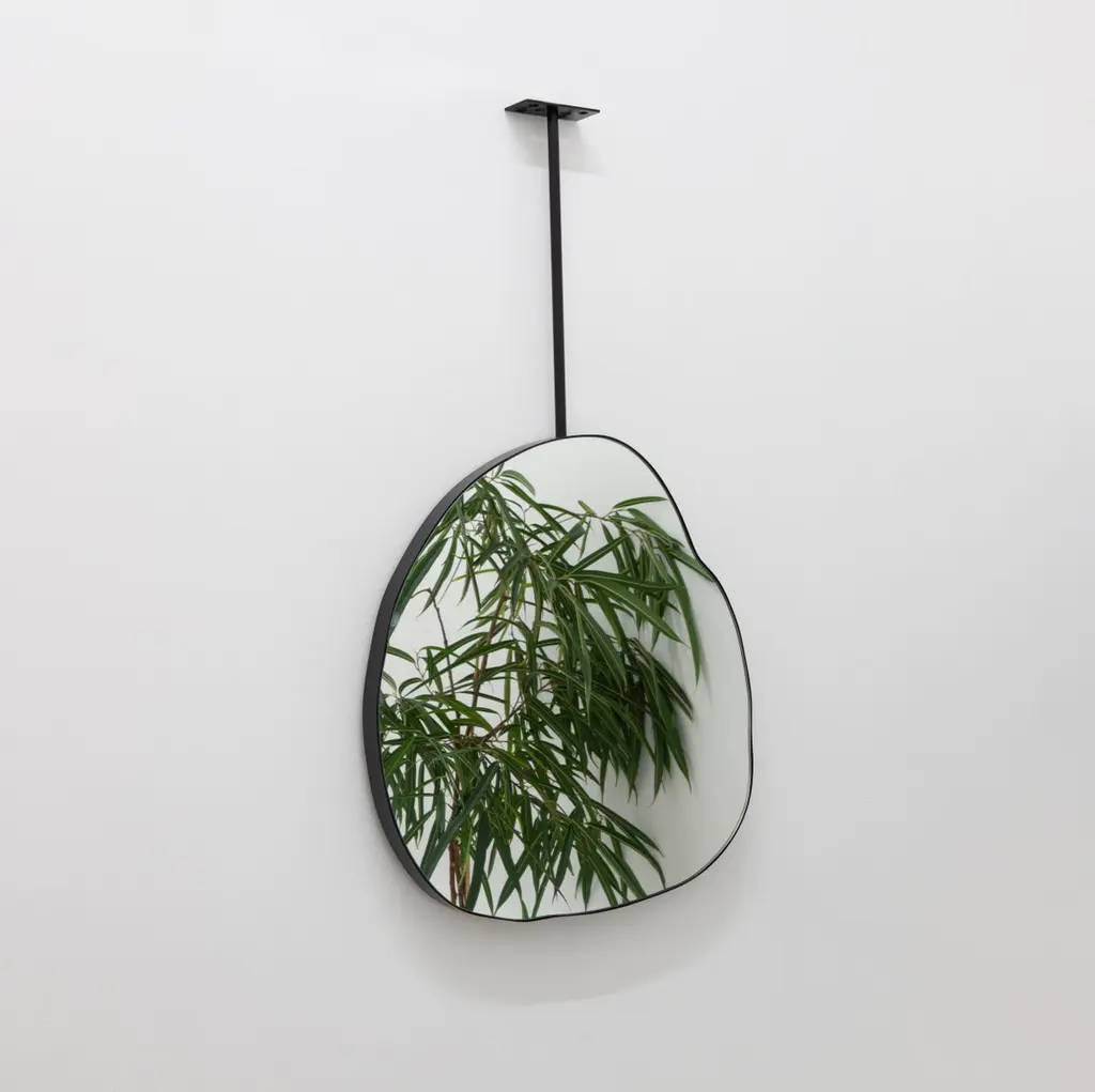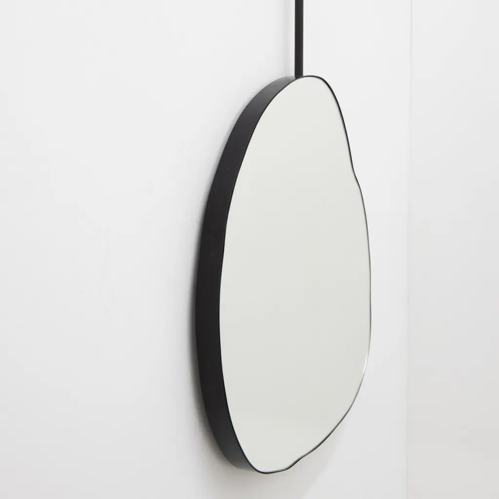 Original and unique organic shaped Ergon™ suspended mirror with a modern matte black frame and panel backing. Our unique collections of ceiling suspended mirrors are designed and handcrafted in London, UK, and are therefore fully customisable to suit the specific requirements of your interior.The dimensions of the illustrated mirror are:• Mirror: 550mm (21.65") Height x 520mm (20.47") Width• Mirror depth: 30mm (1.18”) Frame• Mirror drop: 360mm (14.17") - customisableThe high quality finish of our suspended mirrors extends to their backings, which are made from a powder coated panel available in black or white. Backings can also be upgraded to a finish that matches the frame or can be substituted by a second mirror, making your mirror double sided.The ceiling plate is supplied with a cover hiding the screws to complete the minimalist design of the mirror.Shipped safely and insured worldwide. All our mirrors are made on demand. Fabrication lead time for this mirror is approximately 6 to 7 weeks. Our mirrors are always shipped by courier express. Shipping via courier express typically requires 1 to 2 days to the UK, or 2 to 7 days outside the UK depending on the destination.Available options:•double sided mirror•backing in a finish that matches the frame•frame finishes: brass (brushed, polished or with a bronze patina), copper, stainless steel, blackened metal, powder coated aluminium in a range of standard or bespoke colours•full frame that extends to the front of the mirror•mirror tints: standard silver, black, bronze, blue, rose gold / peach•back-illumination creating a halo effect•front-illumination around the periphery of the mirror•ON/OFF sensor switch•demister pad•bevelA presentation illustrating the options above is also available on demand. Please contact us for a quote for any bespoke specification or added options.IMPORTANT NOTES:-This suspended mirror is intended to be mounted onto the ceiling and cannot be installed onto a countertop. Countertop mounted mirrors are available on demand.-The illumination offered with our mirrors is decorative or intended to create mood lighting in the room that they are installed in.ORDERS OF MULTIPLE MIRRORS OF THE SAME TYPE: Please contact us to receive a Packing and Shipping quote when ordering multiple mirrors of the same type. An order for multiple mirrors of the same type may not be accepted without extra packing and shipping fees. Thank you.