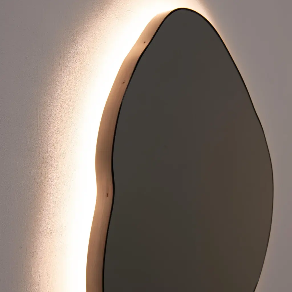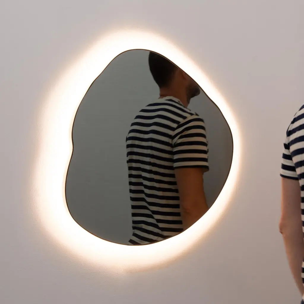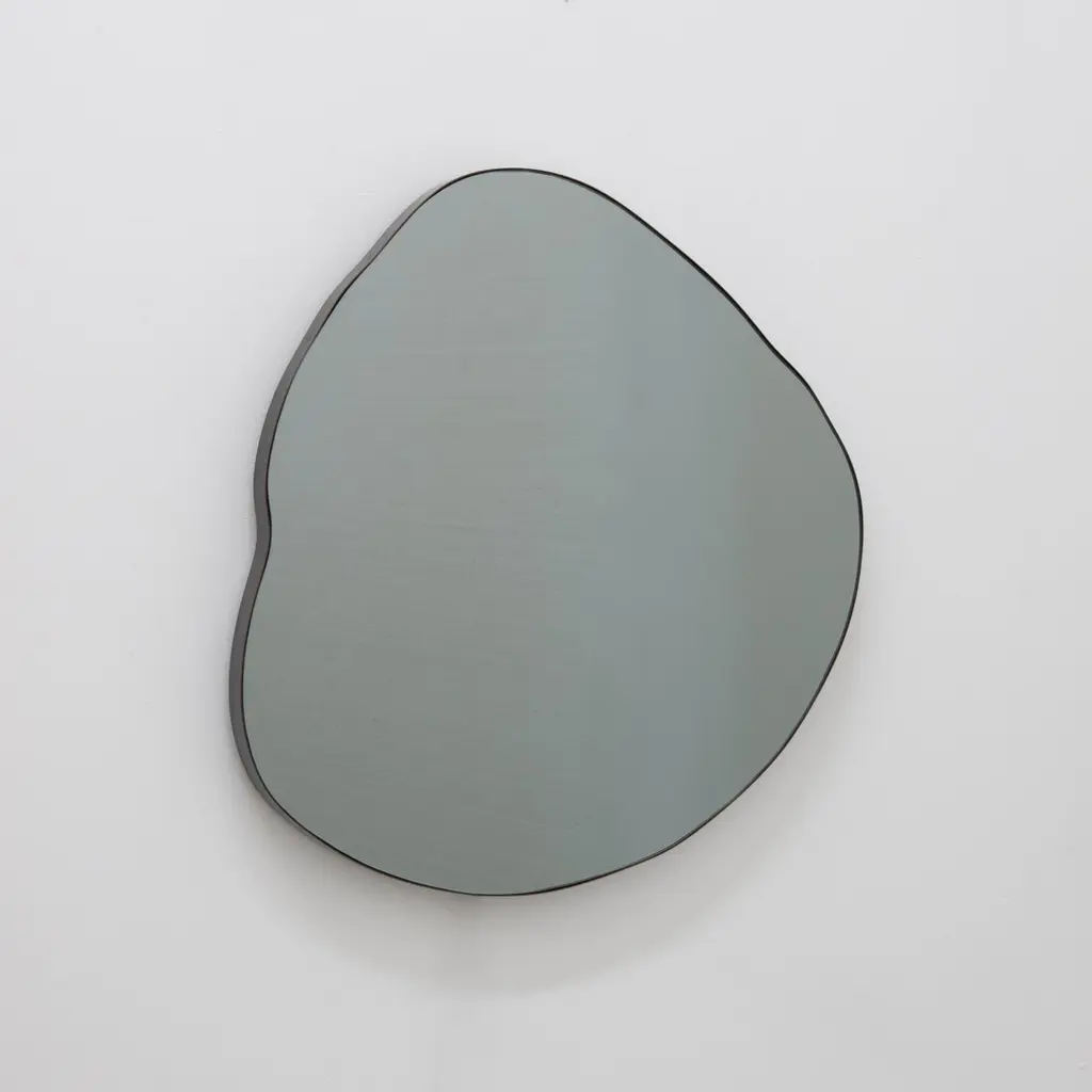 Ergon™ playful and modern organic shaped back illuminated black tinted mirror with a blackened stainless steel frame. Designed and made in London, UK.This mirror is fully customisable.Handcrafted organic shape. Note that this is a handcrafted mirror that may have slight variations in shape, which embrace the irregular characteristics of its organic inspiration.Standard Illumination. The mirror features warm white LED lighting with a colour temperature of 2800–3300K and a power consumption of 14.4W per meter. It has an IP67 rating.Driver. A non-dimmable driver compatible with local voltage is supplied as standard. Alternative drivers — including dimmable versions or different colour temperature options — are available upon request.Fitted with an integrated French cleat (split batten) system that ensures the mirror is securely mounted flush with the wall. An alternative hanging hook is available on demand for mirrors that need to be installed allowing some separation from the wall.Shipped safely and insured worldwide. All our mirrors are made on demand. Fabrication lead time for this particular mirror is approximately 4 to 5 weeks. Our mirrors are always shipped by courier express. Shipping via courier express typically requires 1 to 2 days to the UK, or 2 to 7 days outside the UK depending on the destination.Available sizes:Medium: 60cm x 57.4cm / 23.6" x 21"Large: 80cm x 77cm / 31.5" x 30.3"Extra Large: 100cm x 95.8cm / 39.4" x 37.1"Depth 2.4 cm / 1" (customisable)or any bespoke dimensions.Available options:- frame finishes: brass (brushed, polished or with a bronze patina), copper, stainless steel, blackened metal, powder coated aluminium in a range of standard or bespoke colours- full frame that extends to the front of the mirror- mirror tints: standard silver, black, bronze, blue, rose gold / peach- front-illumination- ON/OFF sensor switch- dimmable driver- demister pad- bevelPlease contact us for a quote for any bespoke specifications or added options.ORDERS OF MULTIPLE MIRRORS OF THE SAME TYPE: Please contact us to receive a Packing and Shipping quote when ordering multiple mirrors of the same type. An order for multiple mirrors of the same type may not be accepted without extra packing and shipping fees. Thank you.