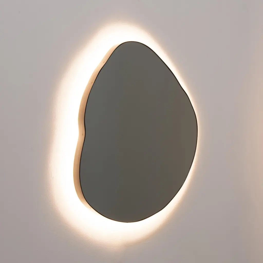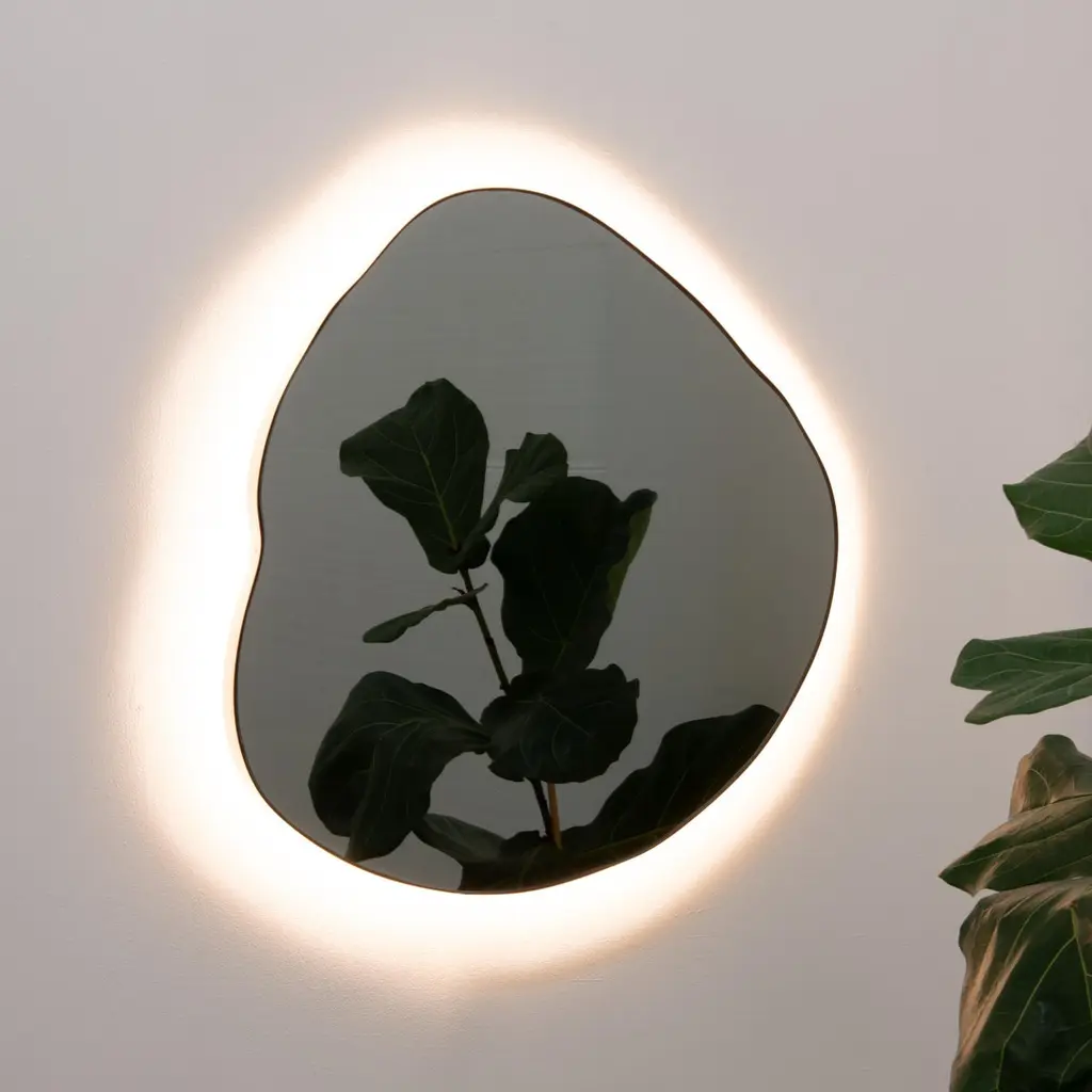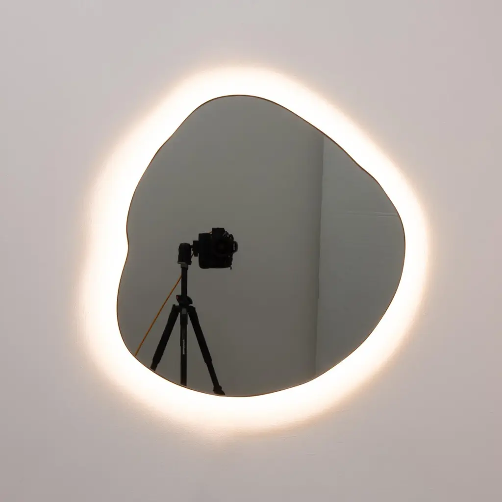 Ergon™ playful and modern organic shaped back illuminated black tinted mirror with a blackened stainless steel frame. Designed and made in London, UK.This mirror is fully customisable.Handcrafted organic shape. Note that this is a handcrafted mirror that may have slight variations in shape, which embrace the irregular characteristics of its organic inspiration.Standard Illumination. The mirror features warm white LED lighting with a colour temperature of 2800–3300K and a power consumption of 14.4W per meter. It has an IP67 rating.Driver. A non-dimmable driver compatible with local voltage is supplied as standard. Alternative drivers — including dimmable versions or different colour temperature options — are available upon request.Fitted with an integrated French cleat (split batten) system that ensures the mirror is securely mounted flush with the wall. An alternative hanging hook is available on demand for mirrors that need to be installed allowing some separation from the wall.Shipped safely and insured worldwide. All our mirrors are made on demand. Fabrication lead time for this particular mirror is approximately 4 to 5 weeks. Our mirrors are always shipped by courier express. Shipping via courier express typically requires 1 to 2 days to the UK, or 2 to 7 days outside the UK depending on the destination.Available sizes:Medium: 60cm x 57.4cm / 23.6" x 21"Large: 80cm x 77cm / 31.5" x 30.3"Extra Large: 100cm x 95.8cm / 39.4" x 37.1"Depth 2.4 cm / 1" (customisable)or any bespoke dimensions.Available options:- frame finishes: brass (brushed, polished or with a bronze patina), copper, stainless steel, blackened metal, powder coated aluminium in a range of standard or bespoke colours- full frame that extends to the front of the mirror- mirror tints: standard silver, black, bronze, blue, rose gold / peach- front-illumination- ON/OFF sensor switch- dimmable driver- demister pad- bevelPlease contact us for a quote for any bespoke specifications or added options.ORDERS OF MULTIPLE MIRRORS OF THE SAME TYPE: Please contact us to receive a Packing and Shipping quote when ordering multiple mirrors of the same type. An order for multiple mirrors of the same type may not be accepted without extra packing and shipping fees. Thank you.