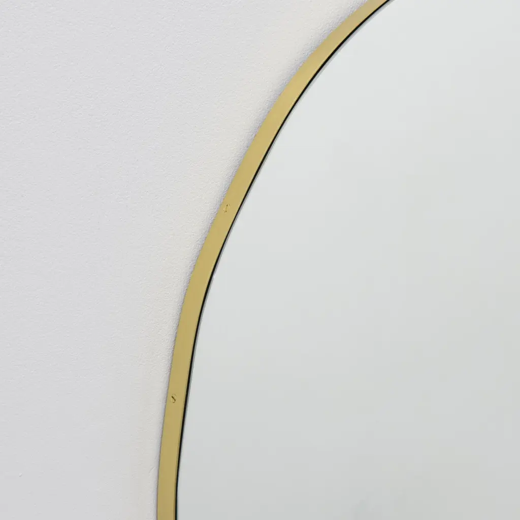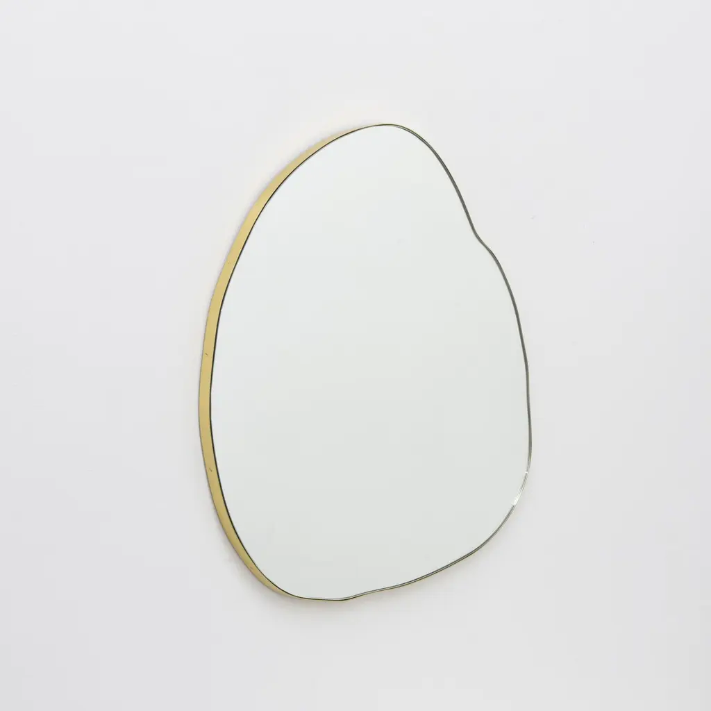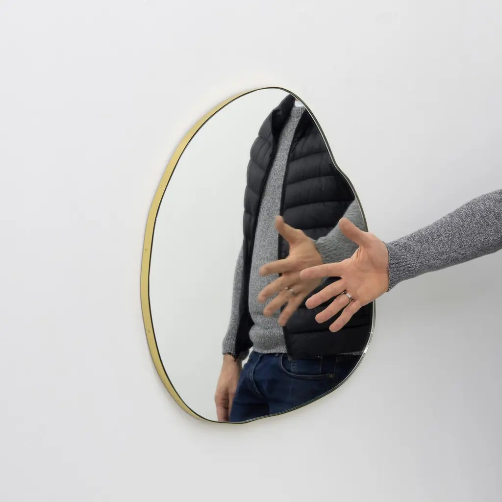 Playful and modern Ergon™ organic shaped mirror with a solid brushed brass frame. Designed and made in London, UK.Our mirrors are designed with an integrated French cleat (split batten) system that ensures the mirror is securely mounted flush with the wall in four possible directions. An alternative hanging hook or a Z-bar (depending on the size of the mirror) is available on demand for mirrors that need to be installed allowing some separation from the wall.Note that this is a handcrafted mirror that may have slight variations in shape, which embrace the irregular characteristics of its organic inspiration.This mirror is fully customisable. The mirror in the images illustrates a medium size, measuring 60cm x 57.4cm / 23.6" x 21".Shipped safely and insured worldwide. All our mirrors are made on demand. Fabrication lead time for this particular mirror is approximately 4 to 5 weeks. Our mirrors are always shipped by courier express. Shipping via courier express typically requires 1 to 2 days to the UK, or 2 to 7 days outside the UK depending on the destination.Prices on the website do not include local taxes and/or applicable import duties for deliveries outside of the United Kingdom.Available sizes:Medium: 60cm x 57.4cm / 23.6" x 21"Large: 80cm x 77cm / 31.5" x 30.3"Extra Large: 100cm x 95.8cm / 39.4" x 37.1"Depth 1.8cm / 0.7" (customisable)or any bespoke dimensions.Available options:- mirror tint: silver, bronze, black, rose gold / peach or blue- frame finish: brushed brass, polished brass, bronze patina, black- bevelling- back-illumination creating a halo effect- demister padPlease contact us for a quote for any bespoke specifications or added options.ORDERS OF MULTIPLE MIRRORS OF THE SAME TYPE: Please contact us to receive a Packing and Shipping quote when ordering multiple mirrors of the same type. An order for multiple mirrors of the same type may not be accepted without extra packing and shipping fees. Thank you.