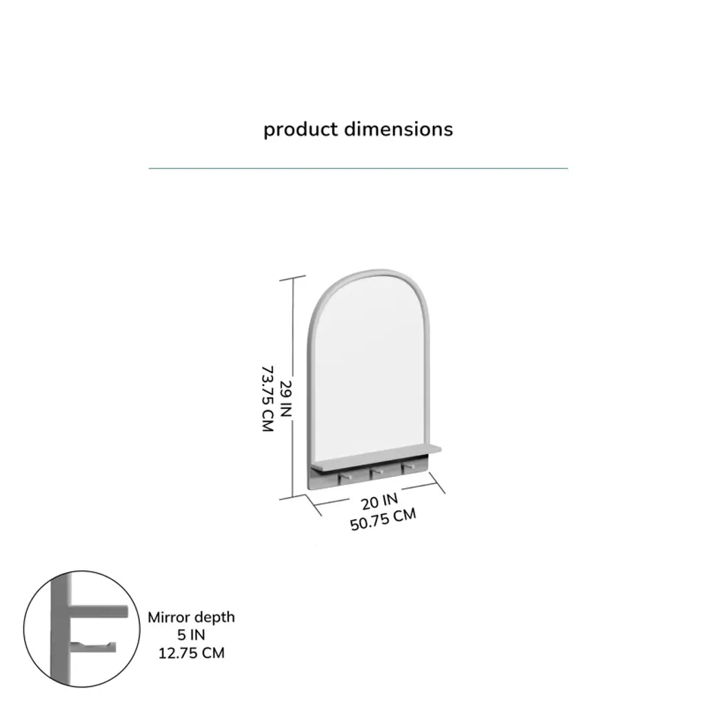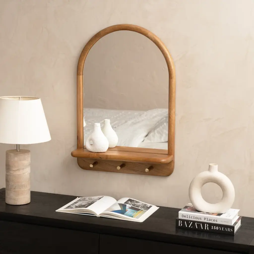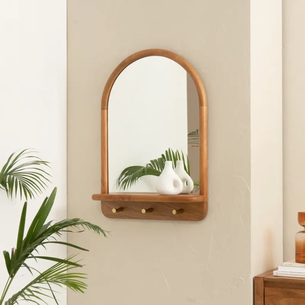LOOKS & HOOKS A mirror that serves looks & functionality–together? We’ve got it covered. Meet our mid-modern mirror that is perfect to be used in any room. Kiln-dried wood all over, it’s thick rounded frame & clear glass is paired with a sturdy shelf & gold plated pegs for extra utility. Hang your keys, coats & bags or perch your wallets, phones & potted plants, this mirror can do it all.