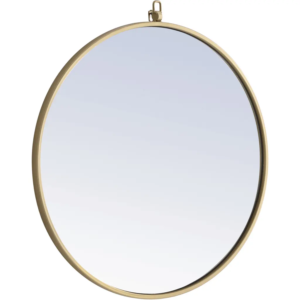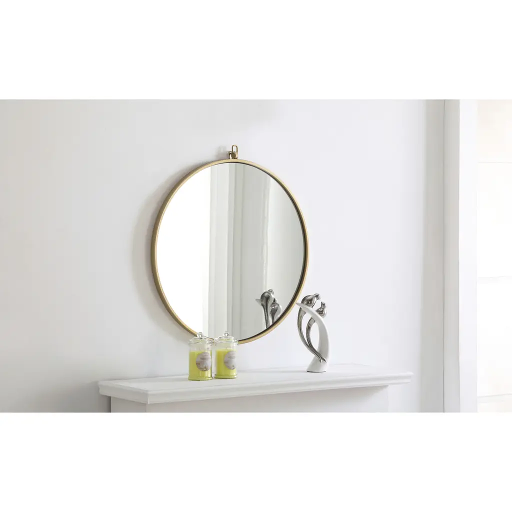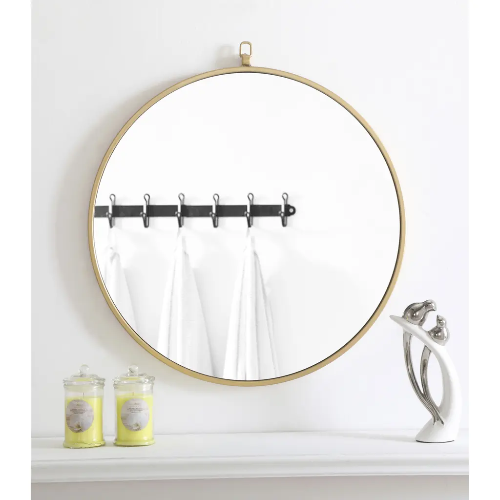 Enhance the appeal of your home or office with this contemporary mirror in brass finish featuring a thin rounded metal edges in a deep profile, reflecting a minimalist's design and trendy styling. To ensure your home safety, we use a metal hanger ring that are securely welded to the back of the metal frame , which sit on top of the frame for easy hanging. We recommend using suitable heavy duty picture/mirror hooks, selecting the best type of fixing for the particular wall you wish to hang the mirror on, using the appropriate rawl plug if required. Measurement: D24.