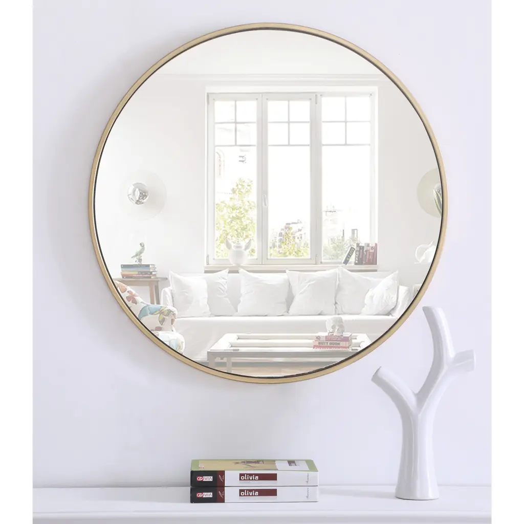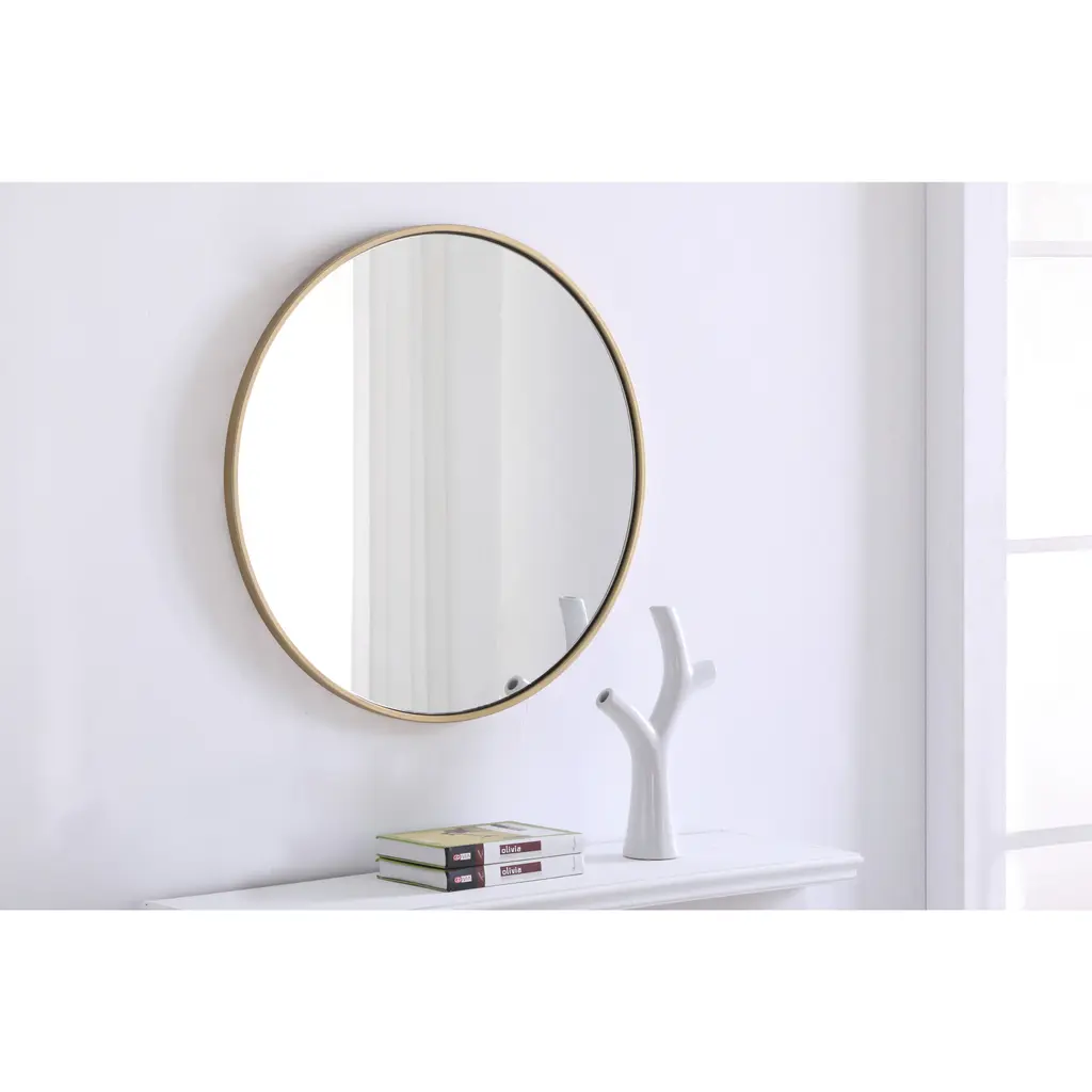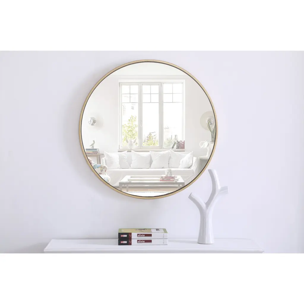 Enhance the appeal of your home or office with this contemporary mirror in brass finish featuring a thin rounded metal edges in a deep profile, reflecting a minimalist's design and trendy styling. To ensure your home safety, we use a metal hanger bar that are securely welded to the back of the metal frame. We recommend using suitable heavy duty picture/mirror hooks, selecting the best type of fixing for the particular wall you wish to hang the mirror on, using the appropriate rawl plug if required. Measurement: D28.