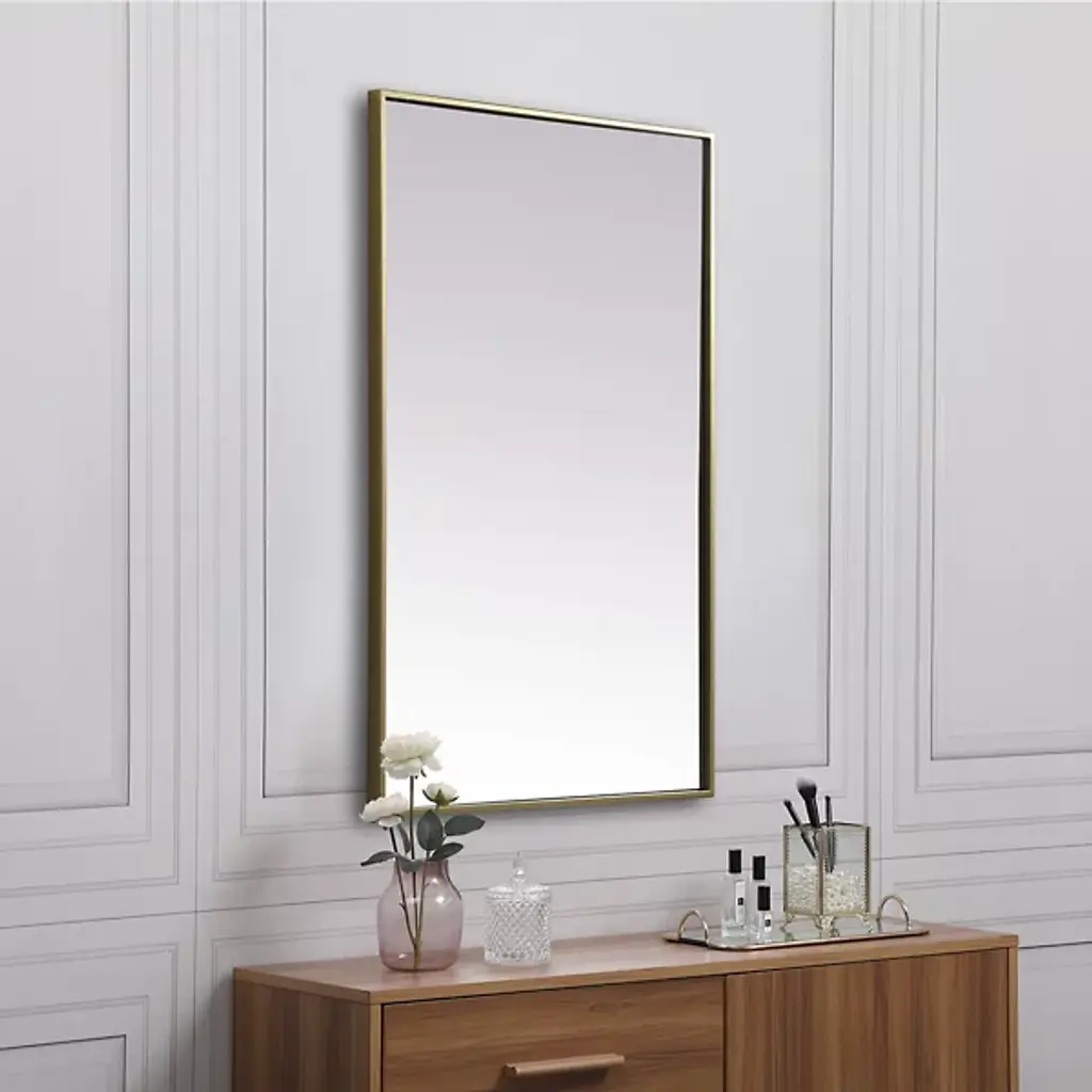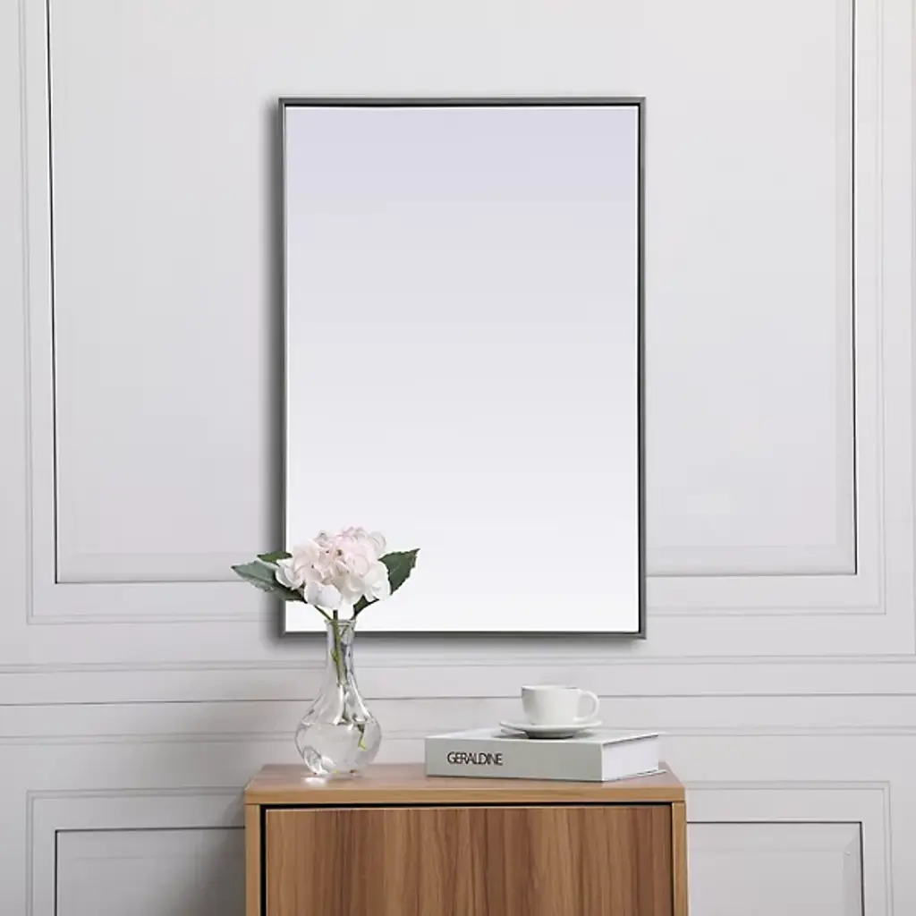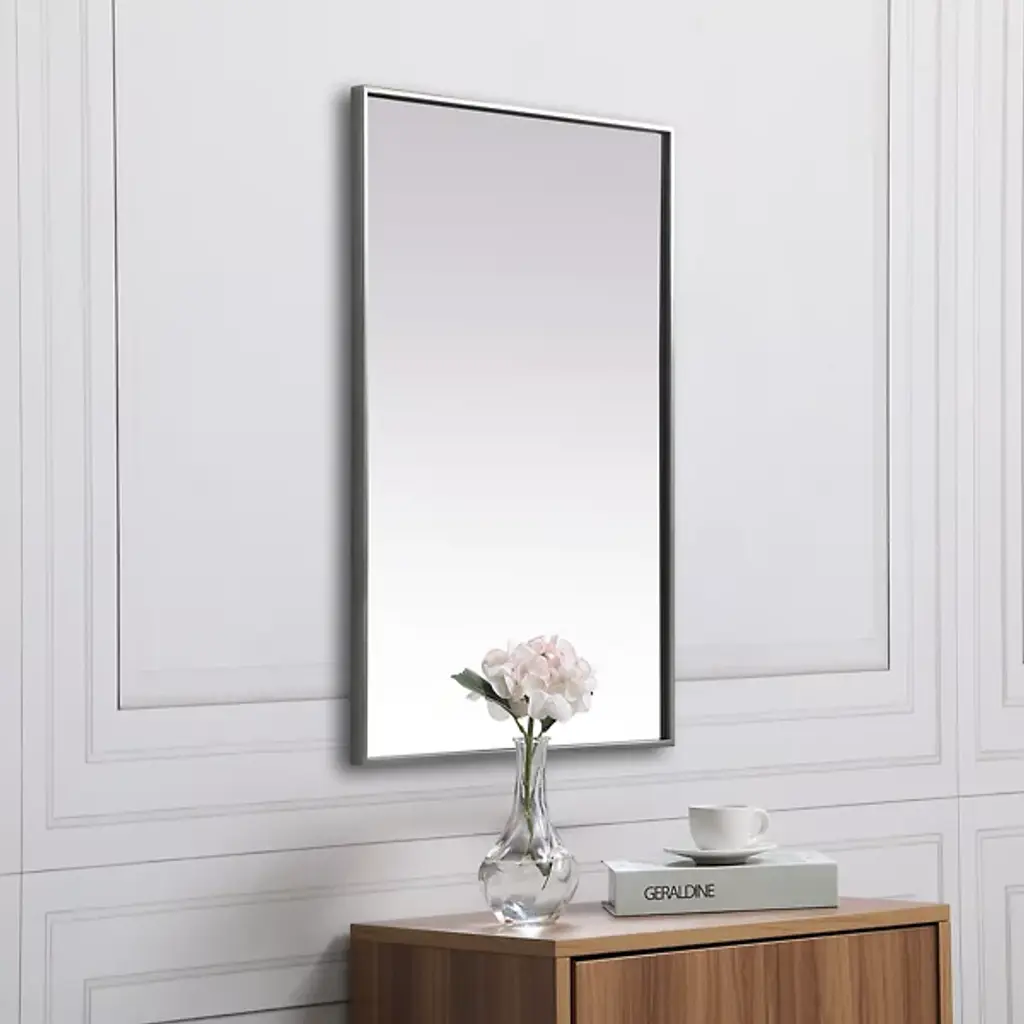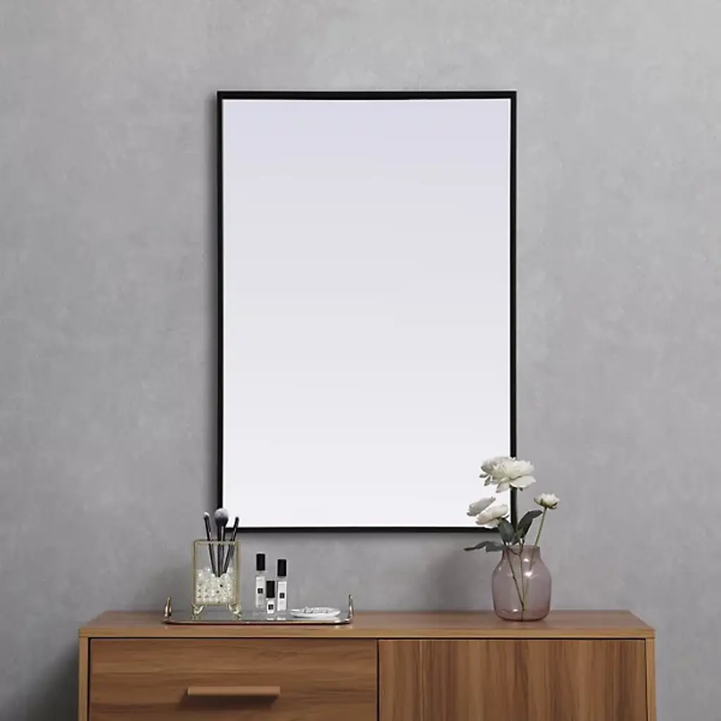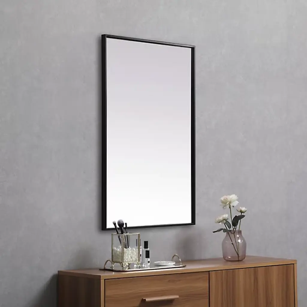 Elevate your home or office decor with the Eternity Rectangle Wall Mirror from Elegant Lighting. It showcases a thin, rounded metal edge in a deep profile for a minimalist, modern touch. A securely welded metal hanger bar on the back ensures safe installation. For optimal stability, use heavy-duty picture hooks and appropriate wall fixings.