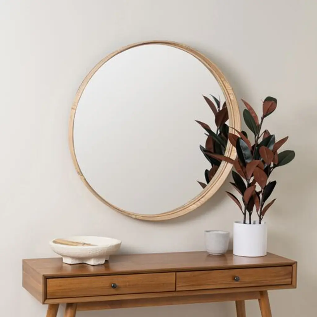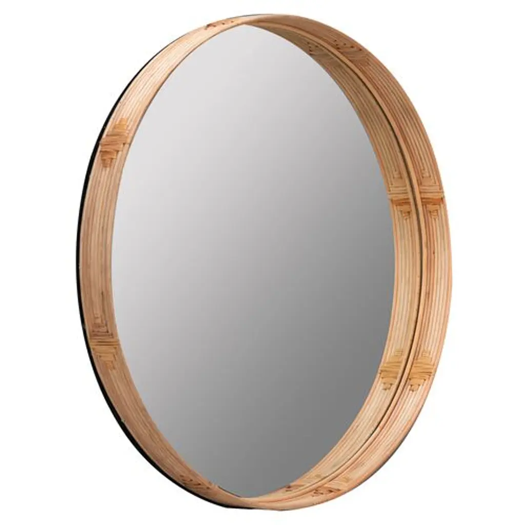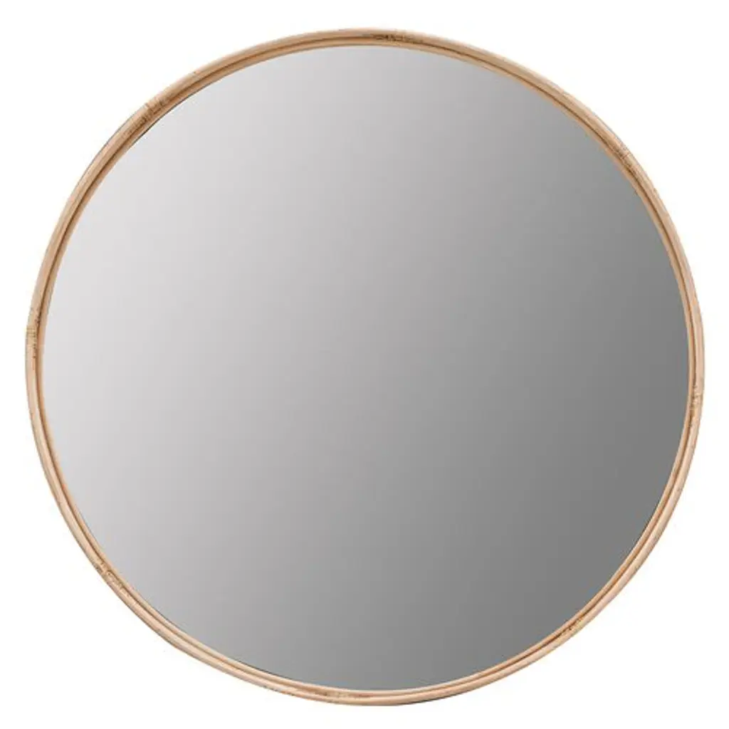 More than three inches deep, this round mirror's rattan frame is embellished with woven accents, adding to its already considered tropical allure.