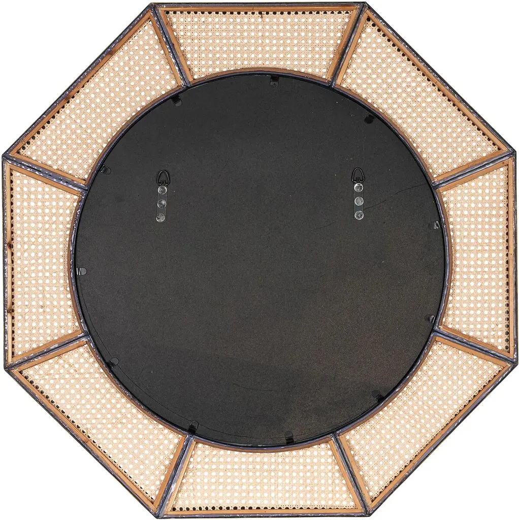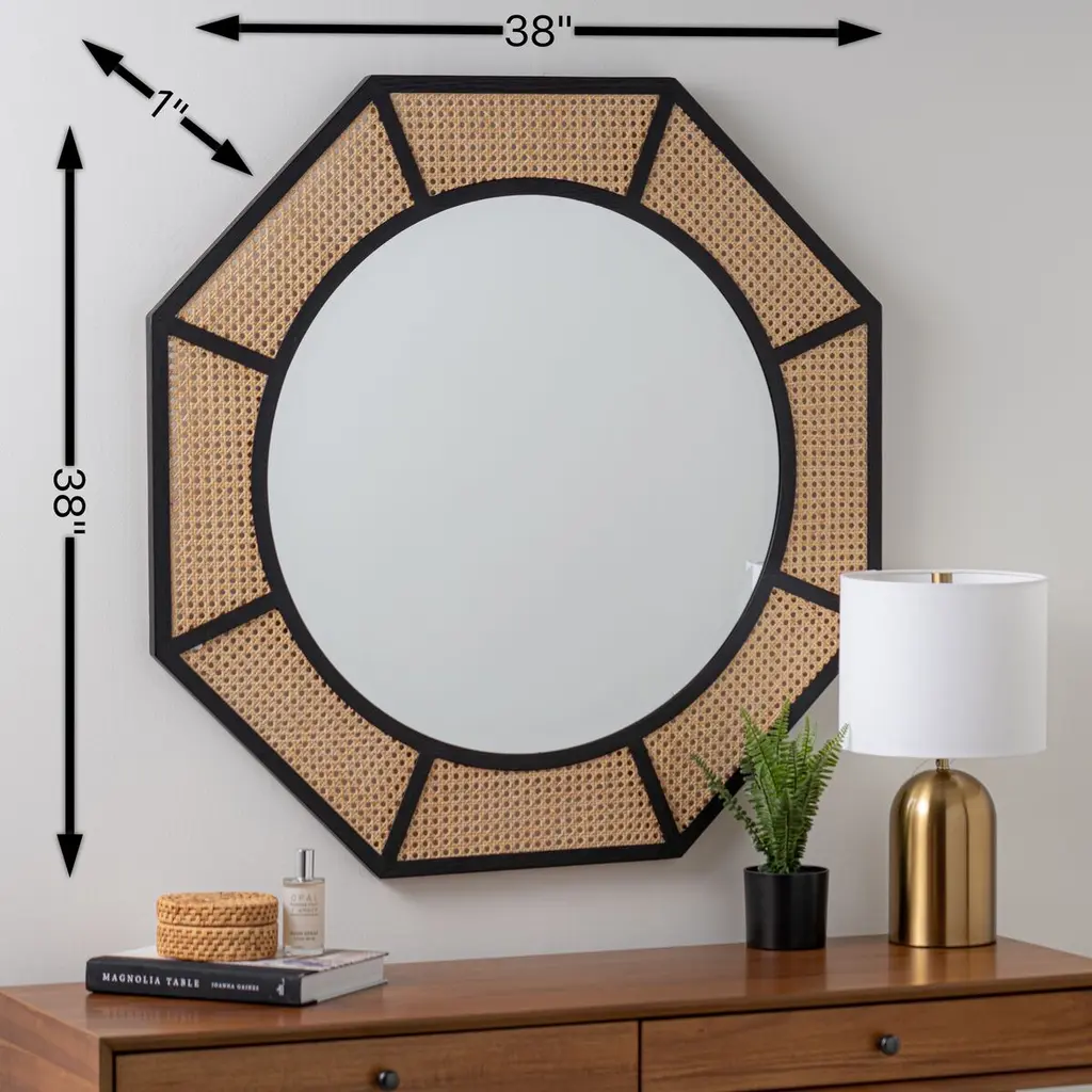 The combination of pale cane and black wood trim gives this octagonal mirror Belle epoque chic. The beveled border of the mirror itself adds to the timeless elegance.