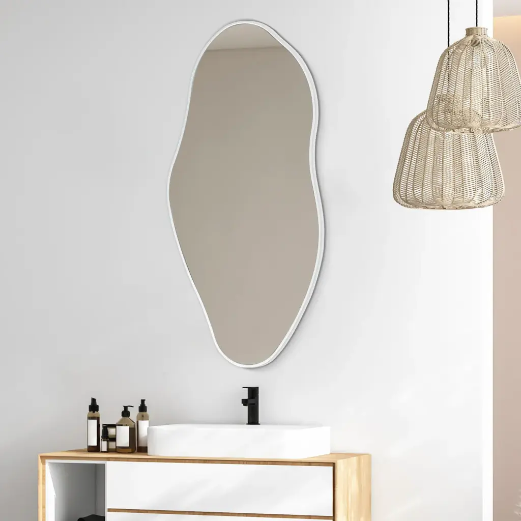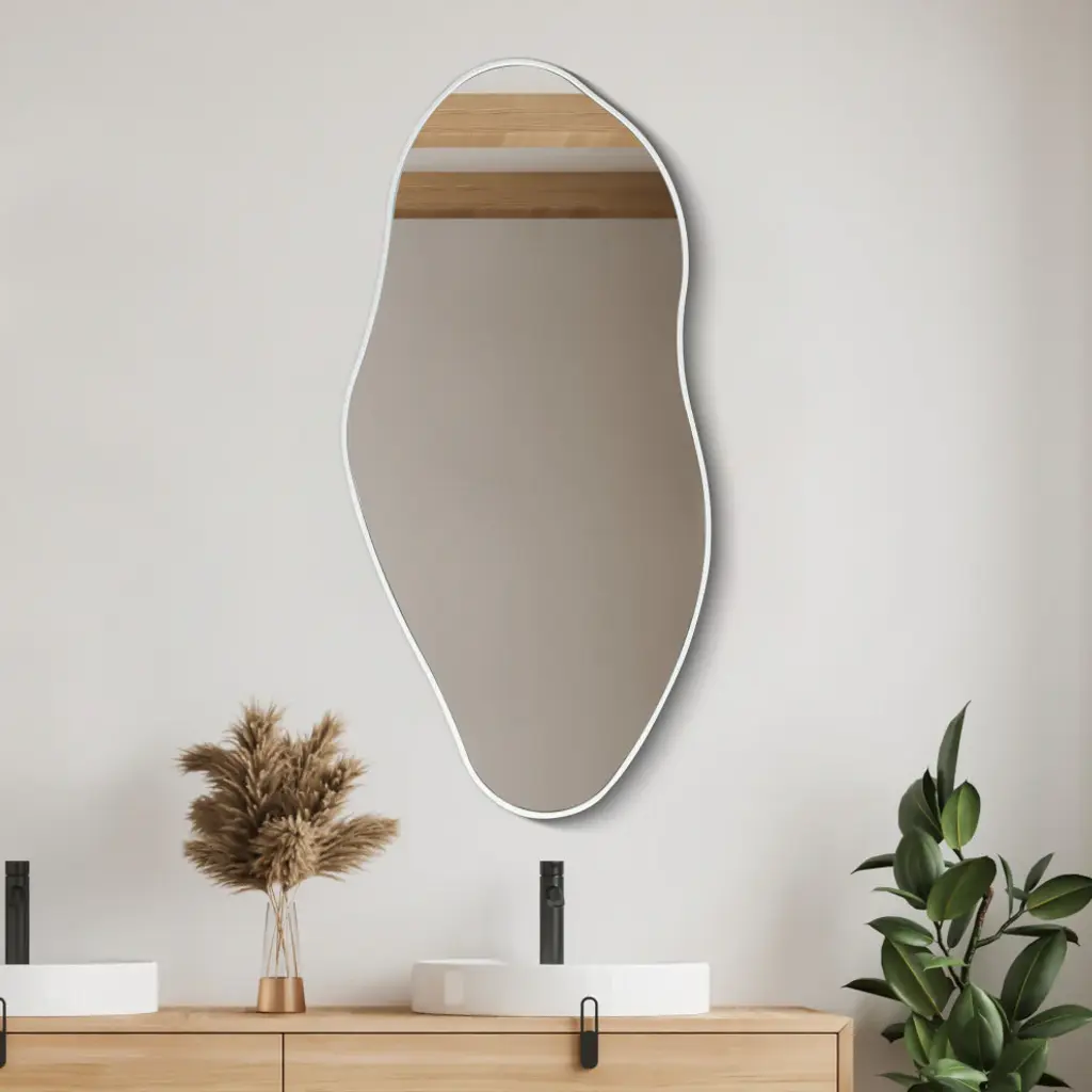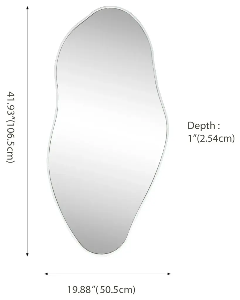 The unique shape of this modern asymmetrical wall mirror adds an Art Deco touch to any space. The soft curves are enhanced by a narrow, sculpted frame. This mirror hangs vertically so it''s ideal for a Livingroom, bedroom or entry area.Features:• Mirrored glass has a minimalist white polypropylene frame• Contemporary wide design provides a broad view that visually expands your space• Add a touch of glam to a bedroom or living room with the sculptured curves of this versatile mirror• Mounting Options: Designed for single-orientation hanging with D-Ring hangers• Hanging device: MDF backboard, 4 triangular hooks• with • Mirror Orientation: Vertical• Body Material: Polypropylene• 41.93 inches high x 19.88 inches wide x 1 inches deepAbout us:You see an ordinary mirror.We see an enhancement to help with making your fashionable statement.A perfectly smooth-edged frame with LED lighting and uniform surface casts a flaring reflection of the subject and surroundings. Our vast mirror catalog includes a variety of designs, shapes and sizes.JONATHAN Y Lighting - a fashion revolution in home decor.