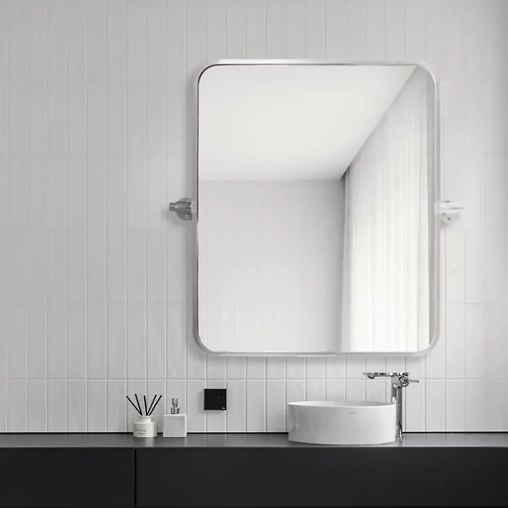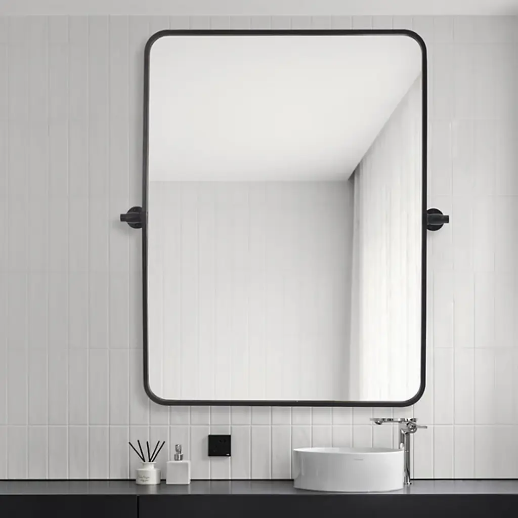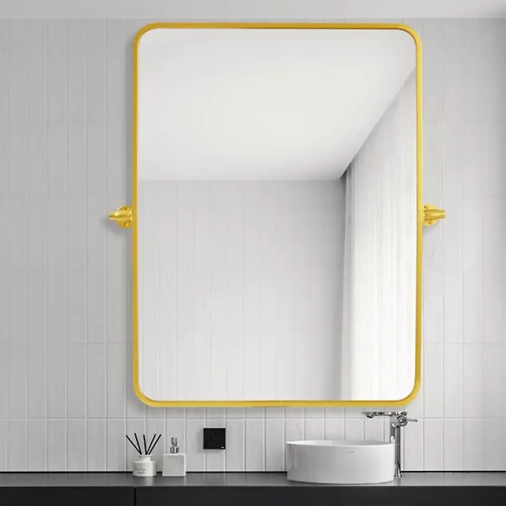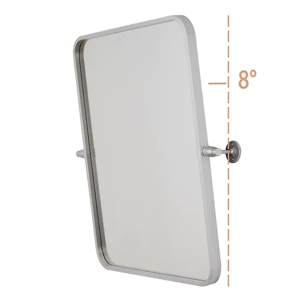 The Everly Soft Corner Wall Mirror from Elegant Lighting incorporates a pivoting mechanism within its softly rounded rectangular frame. Aluminum construction provides corrosion resistance, while dual mounting brackets ensure secure installation. This wall mirror’s eight-degree pivot range allows for precise angle adjustment, accommodating various viewing heights and preferences through its adaptable positioning system.