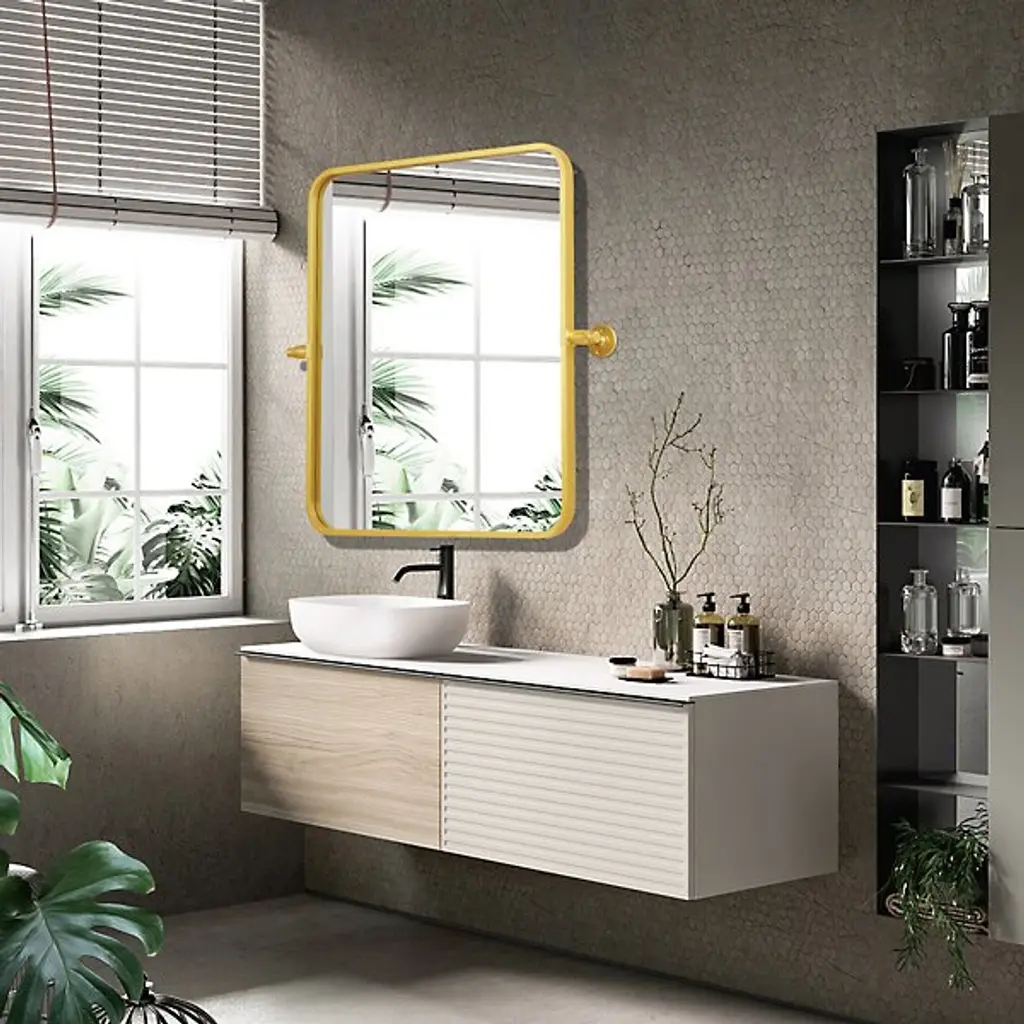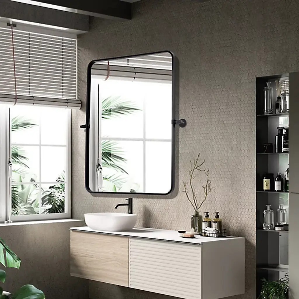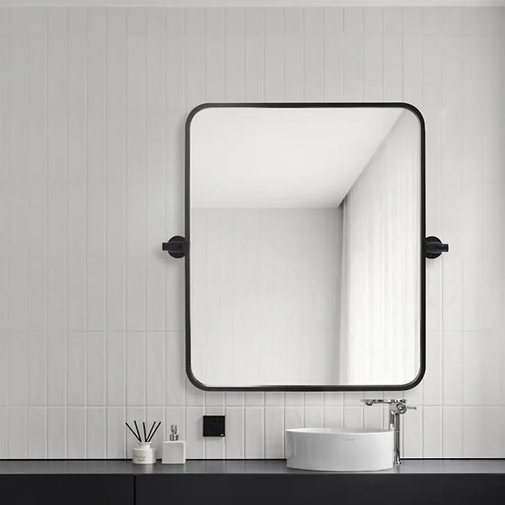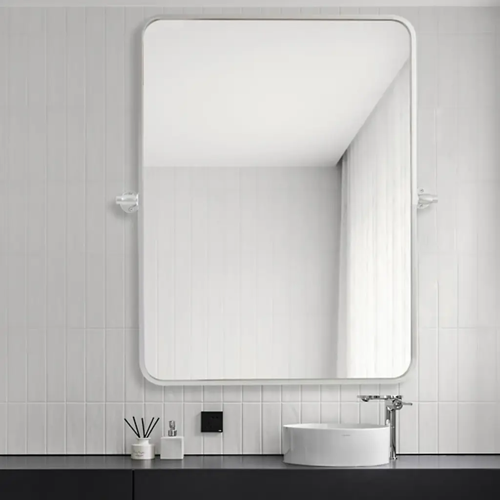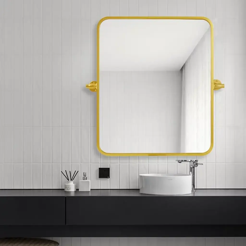 The Everly Soft Corner Wall Mirror from Elegant Lighting incorporates a pivoting mechanism within its softly rounded rectangular frame. Aluminum construction provides corrosion resistance, while dual mounting brackets ensure secure installation. This wall mirror’s eight-degree pivot range allows for precise angle adjustment, accommodating various viewing heights and preferences through its adaptable positioning system.