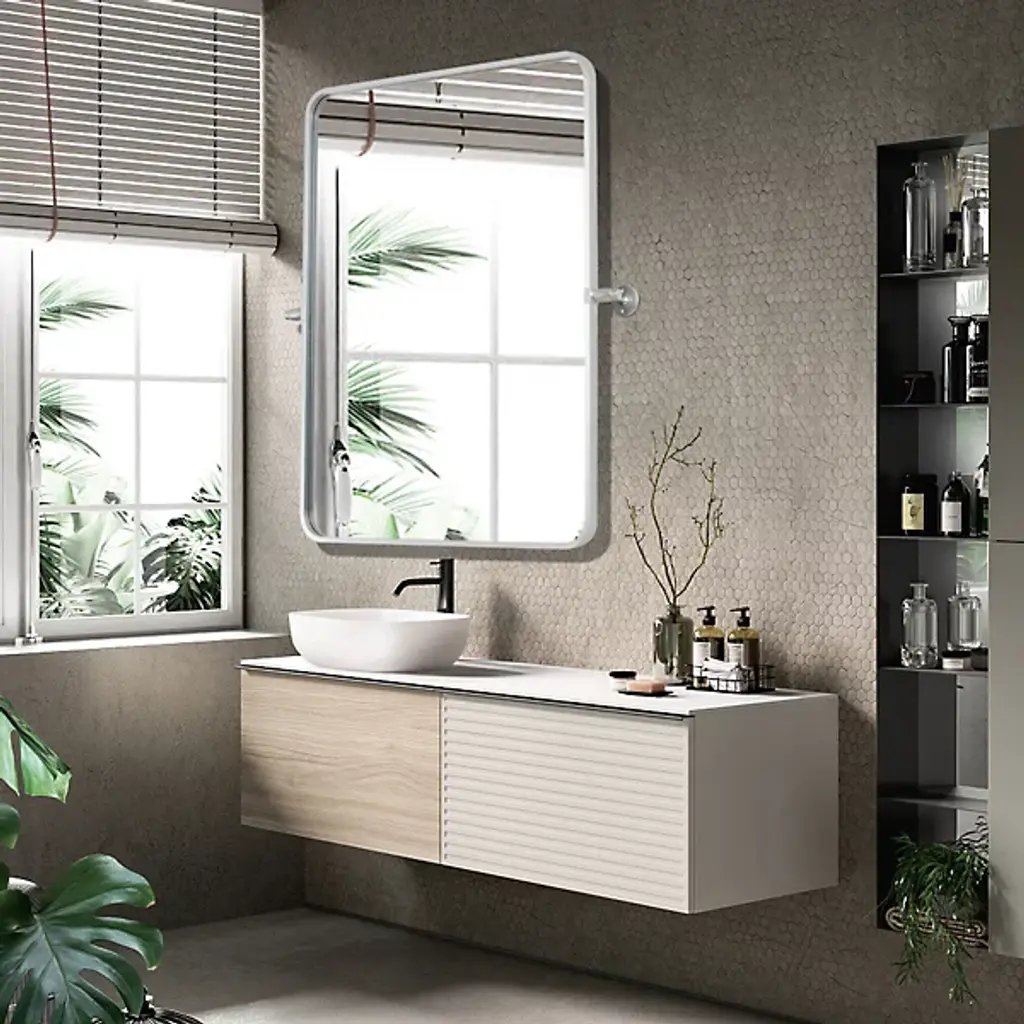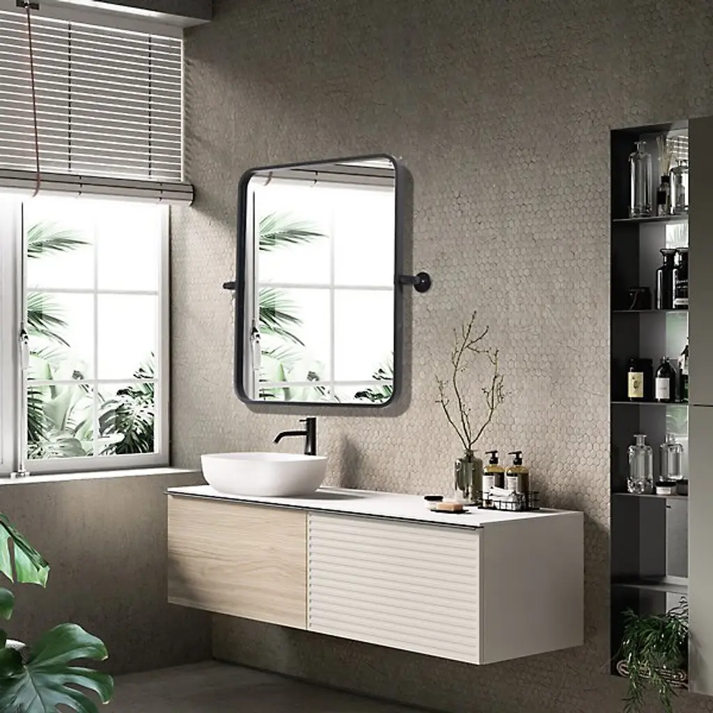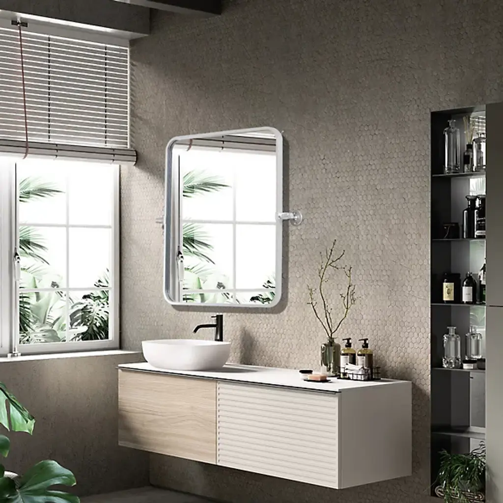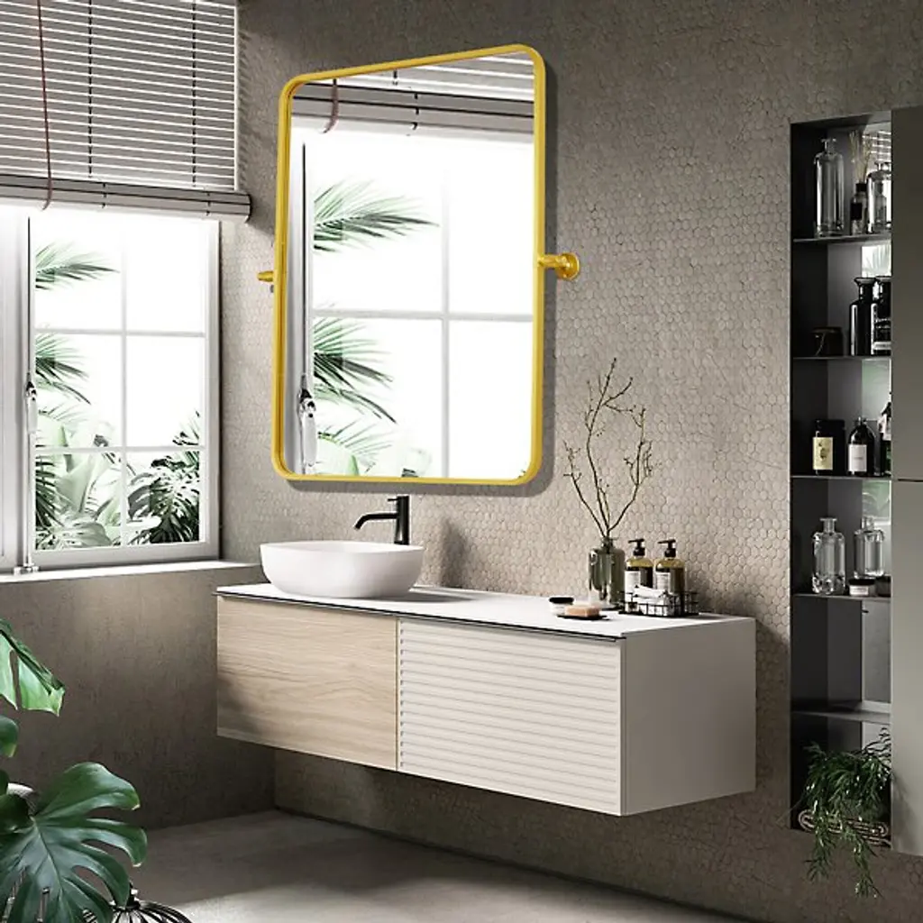The Everly Soft Corner Wall Mirror from Elegant Lighting incorporates a pivoting mechanism within its softly rounded rectangular frame. Aluminum construction provides corrosion resistance, while dual mounting brackets ensure secure installation. This wall mirror’s eight-degree pivot range allows for precise angle adjustment, accommodating various viewing heights and preferences through its adaptable positioning system.