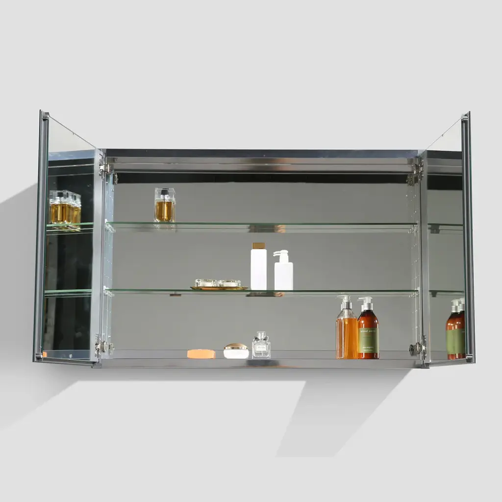Eviva Lazy 40 inch all mirror wall mount/recessed medicine cabinet with no light comes with all sided mirrors. The edges have mirrors and the interior of the medicine cabinet includes a mirror too. The inside of this cabinet features two tempered glass shelves. This mirror can be wall mounted or recessed into the wall. Eviva Lazy is a great choice for most modern bathrooms.
