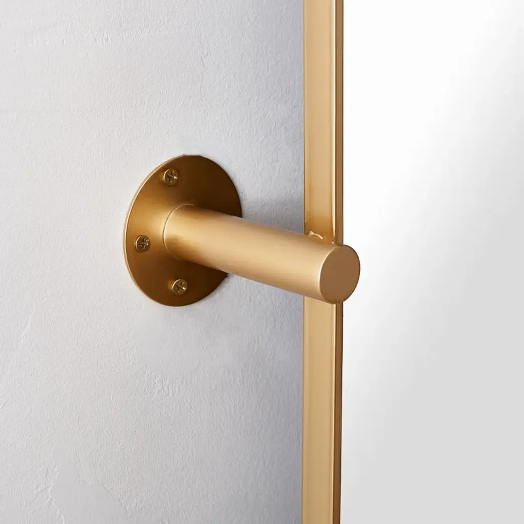A pair of cylindrical posts float this mirror a few inches from your wall, adding a functional accent while creating visual dimension. Its simple rectangular silhouette + slender metal frame keep the focus where it belongs – on your reflection. Ideal for dry spaces like a bedroom or entryway.