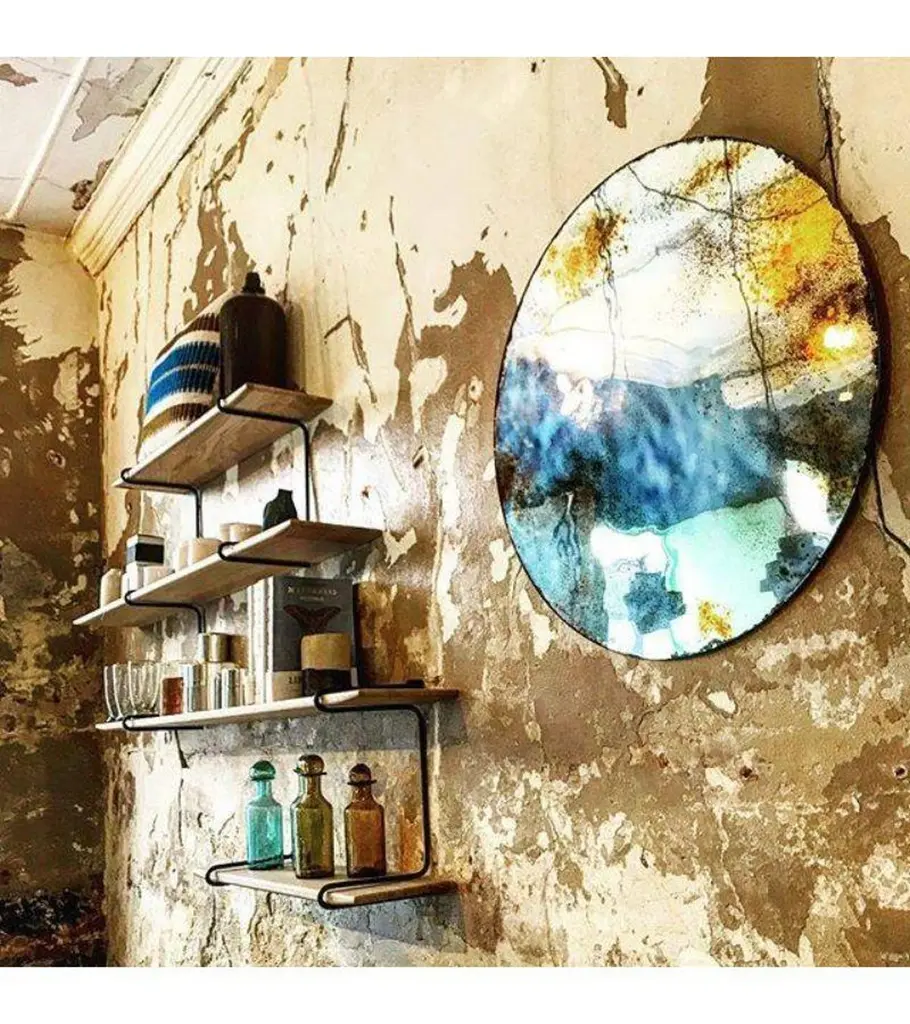 Extra large alice mirror by Slow Design Dimensions: Diameter 120 cm Materials: Glass. gold/ grey/ blue/ moss green /MD on back side oxidation effect on the clear mirror.Technique: Grisaille.Available in gold/moss green/blue/black. Also available in the size large, medium, and small.Made with the traditional technique of grisaille used for sacred art, this round-shaped or square mirror with colored effects is handmade and available in various colors, such as grey/brown and gold/yellow, and in various grades of intensity. Each piece is unique and can also be realized upon request and in different sizes. Whether it’s a darker mirror or a square mirror with a colored frame and golden effects, the Alice mirror offers infinite variations and possibilities for reflection.Slow Design is an Italian based company, dedicated to Iconic and poetic collection re-invented objectsbetween nostalgia and modernity.