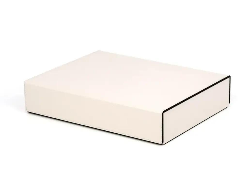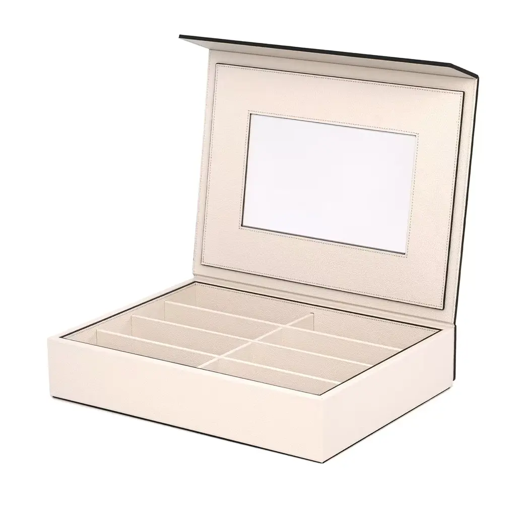 Eyeglasses is a glasses box that has a wood base and enough space to store up to eight pairs of glasses. Completely covered with calfskin leather includes an integrated mirror on its lid and a magnetic closure.