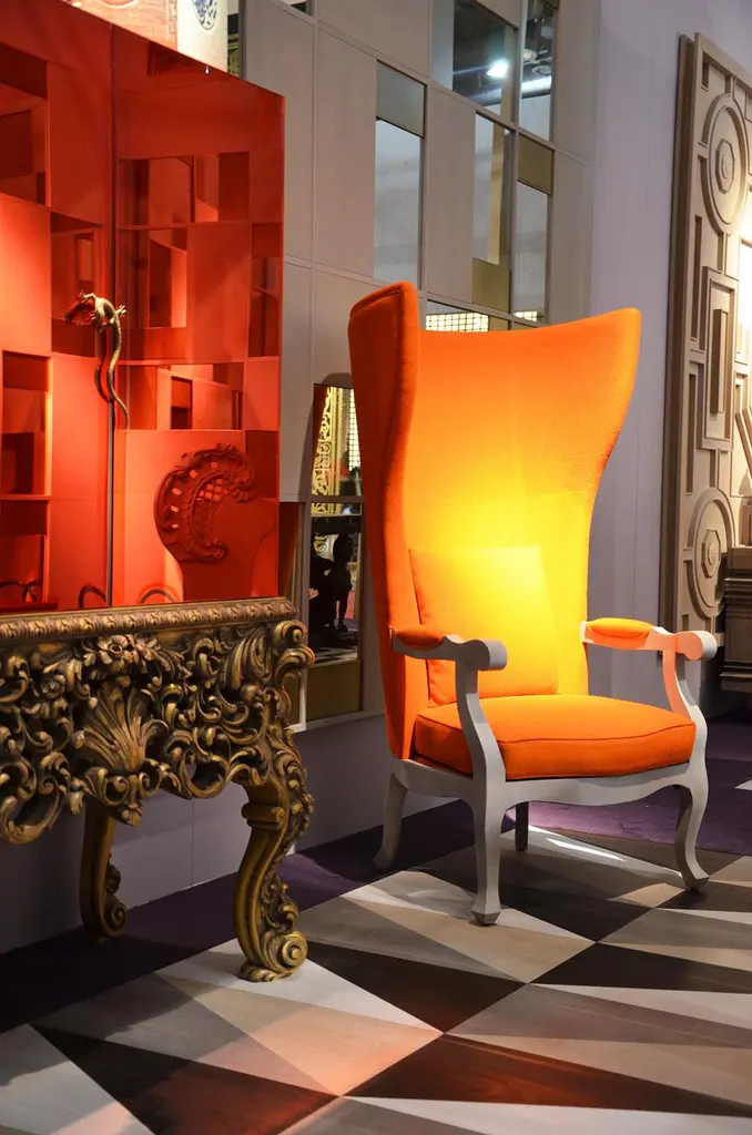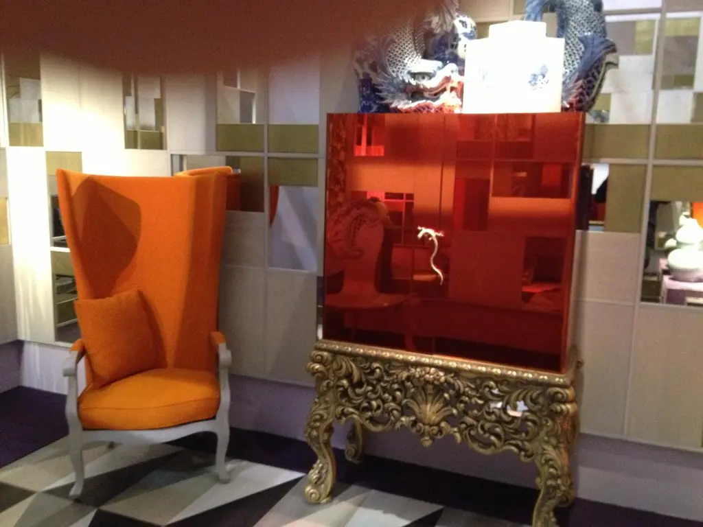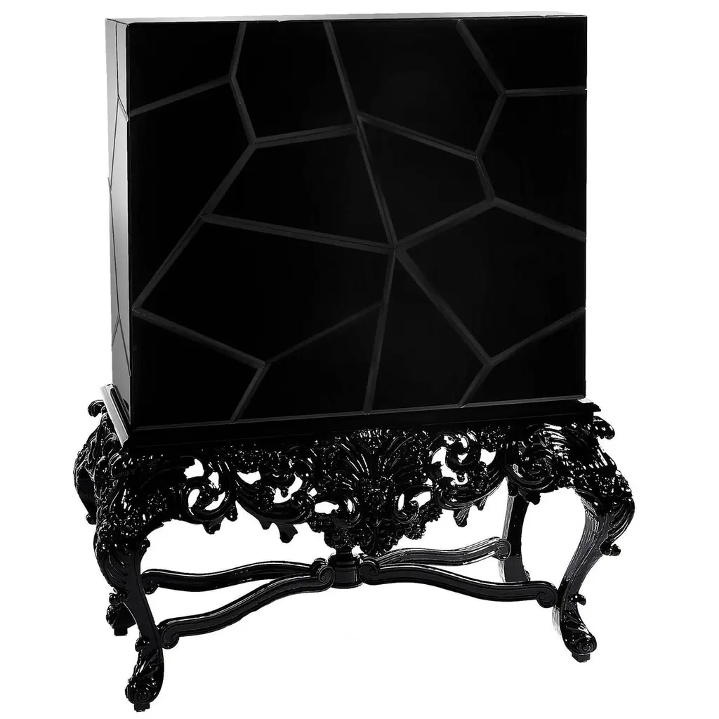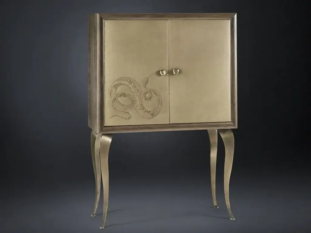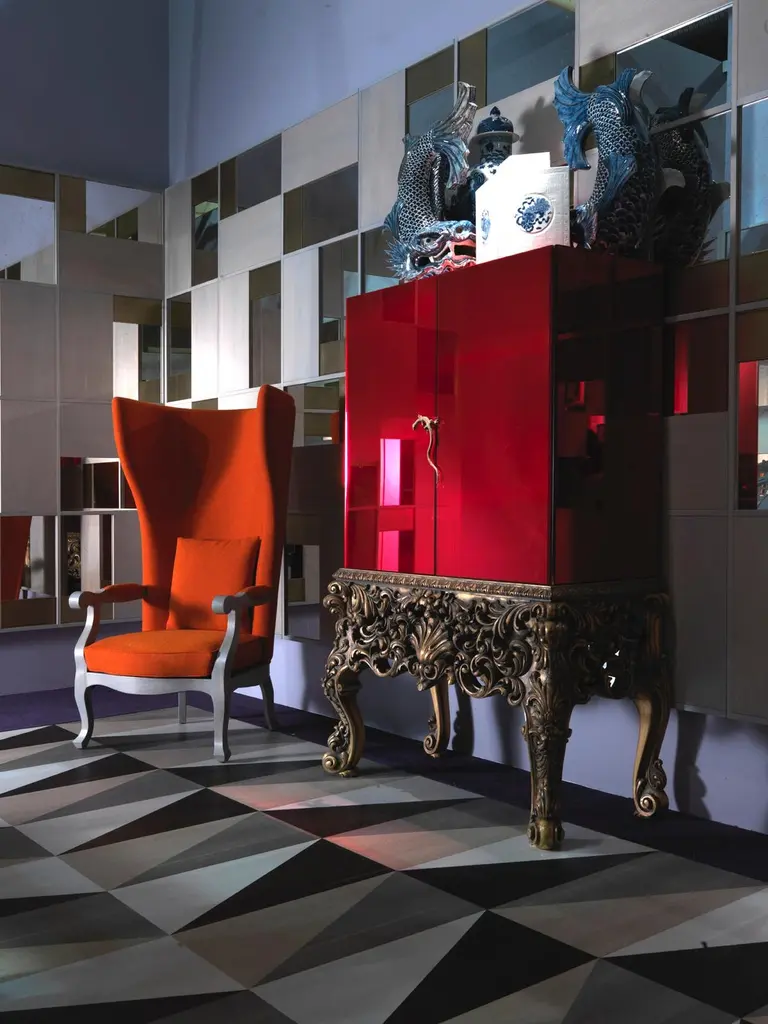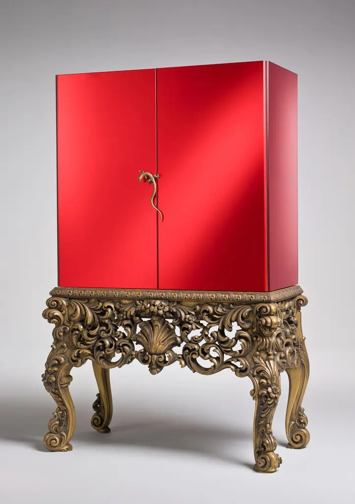 F1 Buffet is composed of a hand-carved base finished with aged gold leaf.The floral decorations, the curls and shells immediately recall the Baroque style, but the color of the upper unity is juxtaposed to the grandiosity of these wooden lines. Then, an eccentric anthropomorphic handle in brass rests recalling a gecko. When this magical chest is opened, it is composed of shelves made of black glass while the interior of its doors and the back is RAL2002 lacquered.Outside, it is covered with orange mirror.