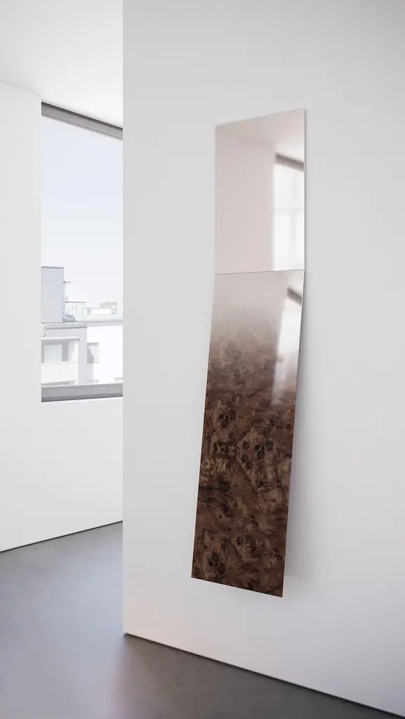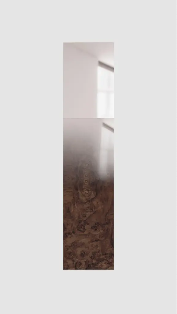 Fading wood mirror by Formaminima. Limited edition. Dimensions: 14 x 35 x H 157.5 cm. Materials: Walnut briarwood blend with grey hand-ground crystal layering, fading mirror finish applied by hand. Flush wall metal bracket. The Mirror/Zero Collection reinterprets and reframes the concept of a wall mirror, emphasising its décor statement function within the Interior. As a result, the cutting-edge aesthetic of this new series plays with the fading reflections of the subject, creating a trompe-l’oeil effect and indissolubly blending the objective and subjective dimensions through extra-thin material layers. The careful selection of materials: hand-ground crystal, walnut briarwood, solid marbles and brass, features a mirror gradient, thanks to an innovative experimental craft technique of surfaces layering. Furthermore, together with a frameless and sleek appearance, a faint tilt provides a further twist in the subject perception, increasing the engagement and highlighting the thinness and lightness of this unexpected two-dimensional composition.